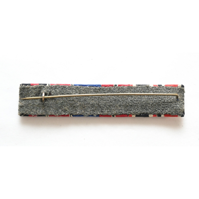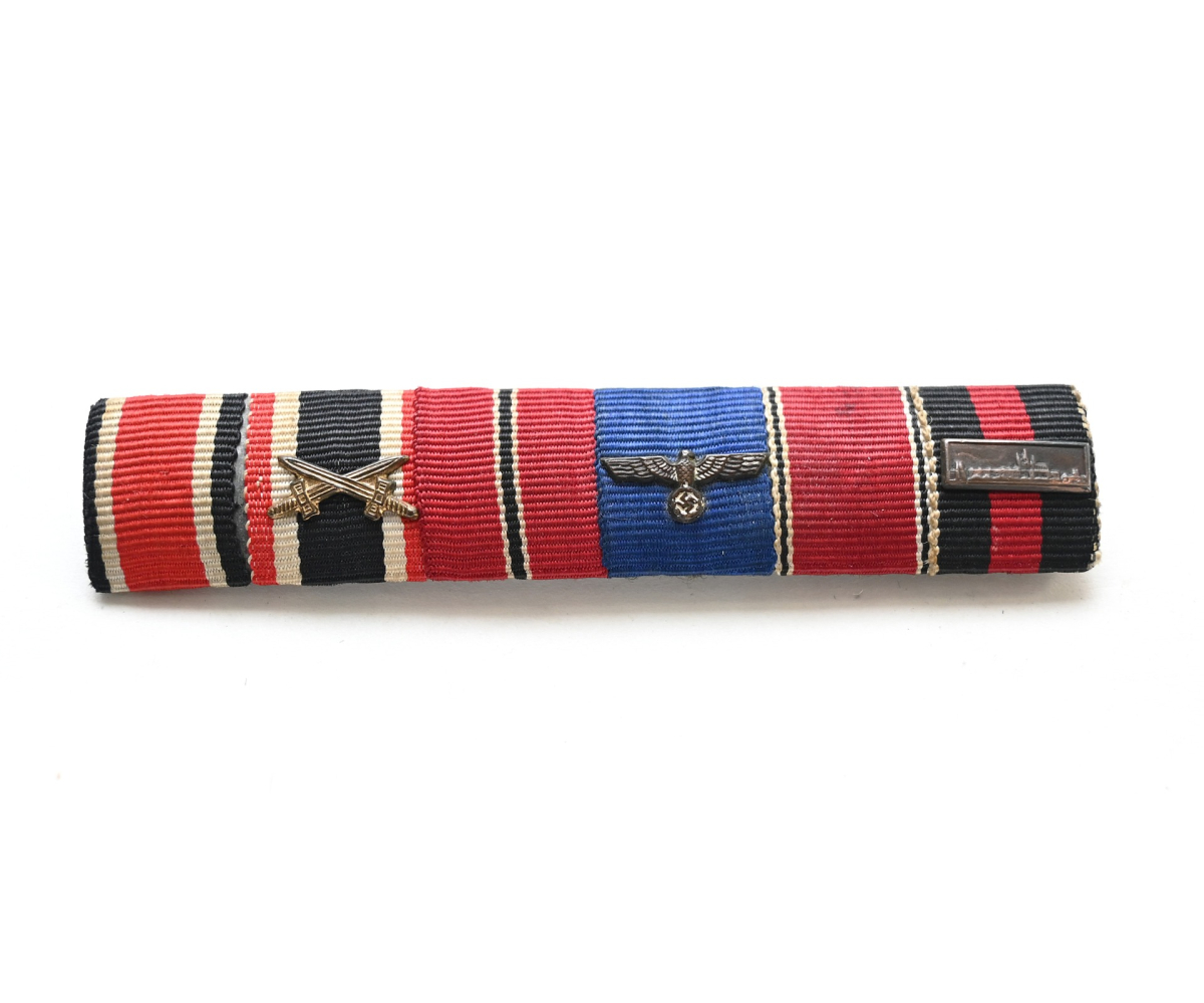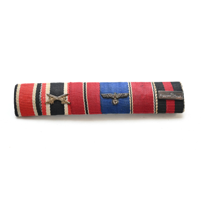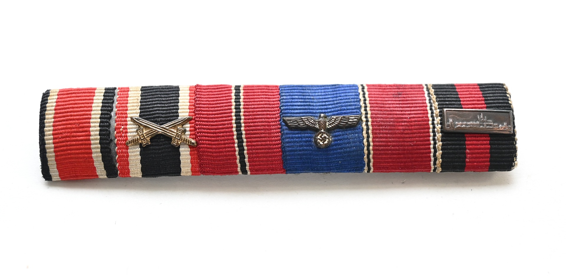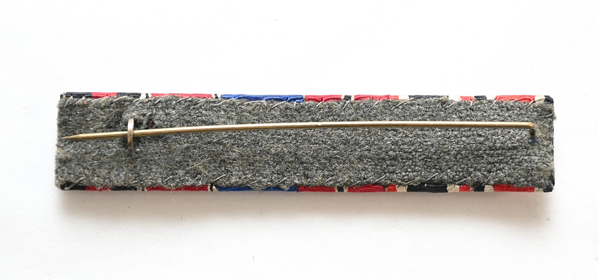 The ribbon bar shows overall normal signs of wear. It's complete with working needle on the back. It contains the ribbons of the following medals/awards; Eisernes Kreuz 2.Klasse, Kriegsverdienstkreuz 2.Klasse mit Schwertern, Ostmedaille, 8 Jahre Treuedienst, 13.Marz 1938 Medal and 1.October 1938 anschluss mit Prager Burg calsp.