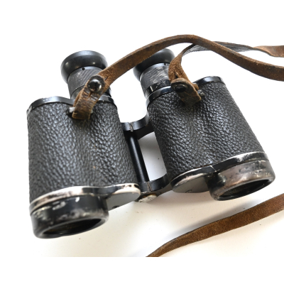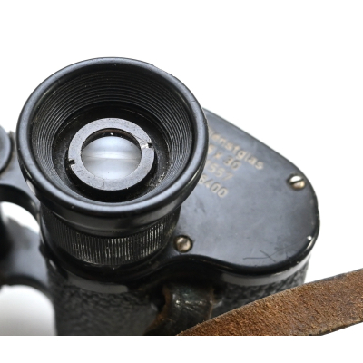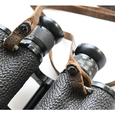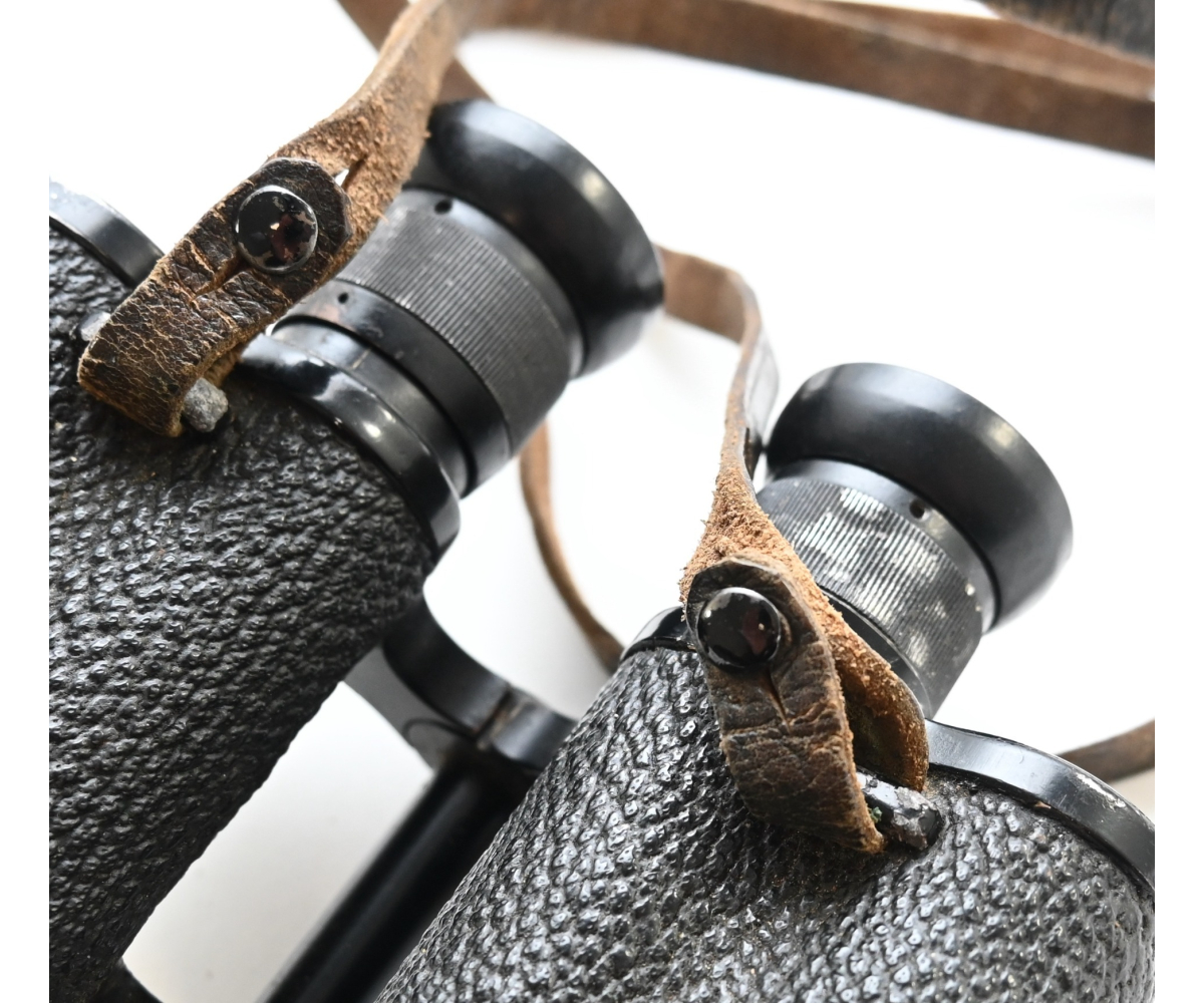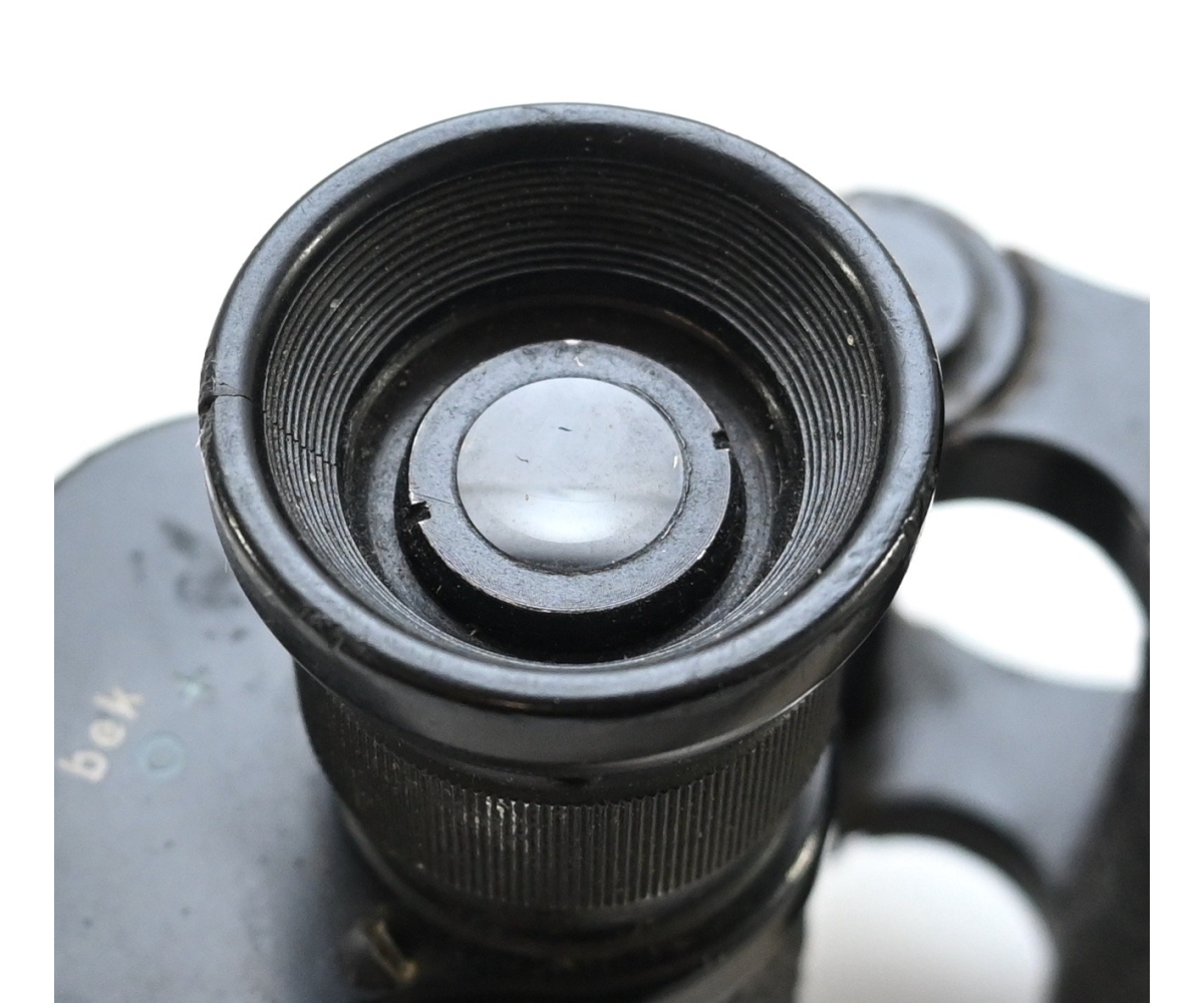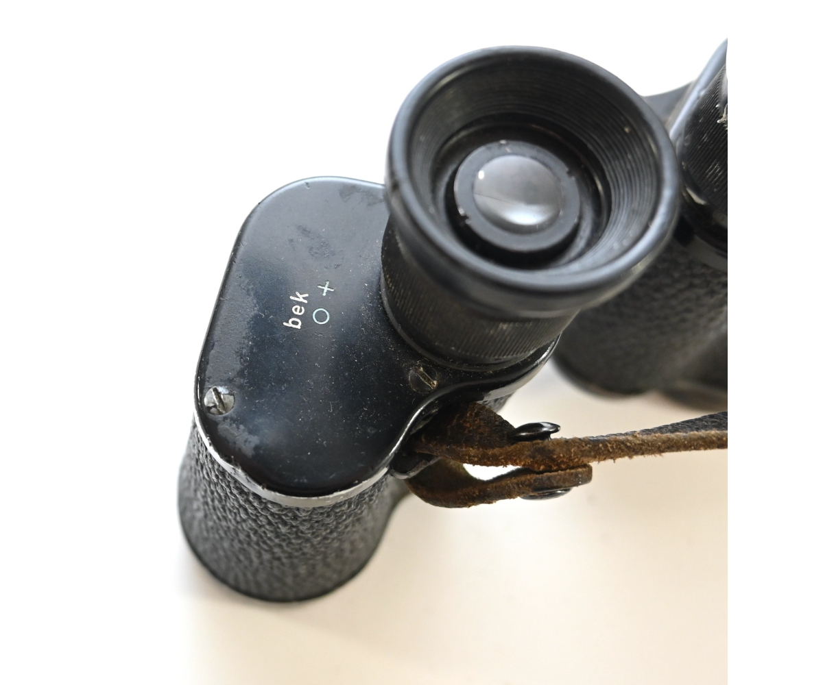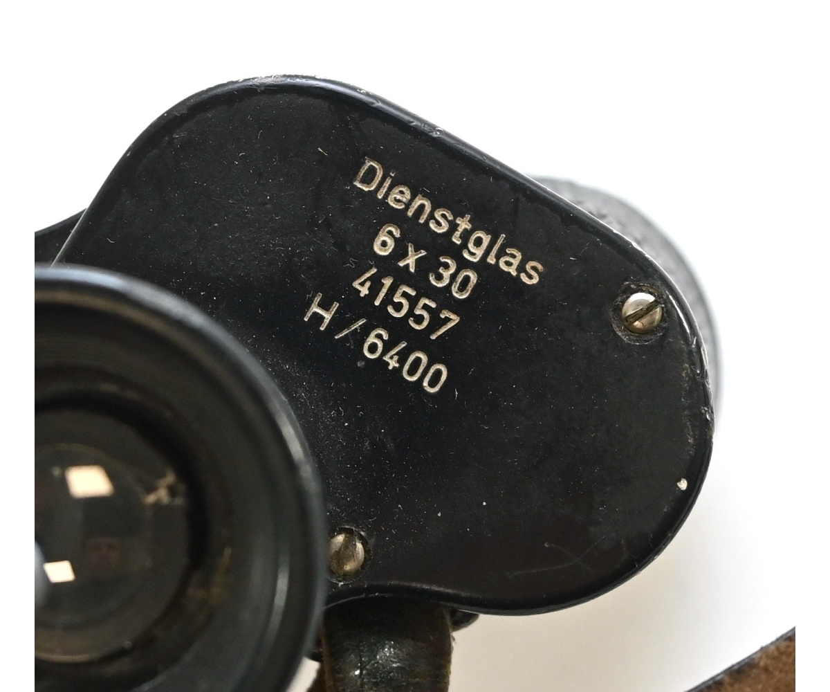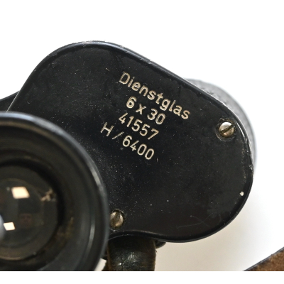 The binoculars show overall normal signs of wear. Both lenses are in working order which means you can focus them. The visibilty is good (not perfect, but good!). The right side is marked with 'Dienstglas 6x30', serialnumber '41557' and 'H/6400'. The left side is marked with 3-letter code 'bek' which indicates that the maker was 'Hensoldt'. The Dienstglas comes with a leather neck strap, which is supple and in good condition.