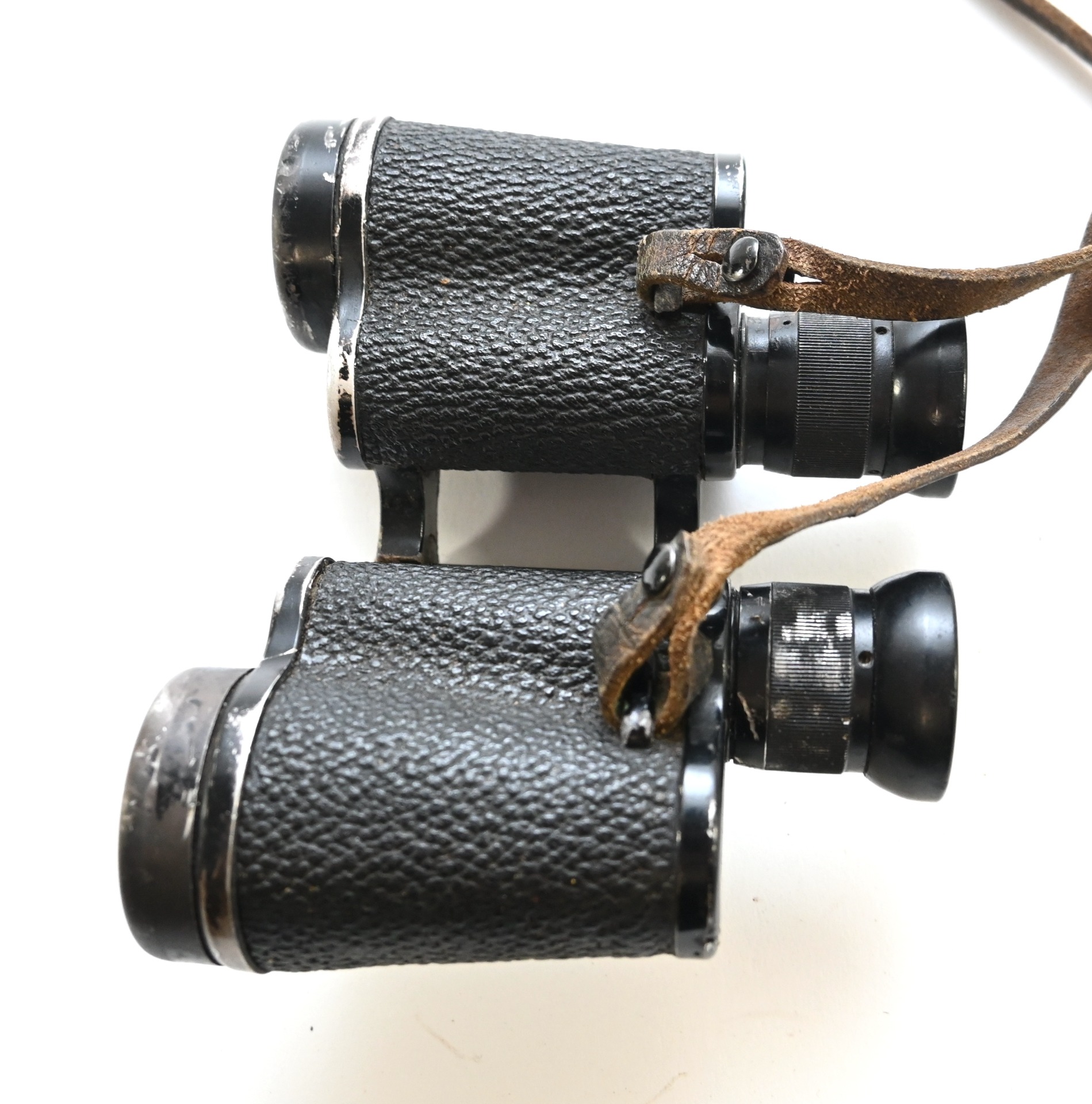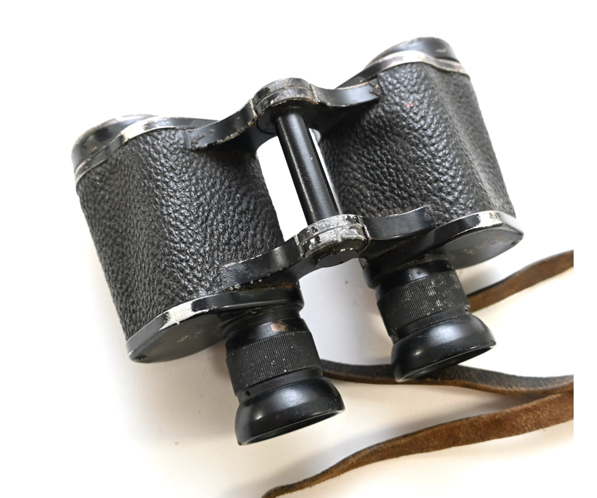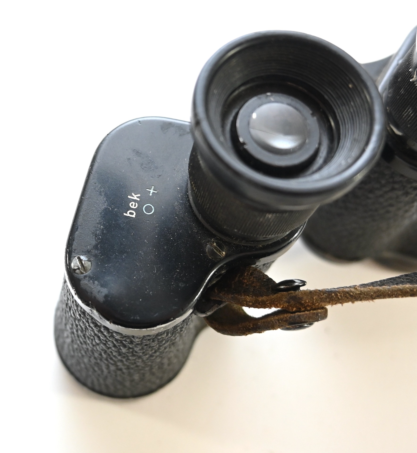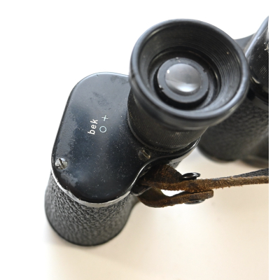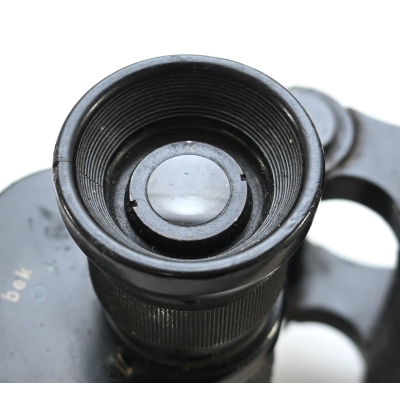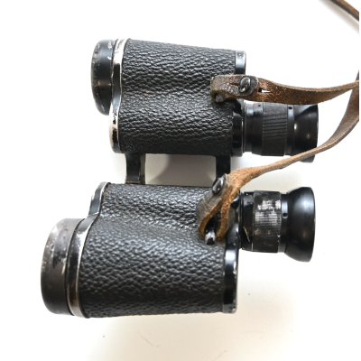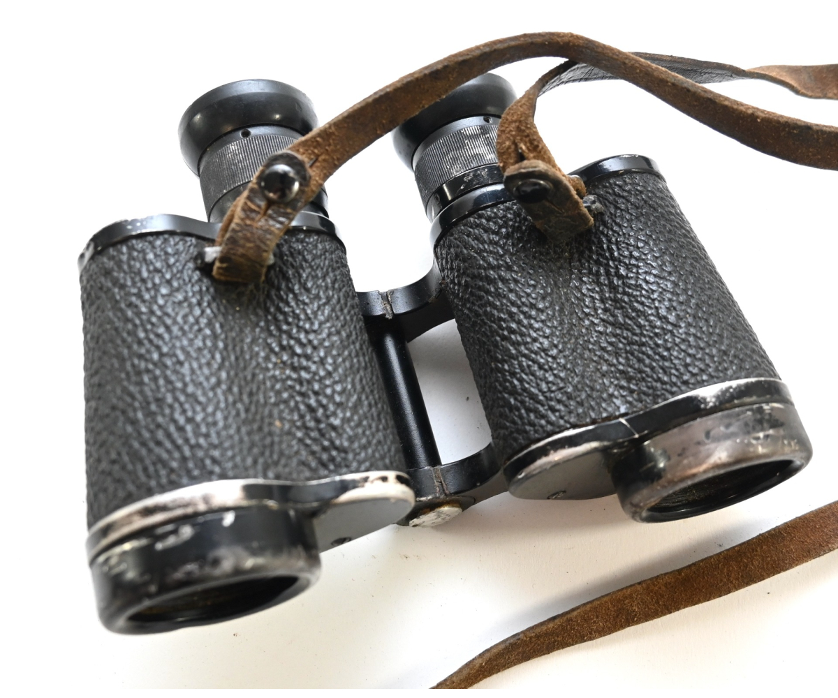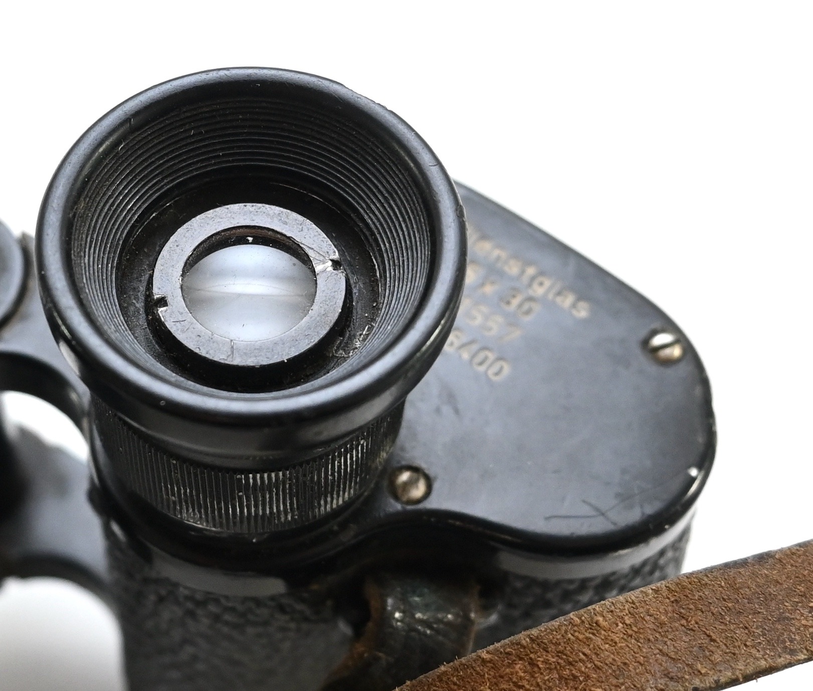 The binoculars show overall normal signs of wear. Both lenses are in working order which means you can focus them. The visibilty is good (not perfect, but good!). The right side is marked with 'Dienstglas 6x30', serialnumber '41557' and 'H/6400'. The left side is marked with 3-letter code 'bek' which indicates that the maker was 'Hensoldt'. The Dienstglas comes with a leather neck strap, which is supple and in good condition.