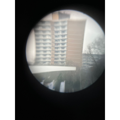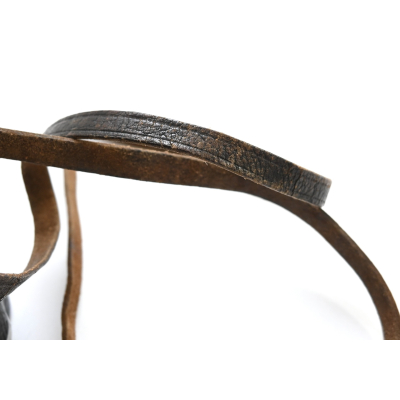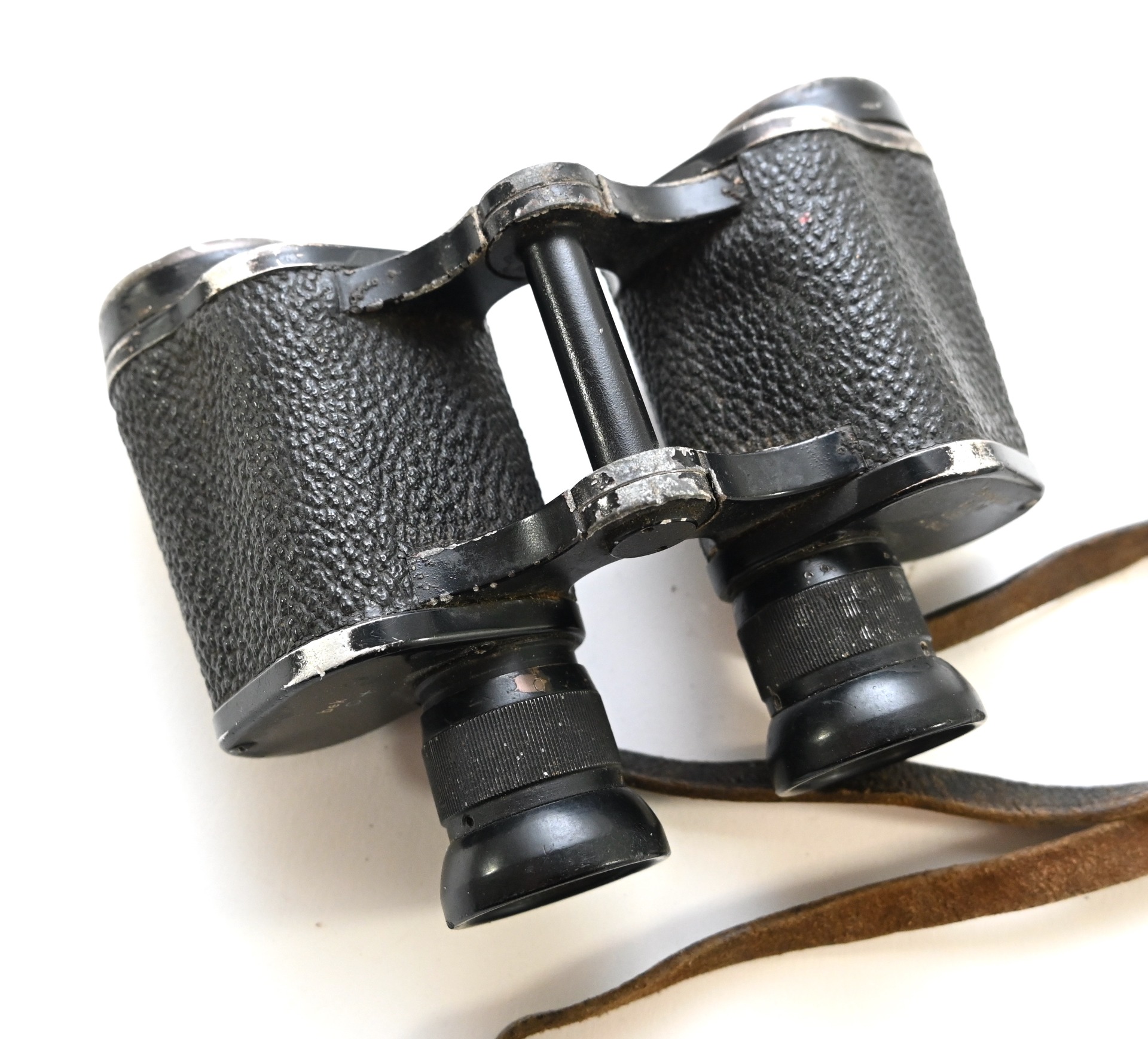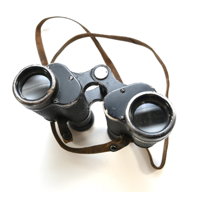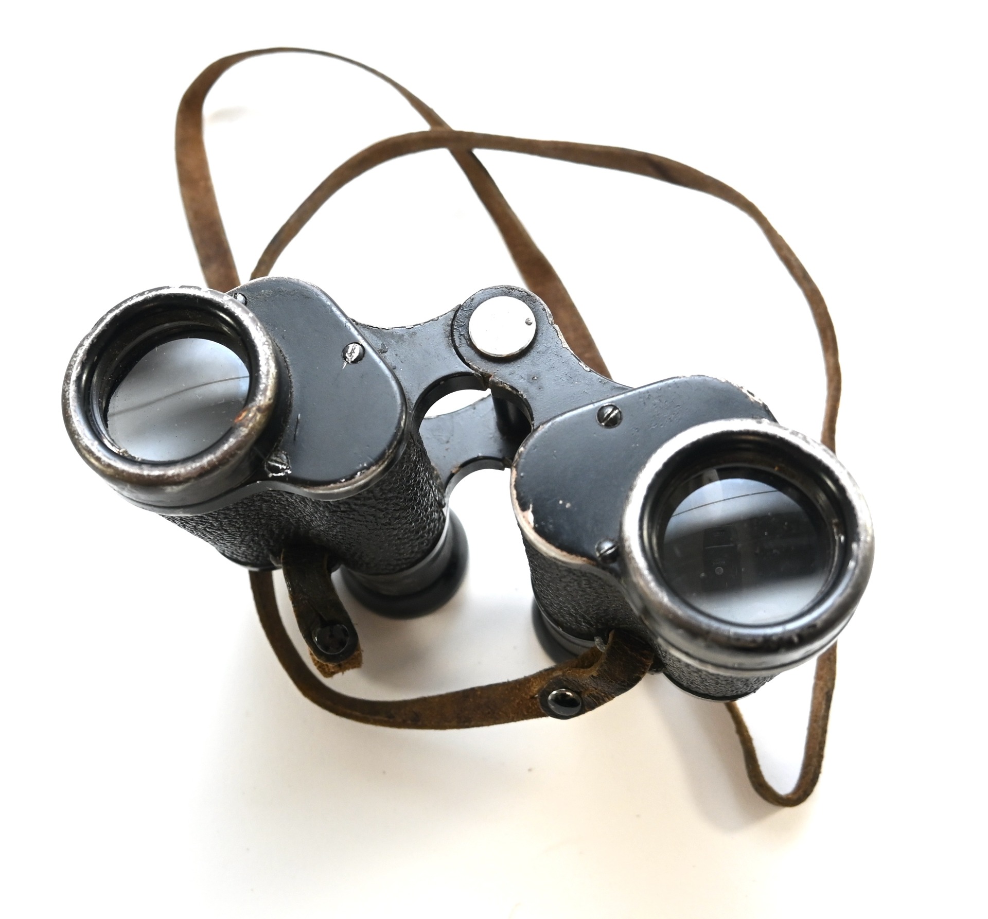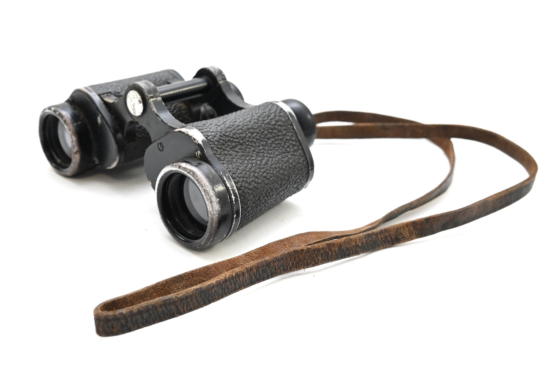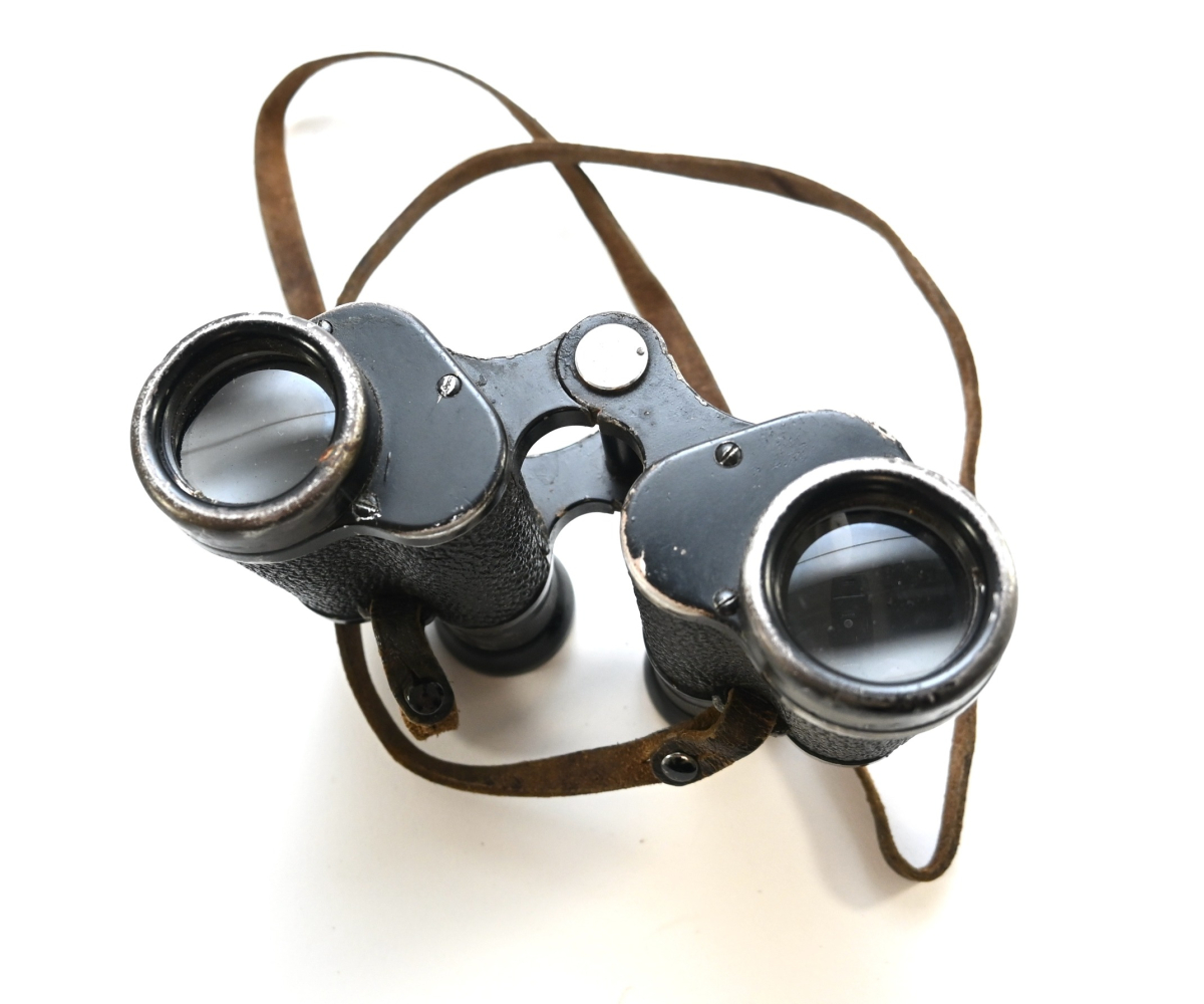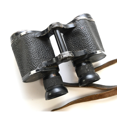 The binoculars show overall normal signs of wear. Both lenses are in working order which means you can focus them. The visibilty is good (not perfect, but good!). The right side is marked with 'Dienstglas 6x30', serialnumber '41557' and 'H/6400'. The left side is marked with 3-letter code 'bek' which indicates that the maker was 'Hensoldt'. The Dienstglas comes with a leather neck strap, which is supple and in good condition.