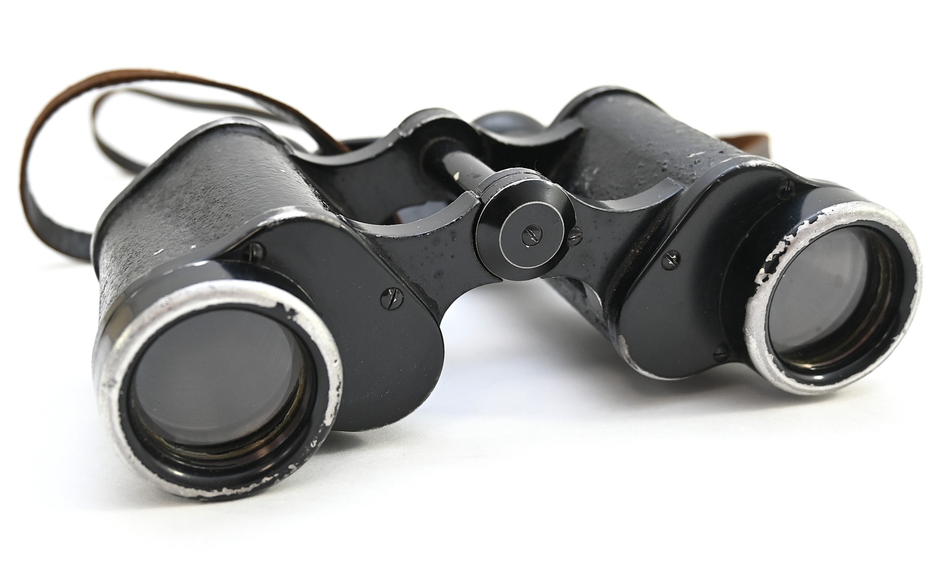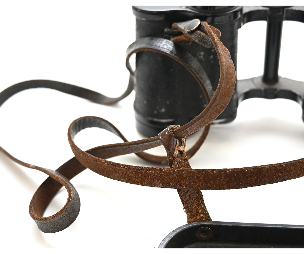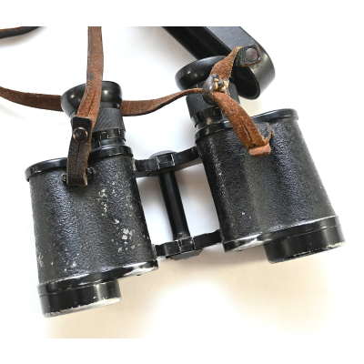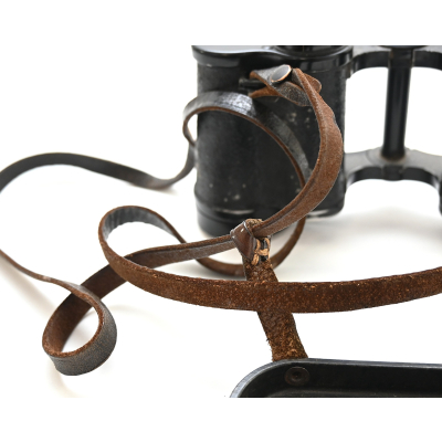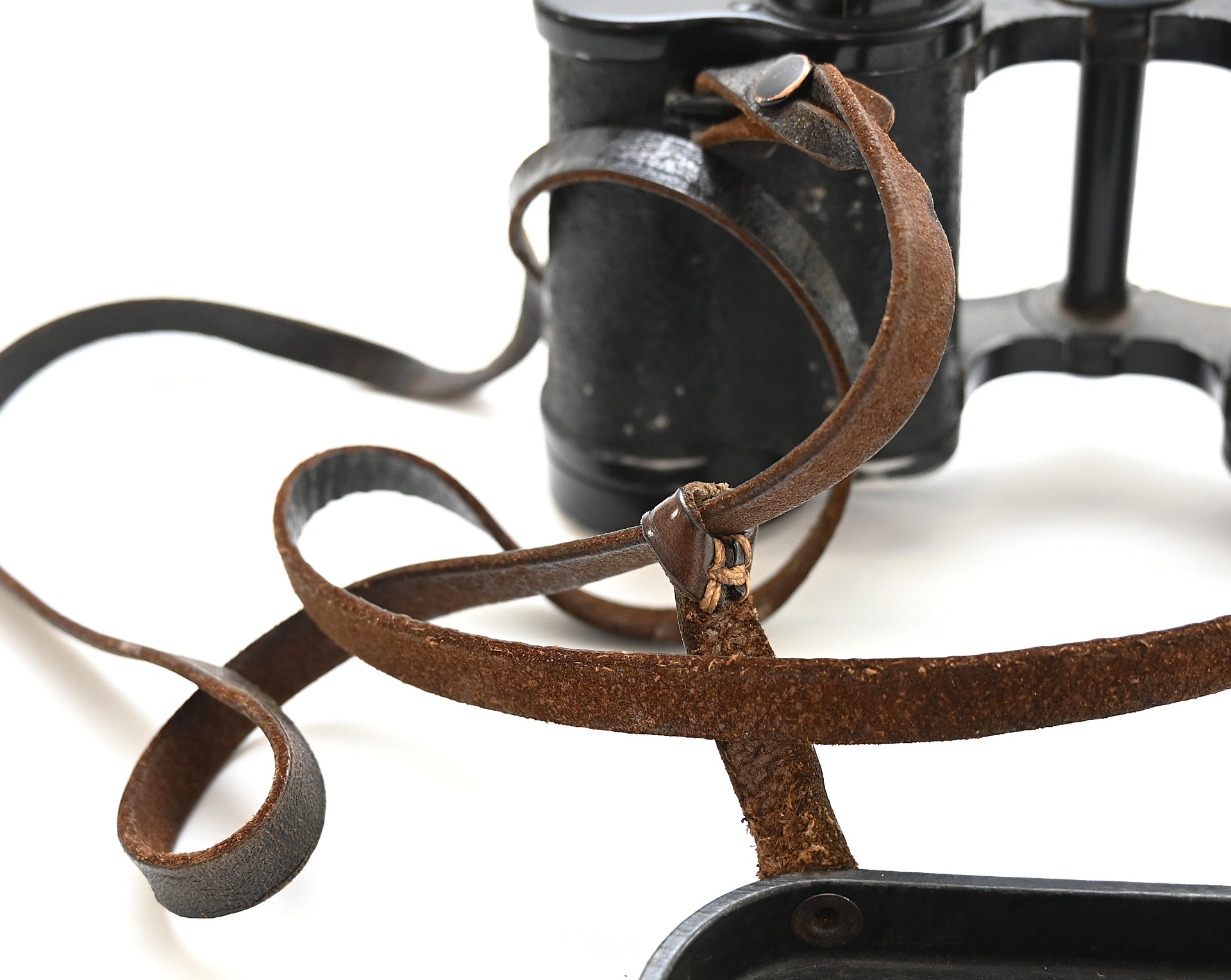 The binos comes with an original black leather strap and the brownish bakelite lens cover. The leather of the strap is supple and solid and the cover is intact.