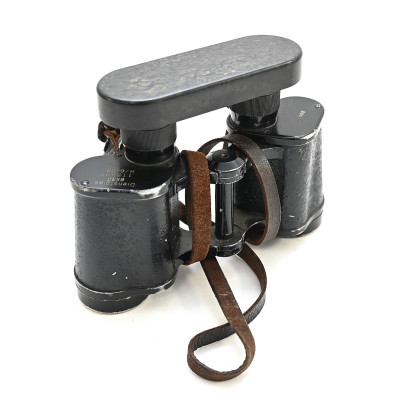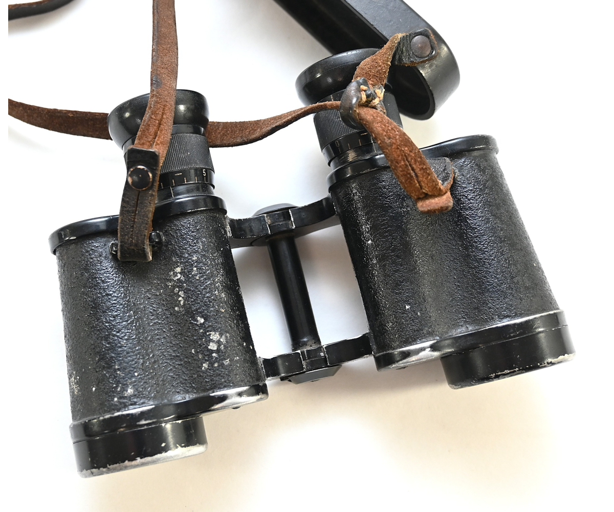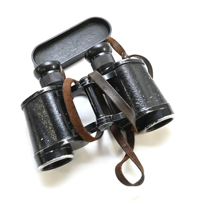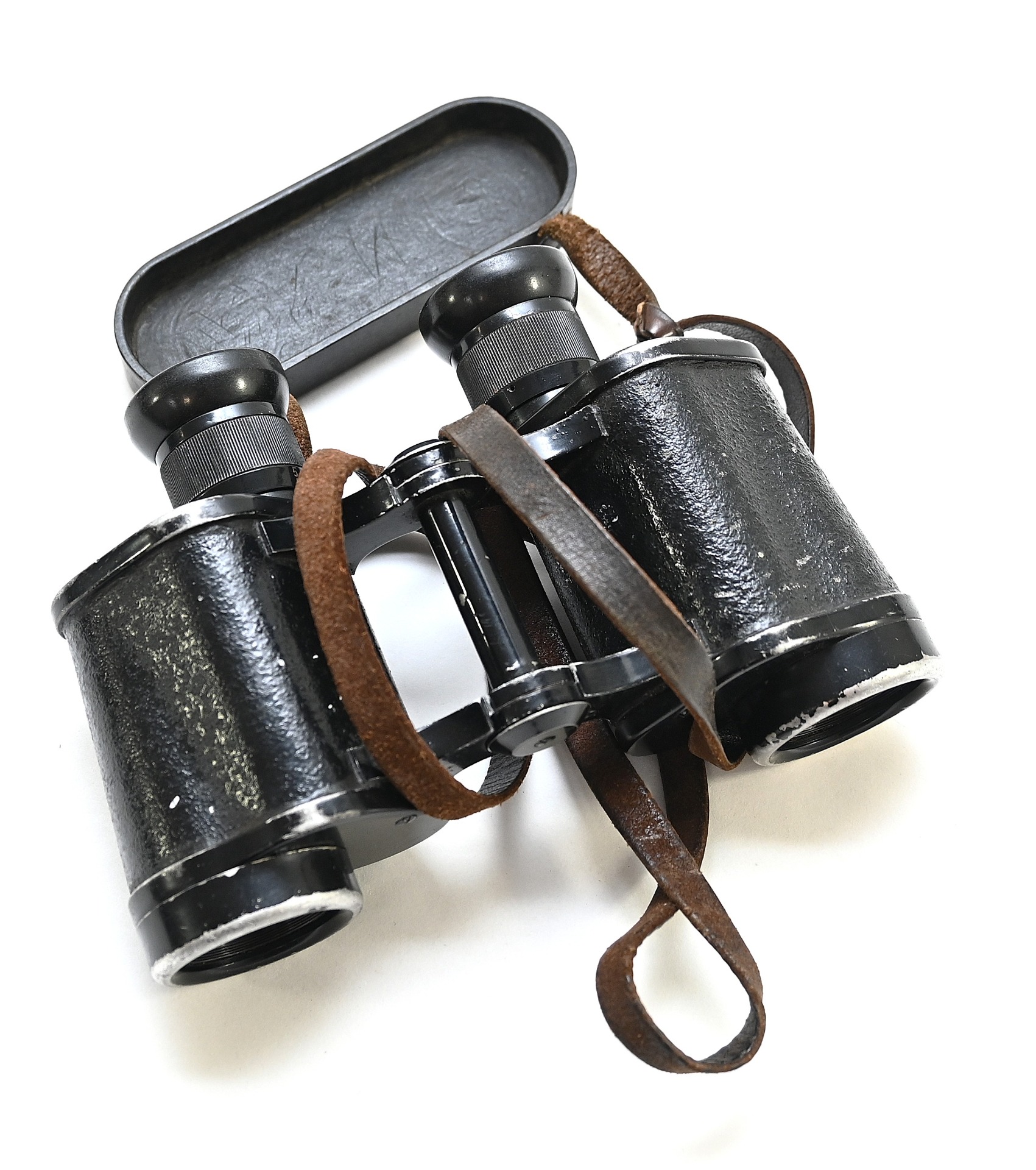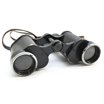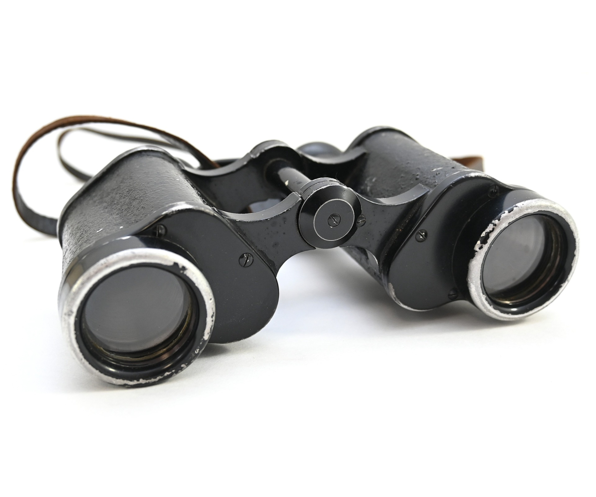 The binos comes with an original black leather strap and the brownish bakelite lens cover. The leather of the strap is supple and solid and the cover is intact.