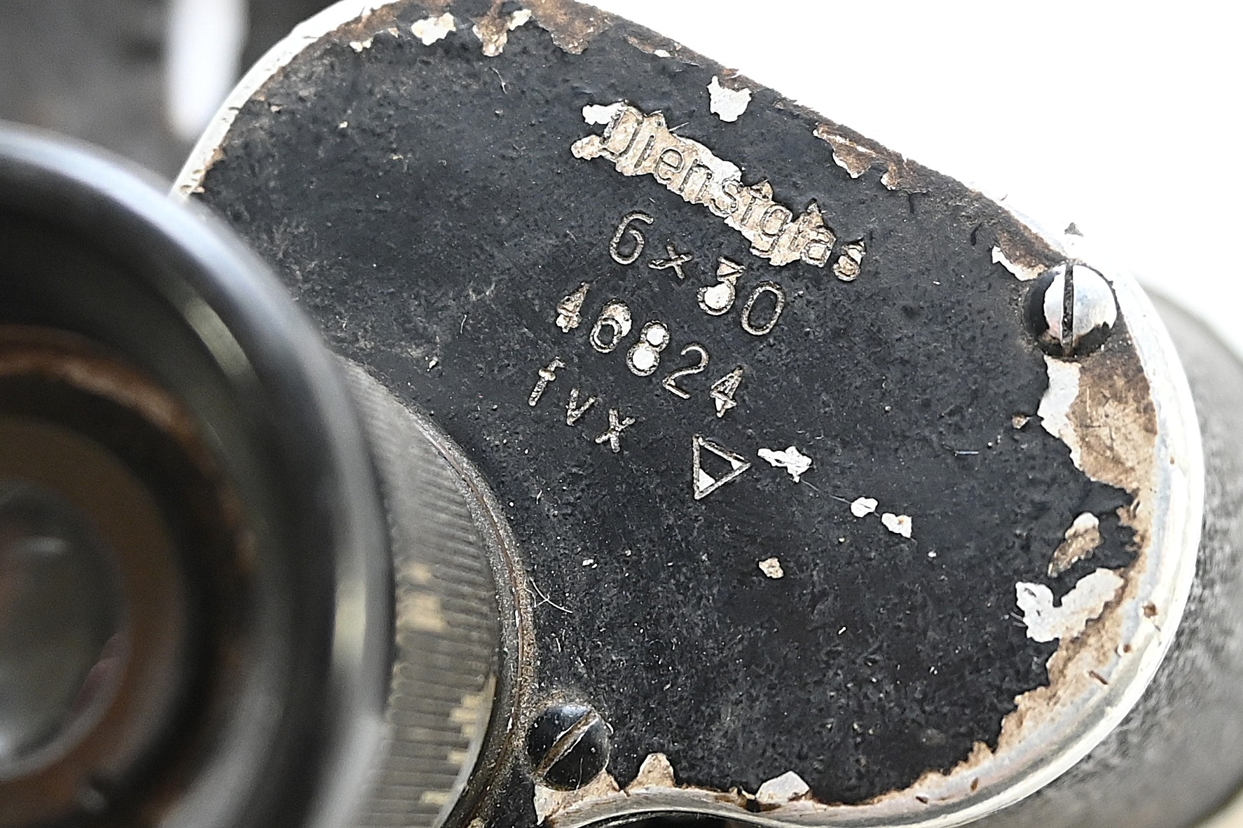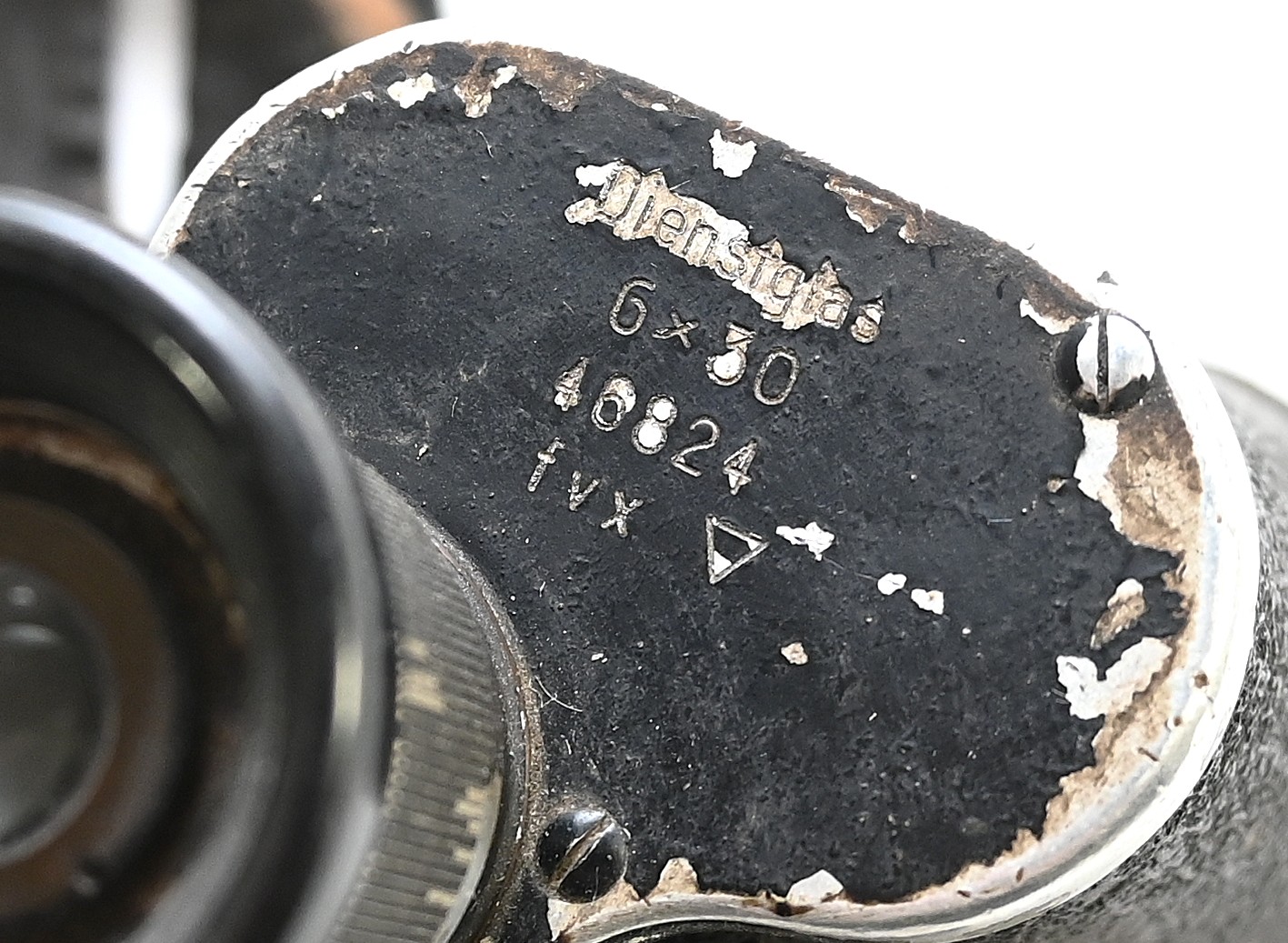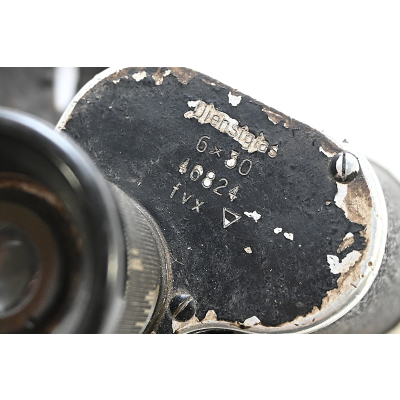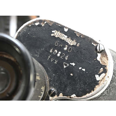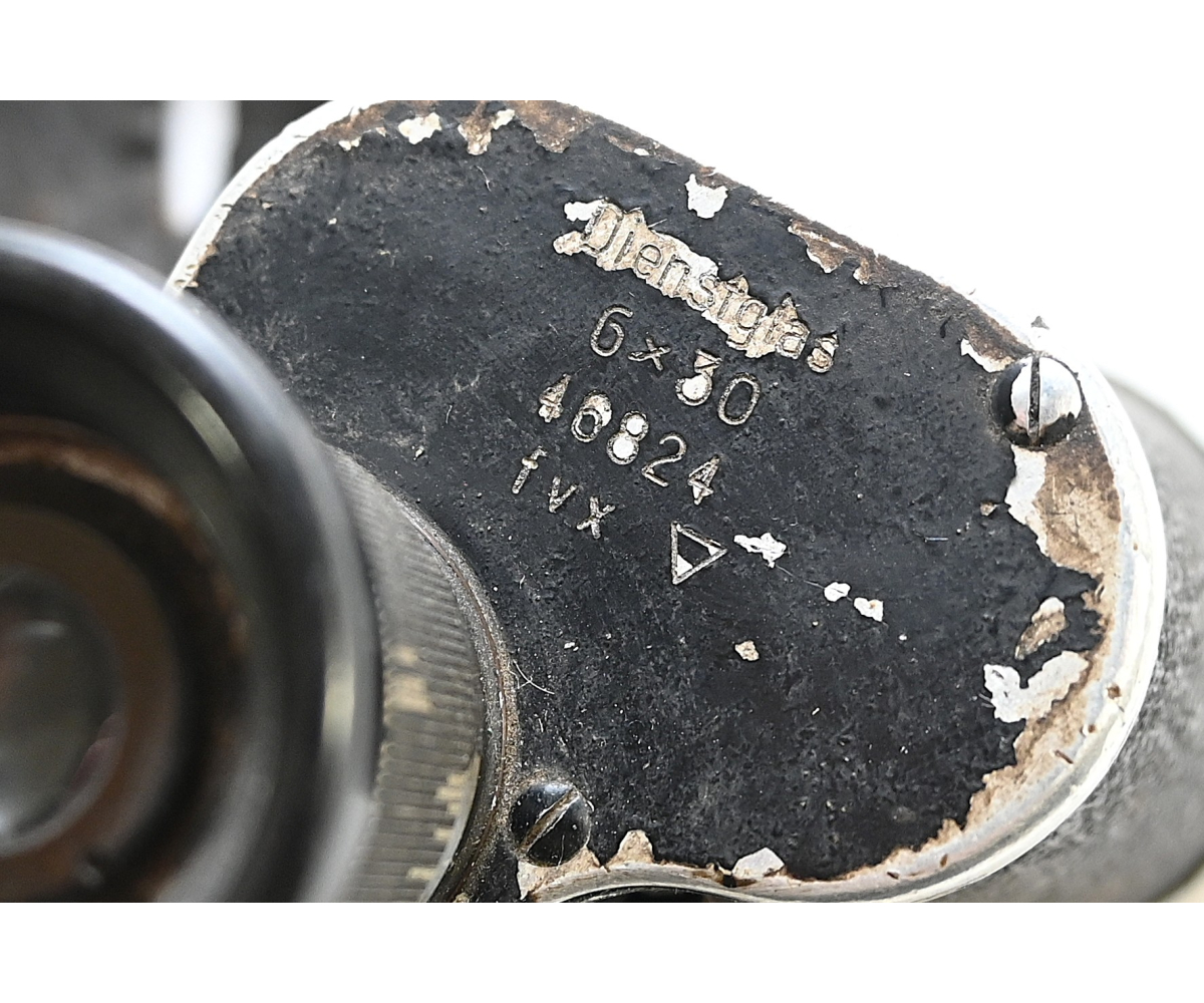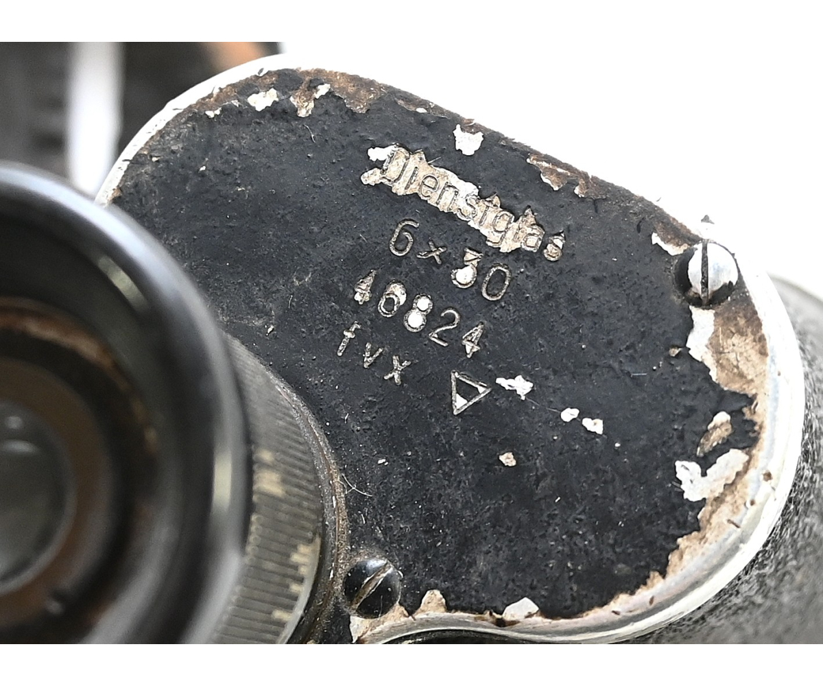 The set shows overall normal signs of wear. Both lenses are in working order, which means you can focus them. The visibility of both lenses is clear. The strichplatte in the right lens is present. The rights side is marked 'Dienstglas, 6x30, serialnumber 46824, 3-letter makers code fvx'. The code 'fvx' means it was produced by Beck und Söhne from Kassel. The left side has no markings.