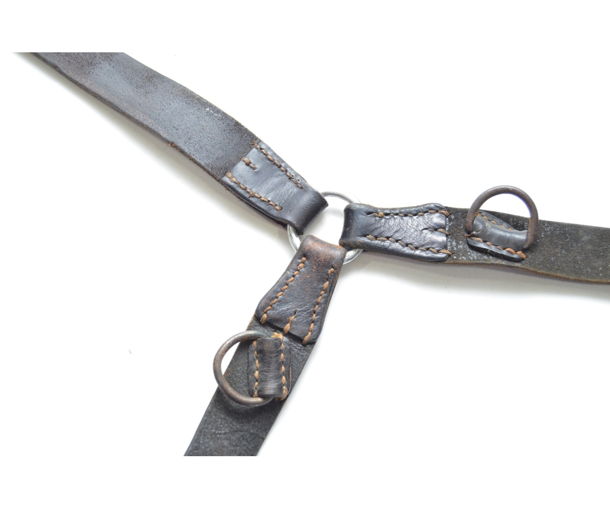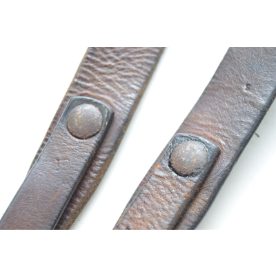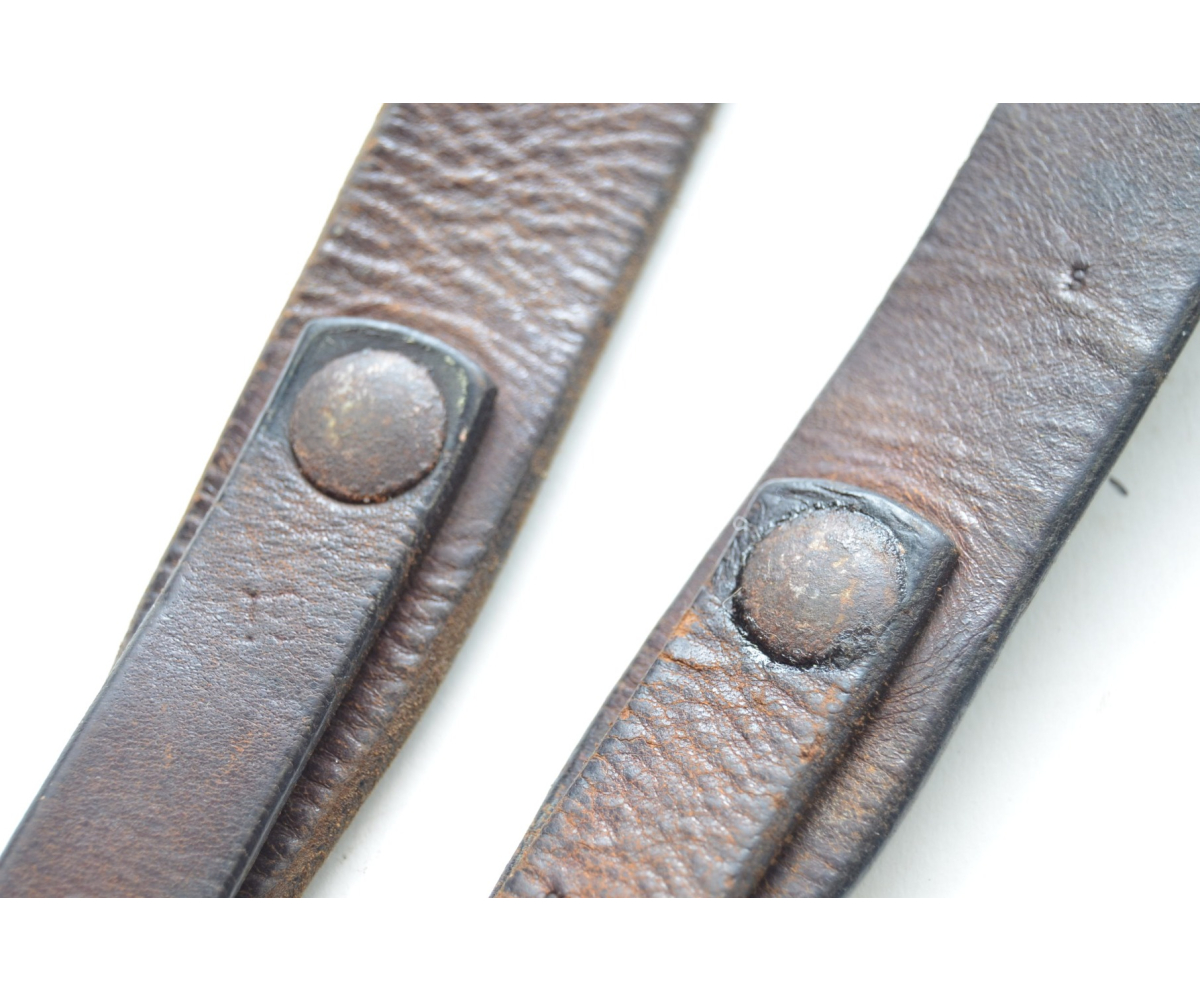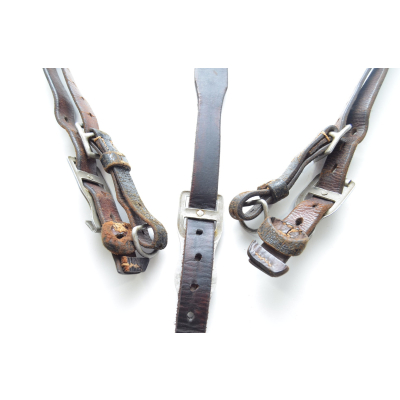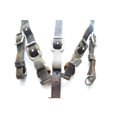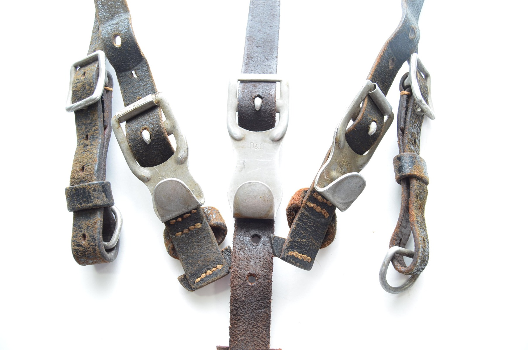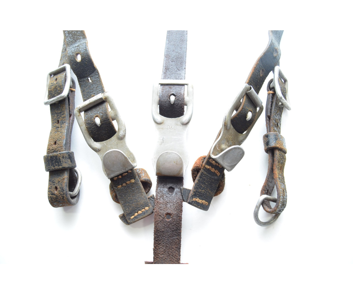 The straps shows overall normal signs of wear. The leather is supple, all parts are present and there are no damages. There ar no visible markings on the leather to be found. The aluminium hooks are marked with ''D&C''. Nice and early produced y-straps that are not easy to find.