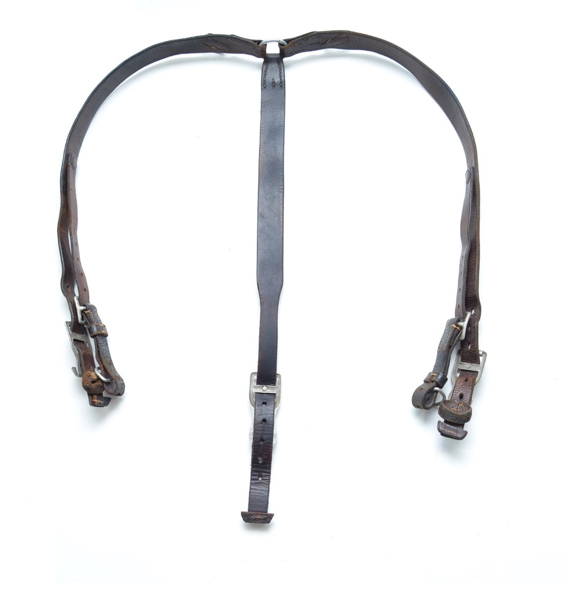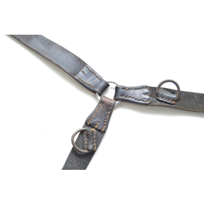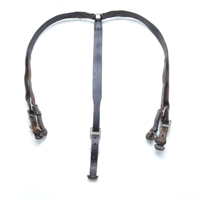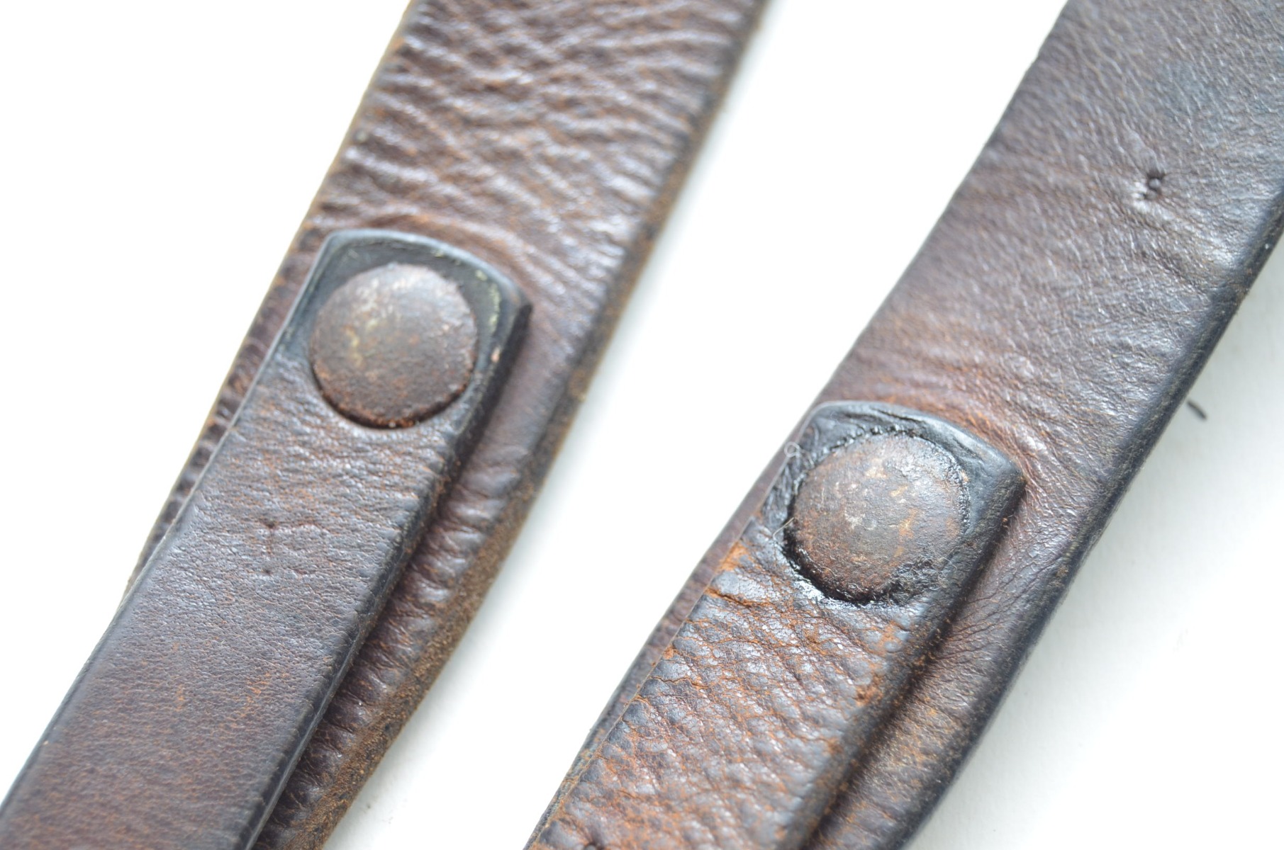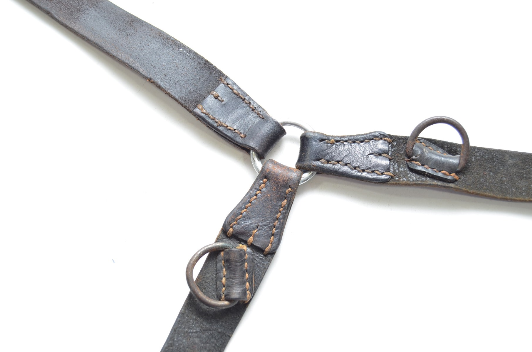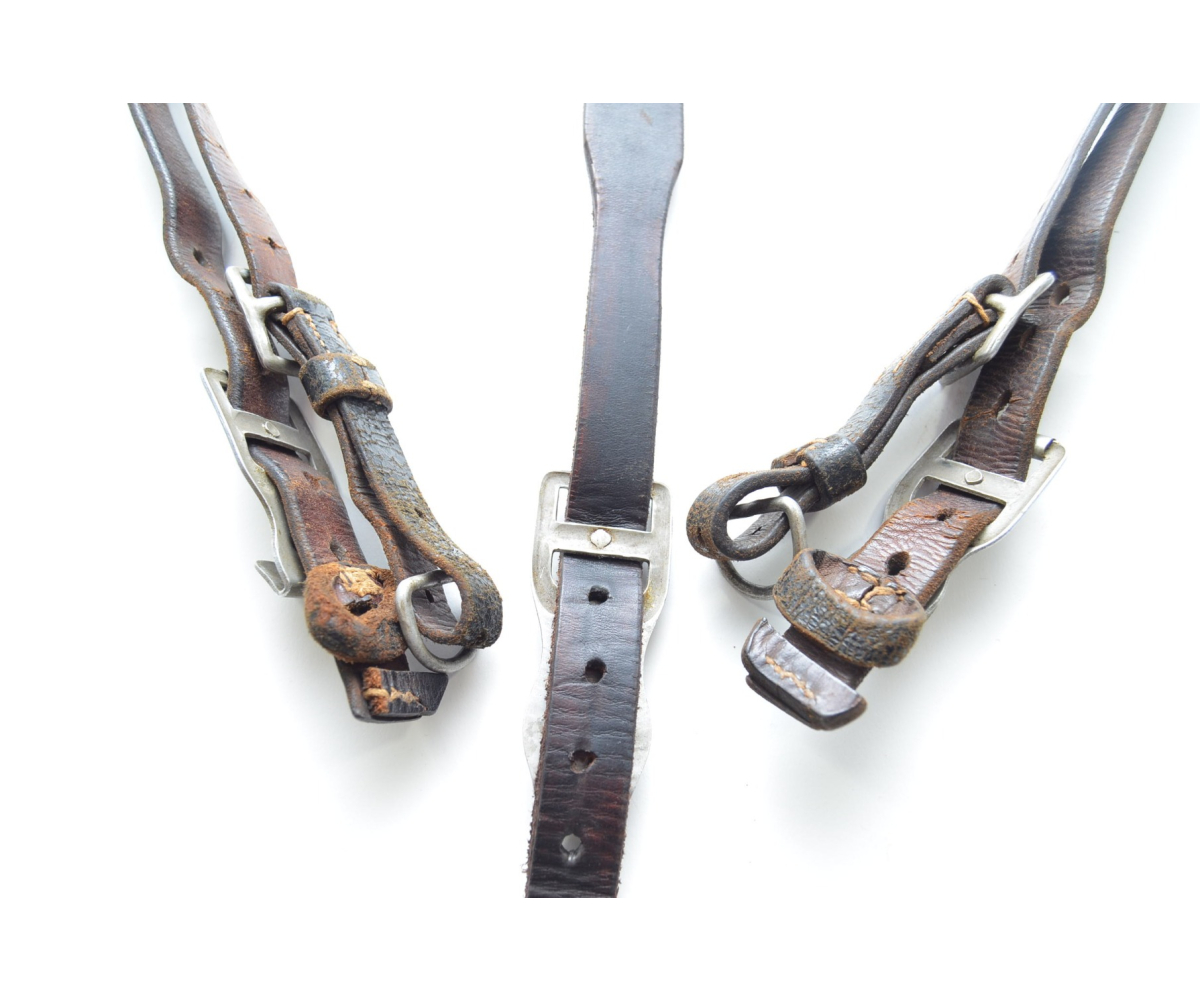 The straps shows overall normal signs of wear. The leather is supple, all parts are present and there are no damages. There ar no visible markings on the leather to be found. The aluminium hooks are marked with ''D&C''. Nice and early produced y-straps that are not easy to find.