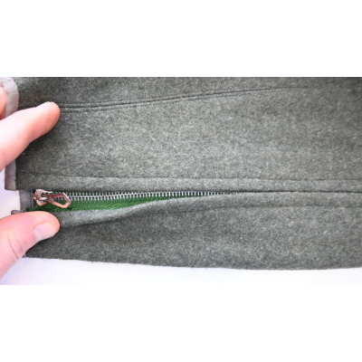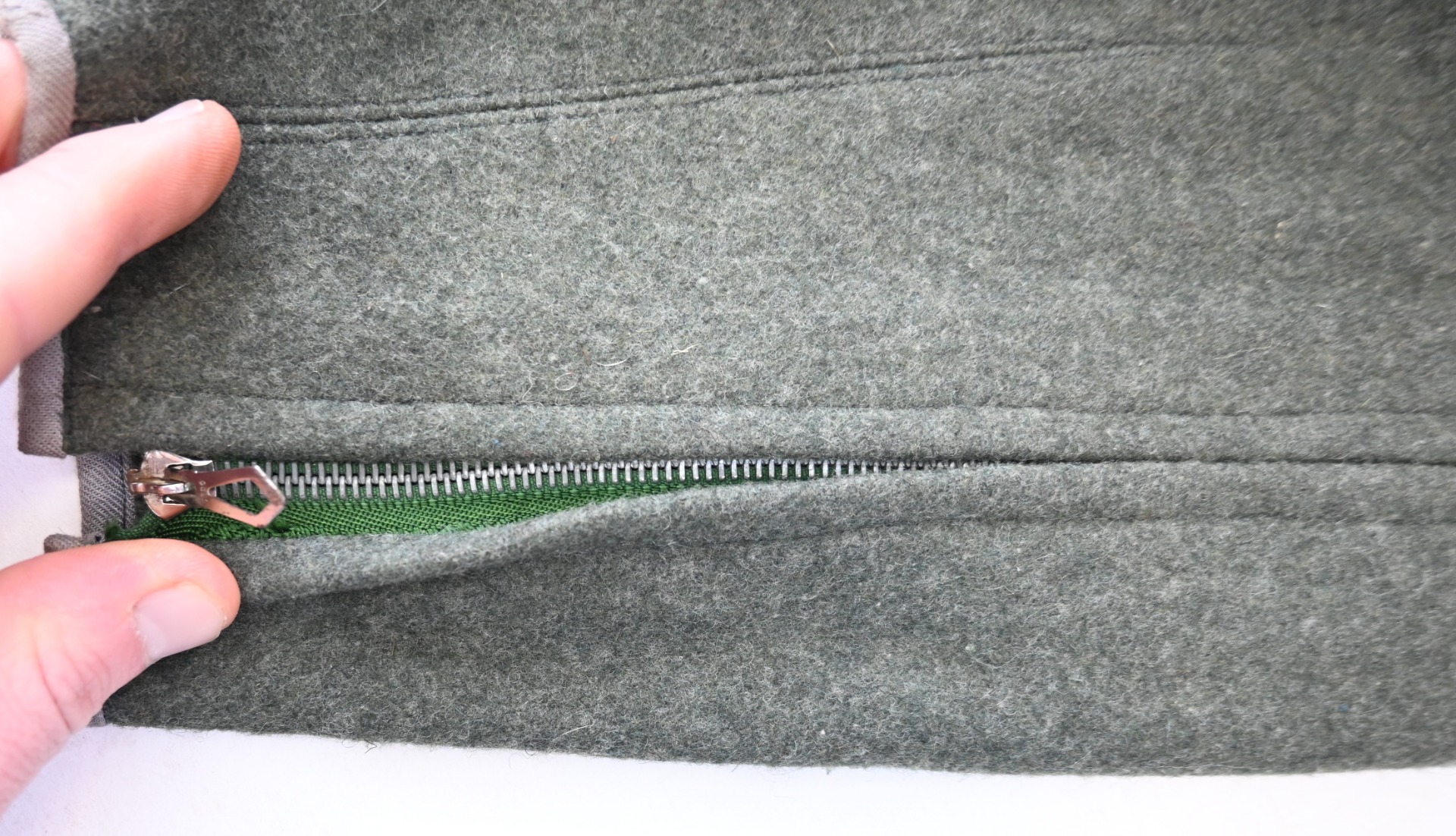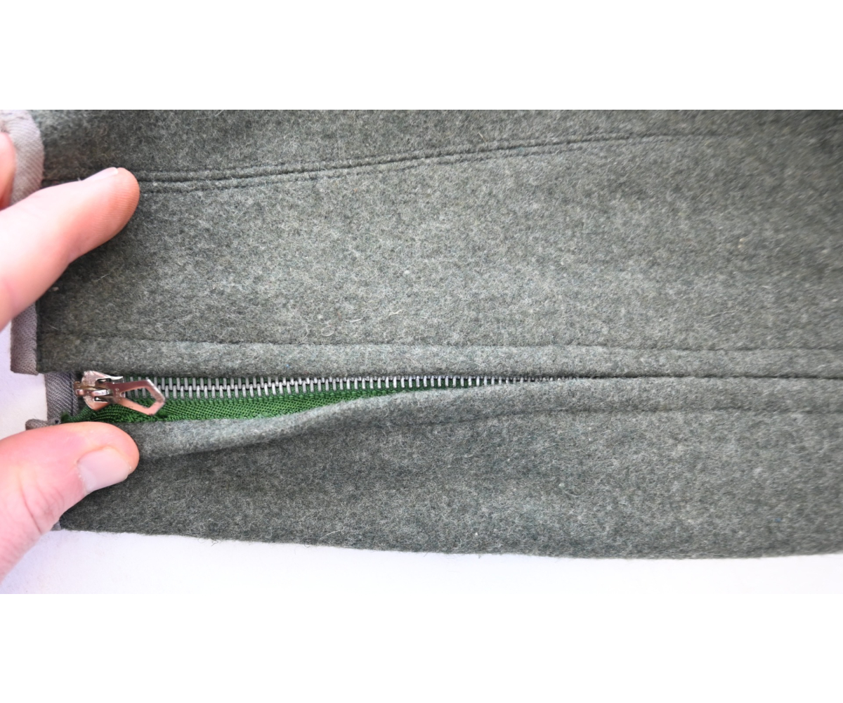 The breeches show overall normal signs of wear. Small moth hole at the right knee area. All buttons are present. The pants themselves are not visibly marked by the maker, which is not unusual since they were privately purchased. The zipper on the ankles have been replaced, but is nicely done and not visible on a mannequin with boots on.