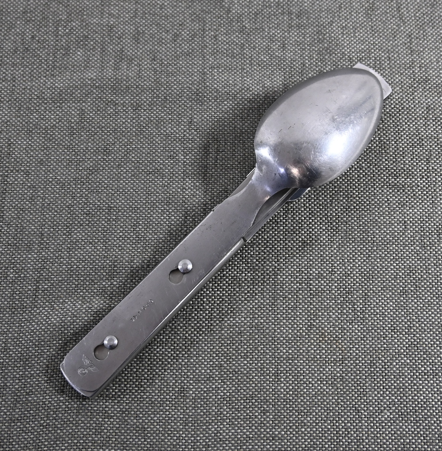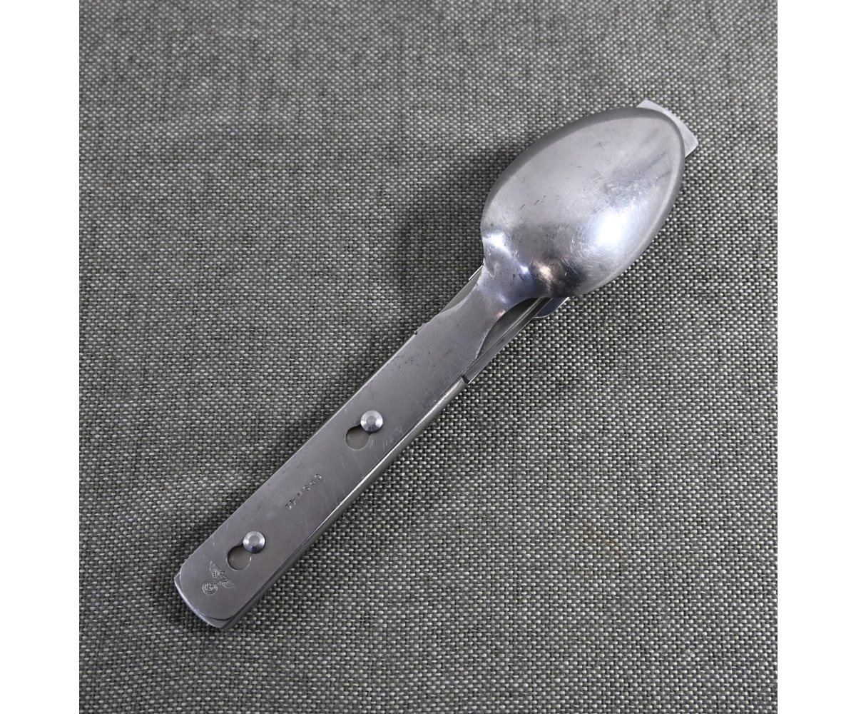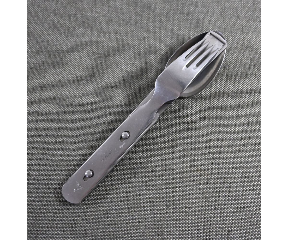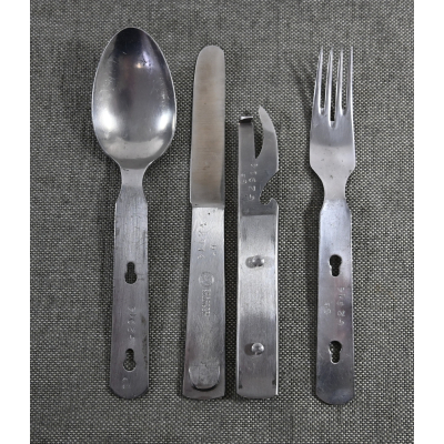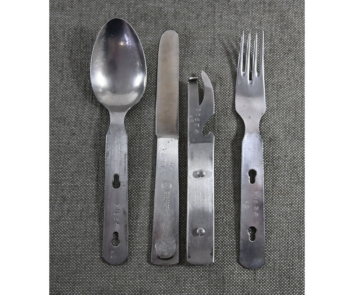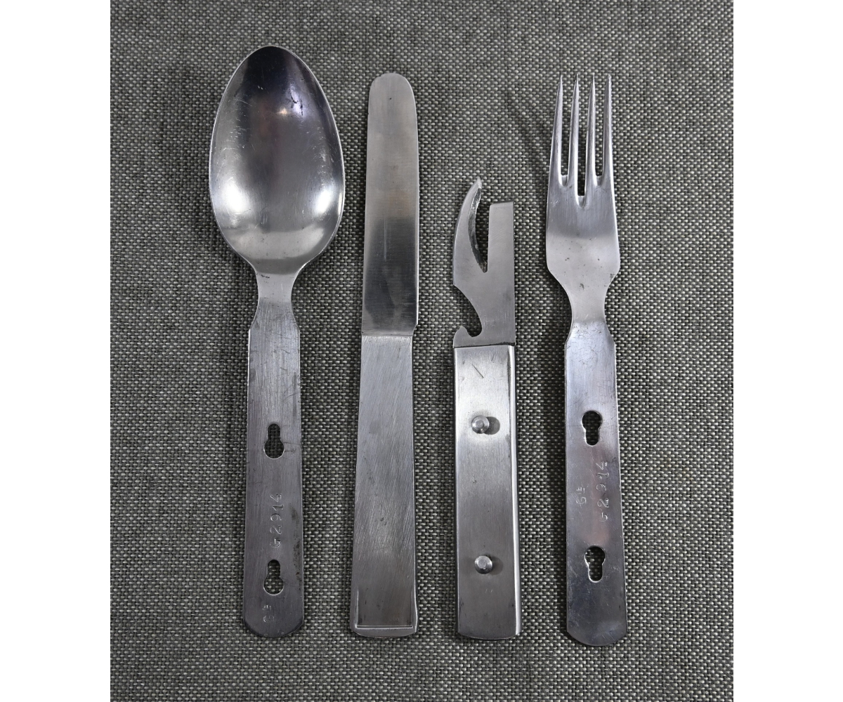 The set shows overall normal signs of wear. The spoon and fork are marked with 'CPSW41' and national eagle. The can opener and knife are not which is normal with this set. All parts are marked with an extra (serial) number/code.
