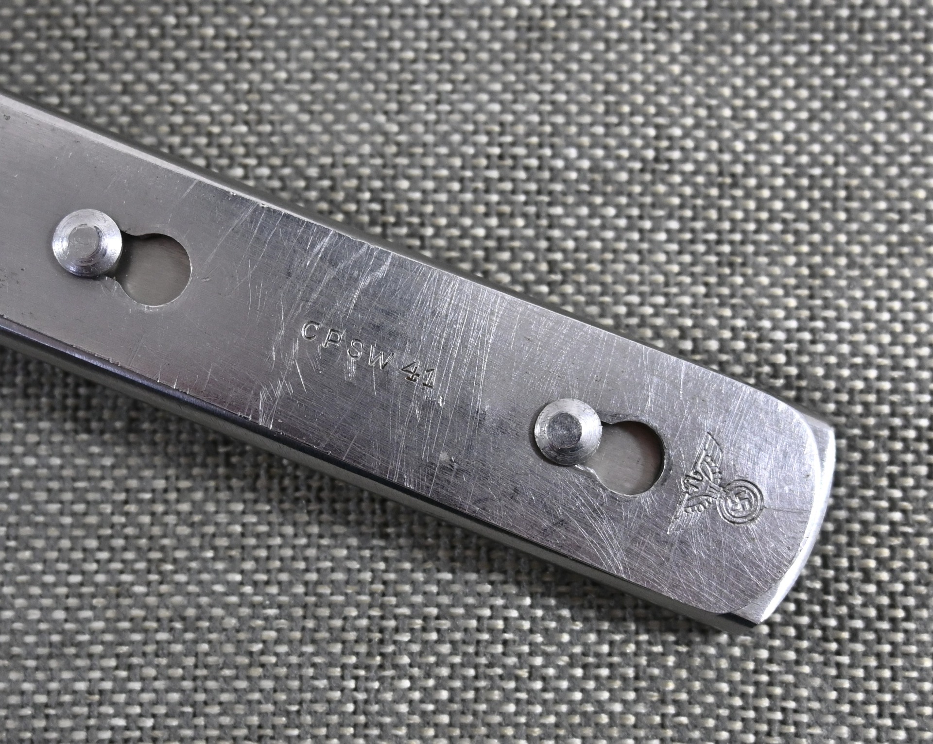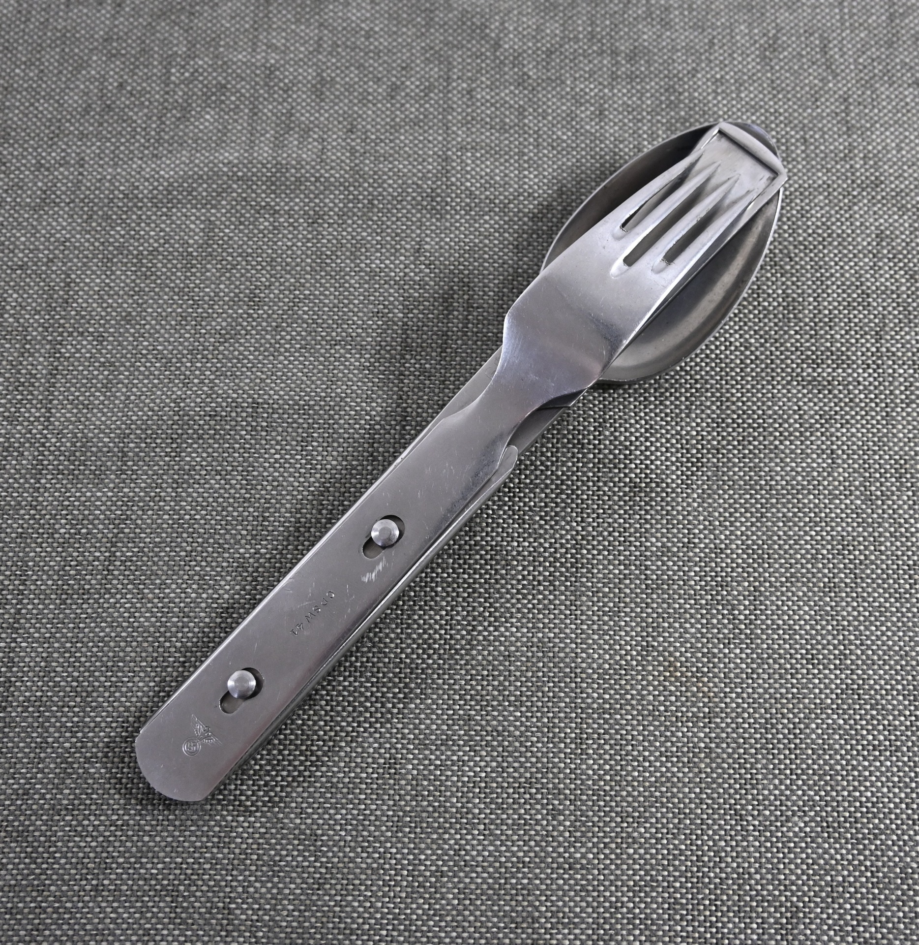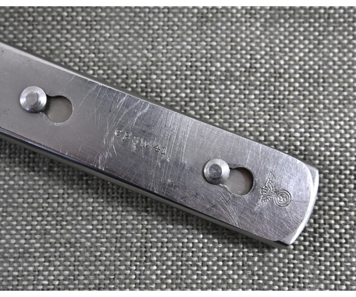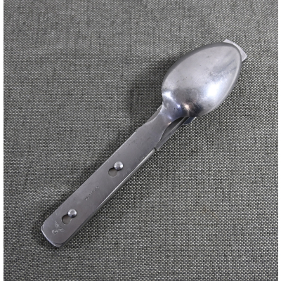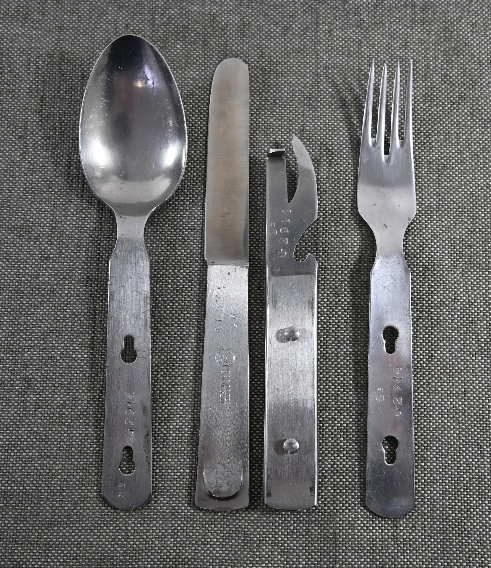The set shows overall normal signs of wear. The spoon and fork are marked with 'CPSW41' and national eagle. The can opener and knife are not which is normal with this set. All parts are marked with an extra (serial) number/code.