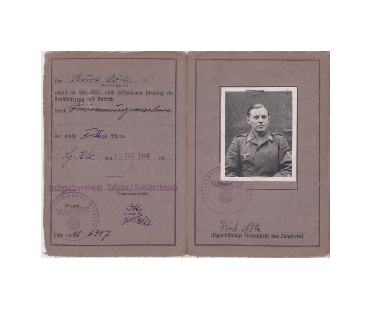 The document shows normal signs of wear. Complete with large sized portrait of Kurt Nölle who, according to the feldpostnummer L35458 served in Fliegerhorst-Kommandantur E 41/XI. From June 1940 untill Februari 1942 it was stationed in Montdidier, France. Hence the Luftgaukommando Belgien/Nordfrankreich stamp on the inside. The license is dated 10 November 1940.