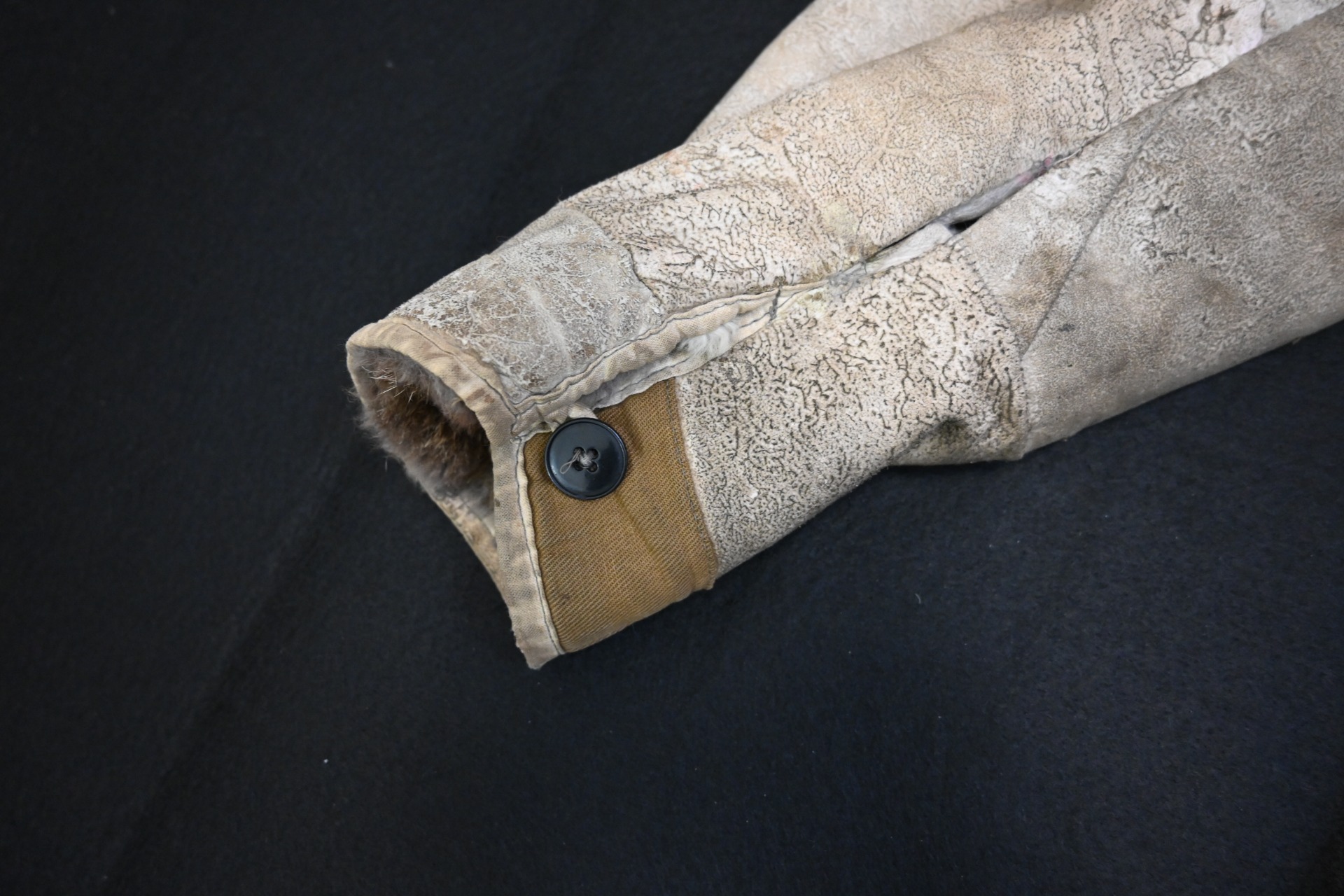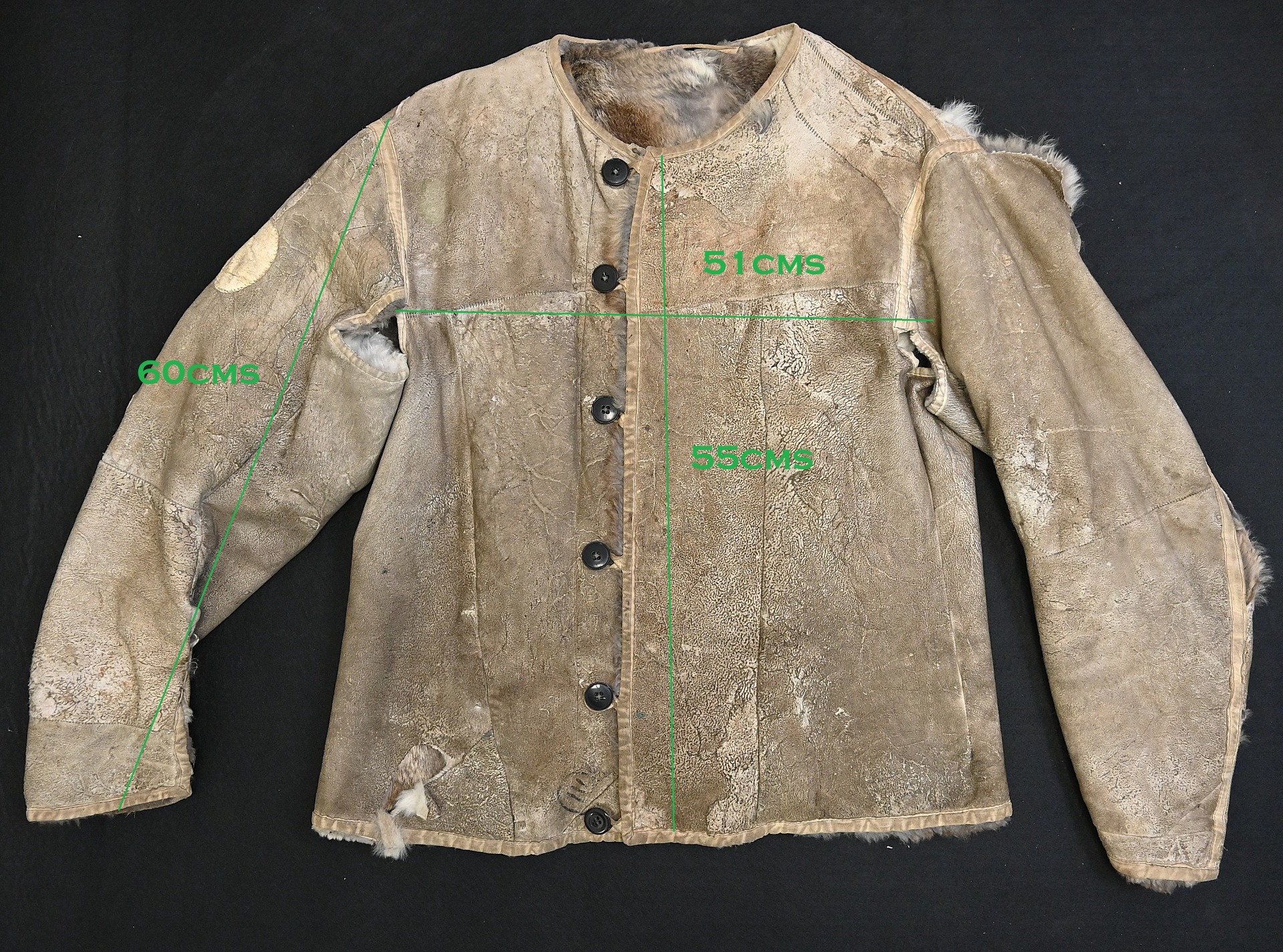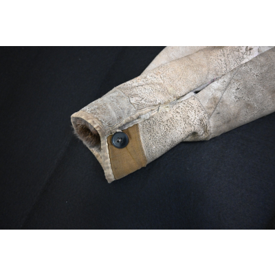 The jacket shows overall normal signs of use. It has a couple of damage, but could be fixed with some tlc. It is complete with all the buttons and fully fur lined. See the last photo for the sizes in cm. Very nice jacket for an Ardennes 44 or Ostfront mannequin display.