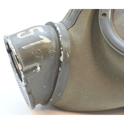 The mask shows overall normal signs of wear. Made out of canvas which is supple. Complete with all straps. Multiple markings on the inside. Dated 1940.