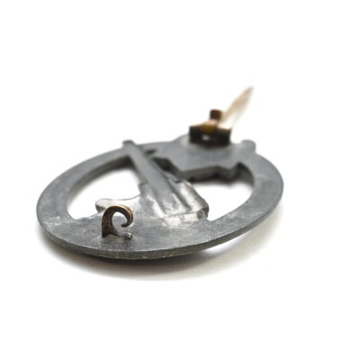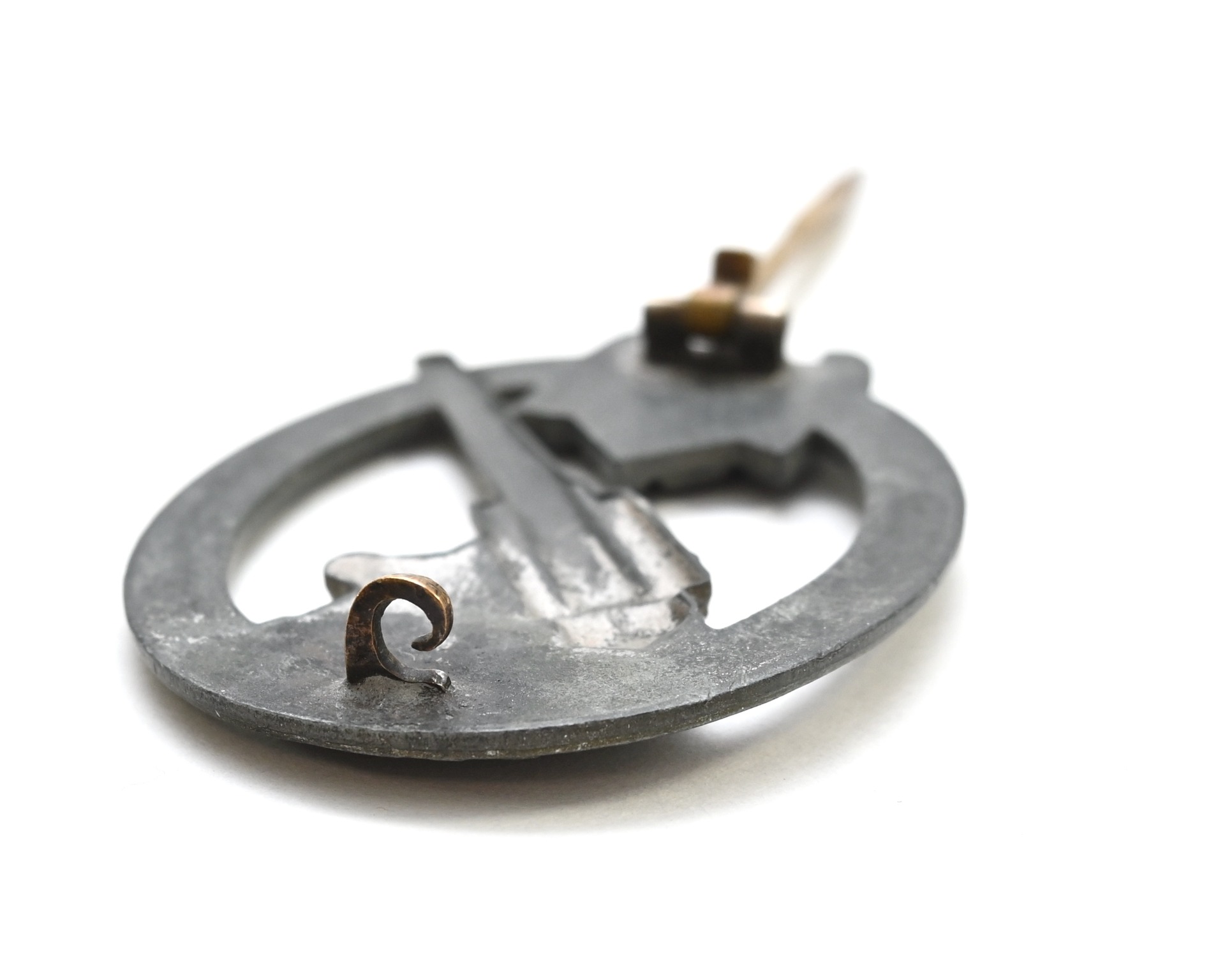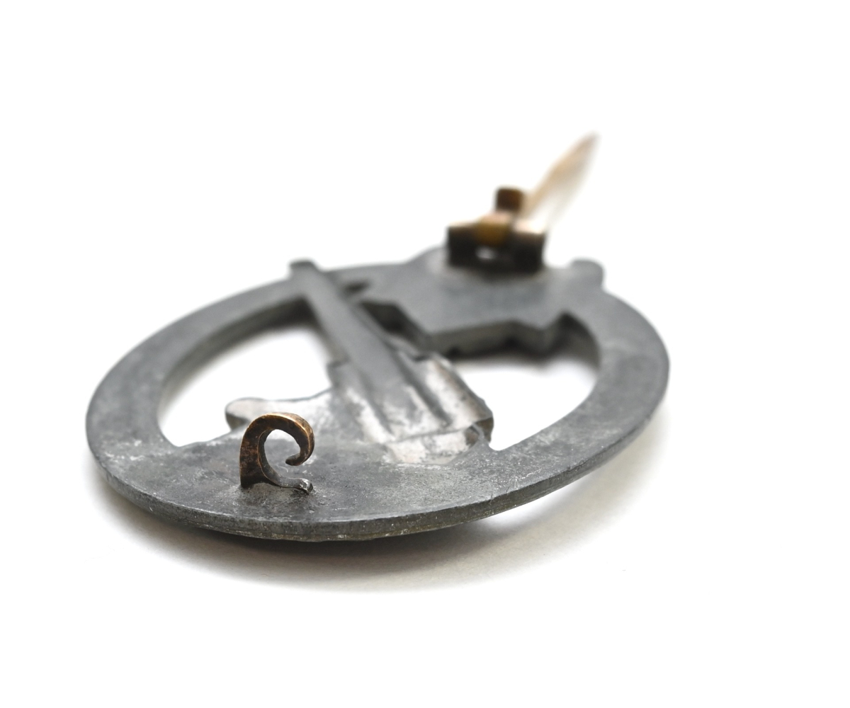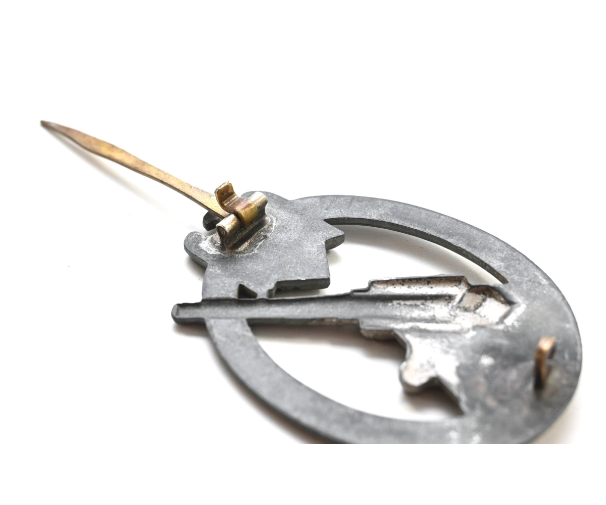 This zinc badge is in excellent condition and clear of damage. It's complete with working pin and catch. Not visible maker marked, but its closure design on the back is the typical for the maker 'Förster & Barth' from 'Pforzheim'.