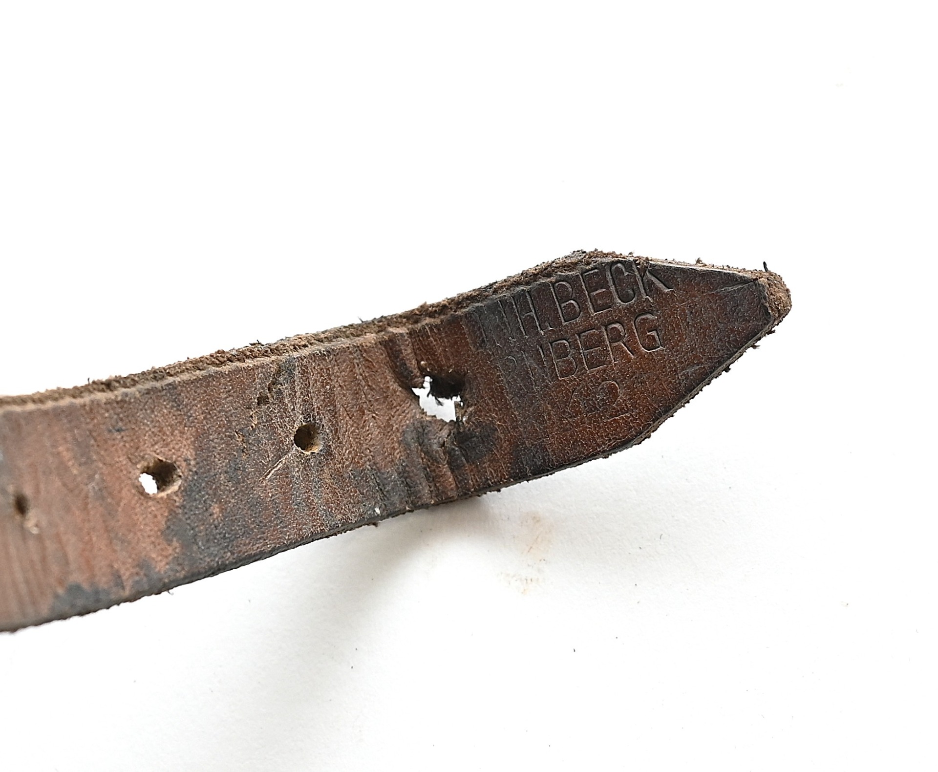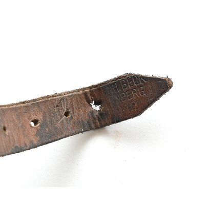 The strap shows overall normal signs of wear. The leather is supple and solid, but of course should be handled with care. It's in full length. Nicely marked by the maker Leon H.Beck from Nürnberg and dated 1942.