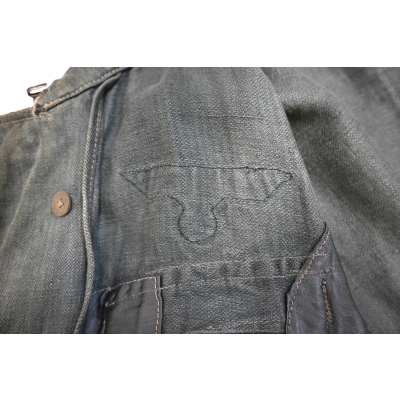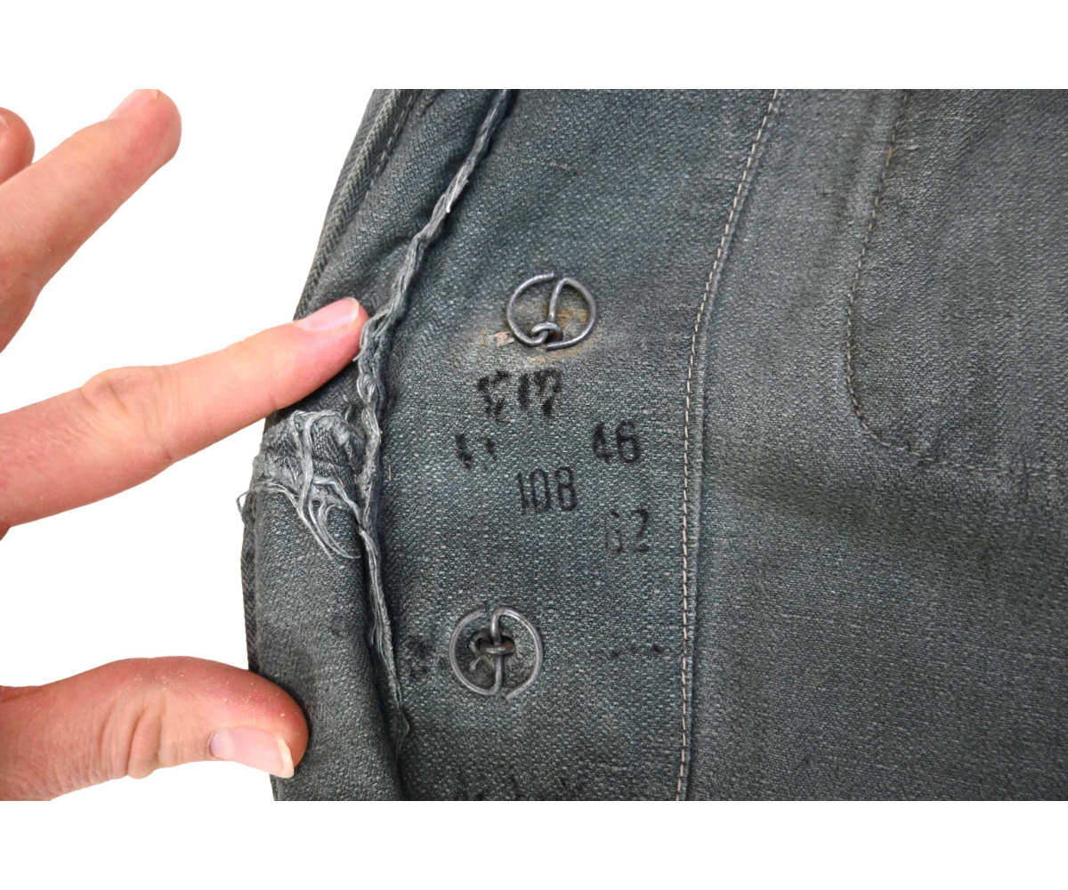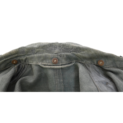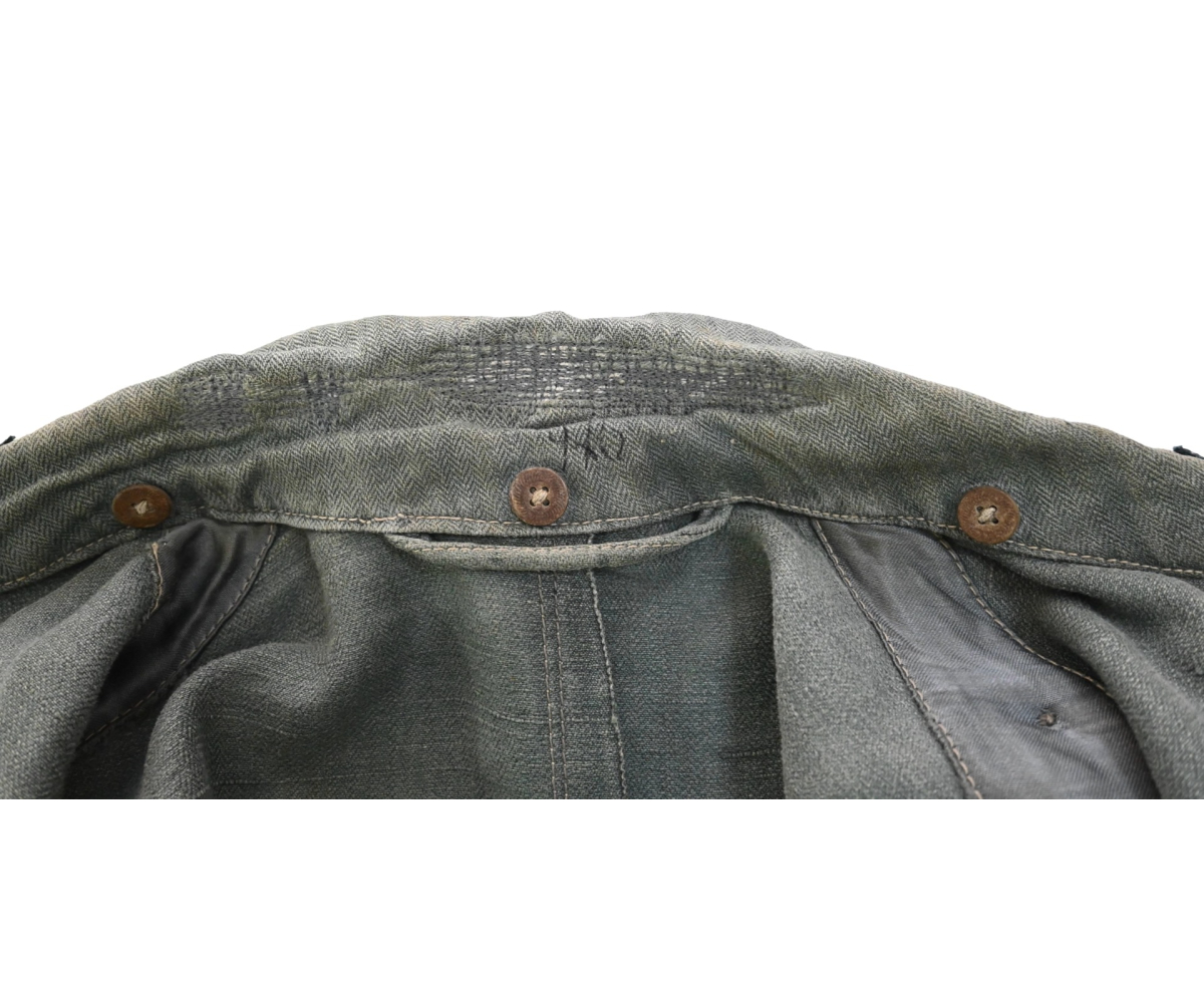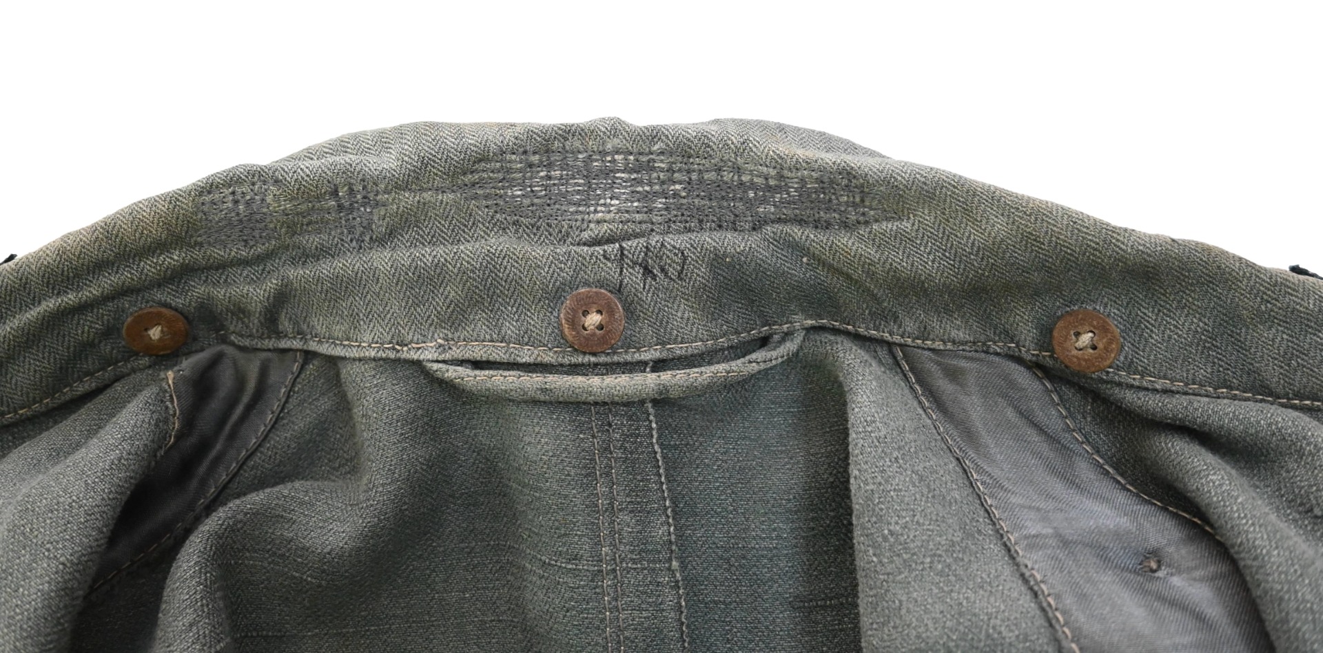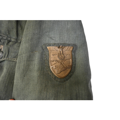 The tunic shows normal signs of wear but is still in very good condition. It has a very nice period field repair in the neck. The tunic is complete with original re-applied insignia and all of it's correct buttons. It comes with a nice Bevo Jäger abzeichen on the right sleeve and a Krim Campaign Shield on the left sleeve. On the inside the lining is intact. It's size marked and maker marked, but a bit vague to read (see photo) due to wear.