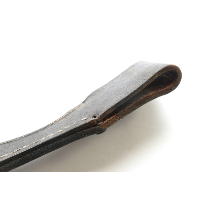 The frog shows overall normal signs of wear. The leather is supple. One of the rivets is loose, but present. Maker marking worn off.