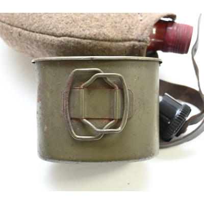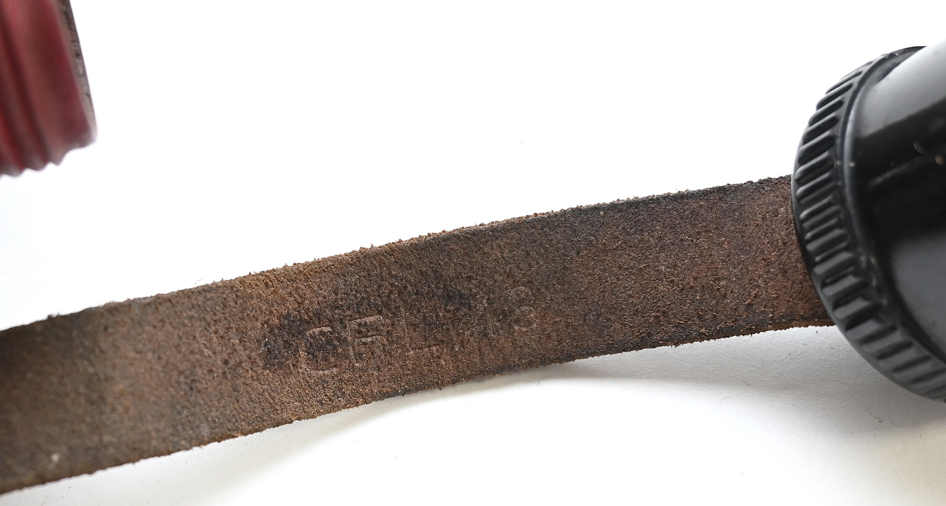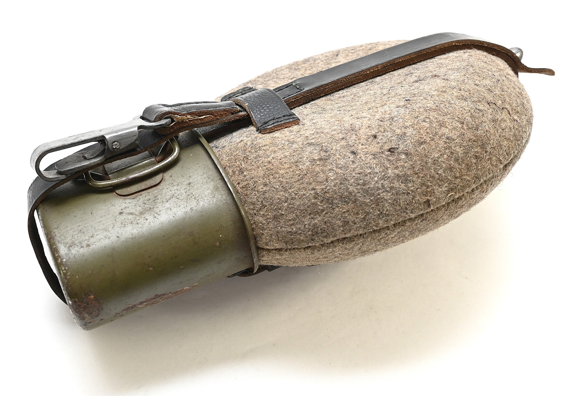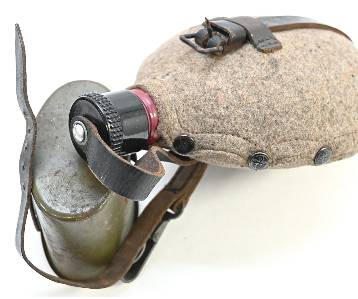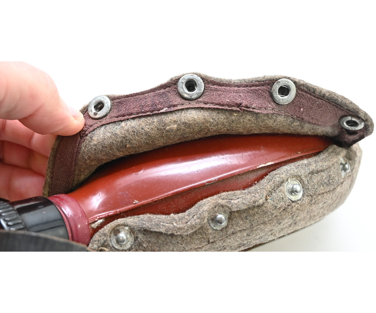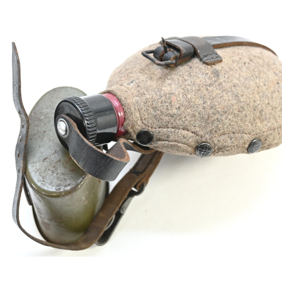 The canteen shows overall normal signs of wear. The leather straps are supple and solid. The felt cover is complete with all 4 push buttons and are in working order. The cover has a couple of moth bites. The strap which is attached to the screw lid is marked 'CFL43'. The canteen comes with a red painted mid war bottle.