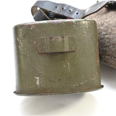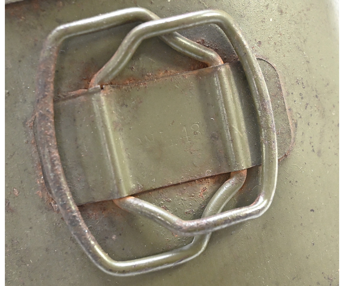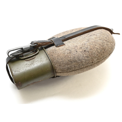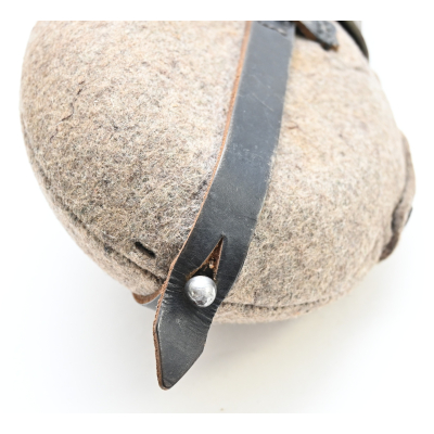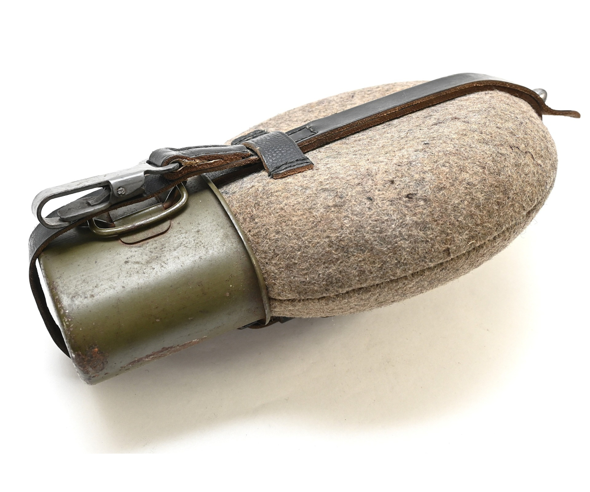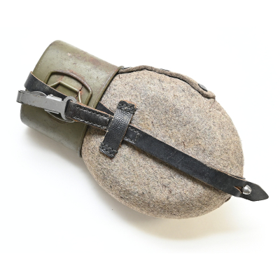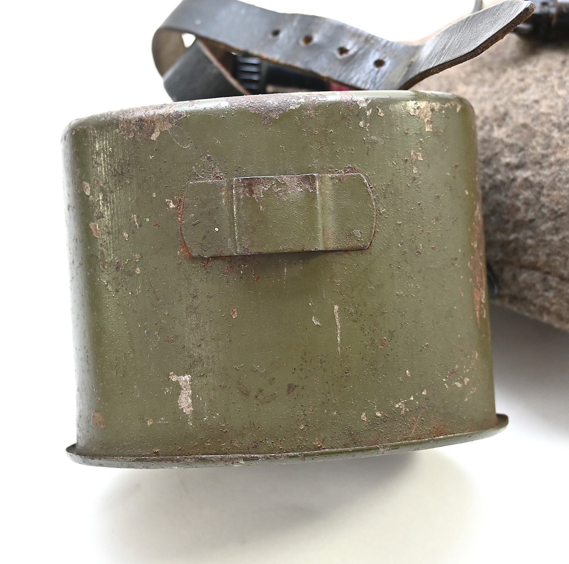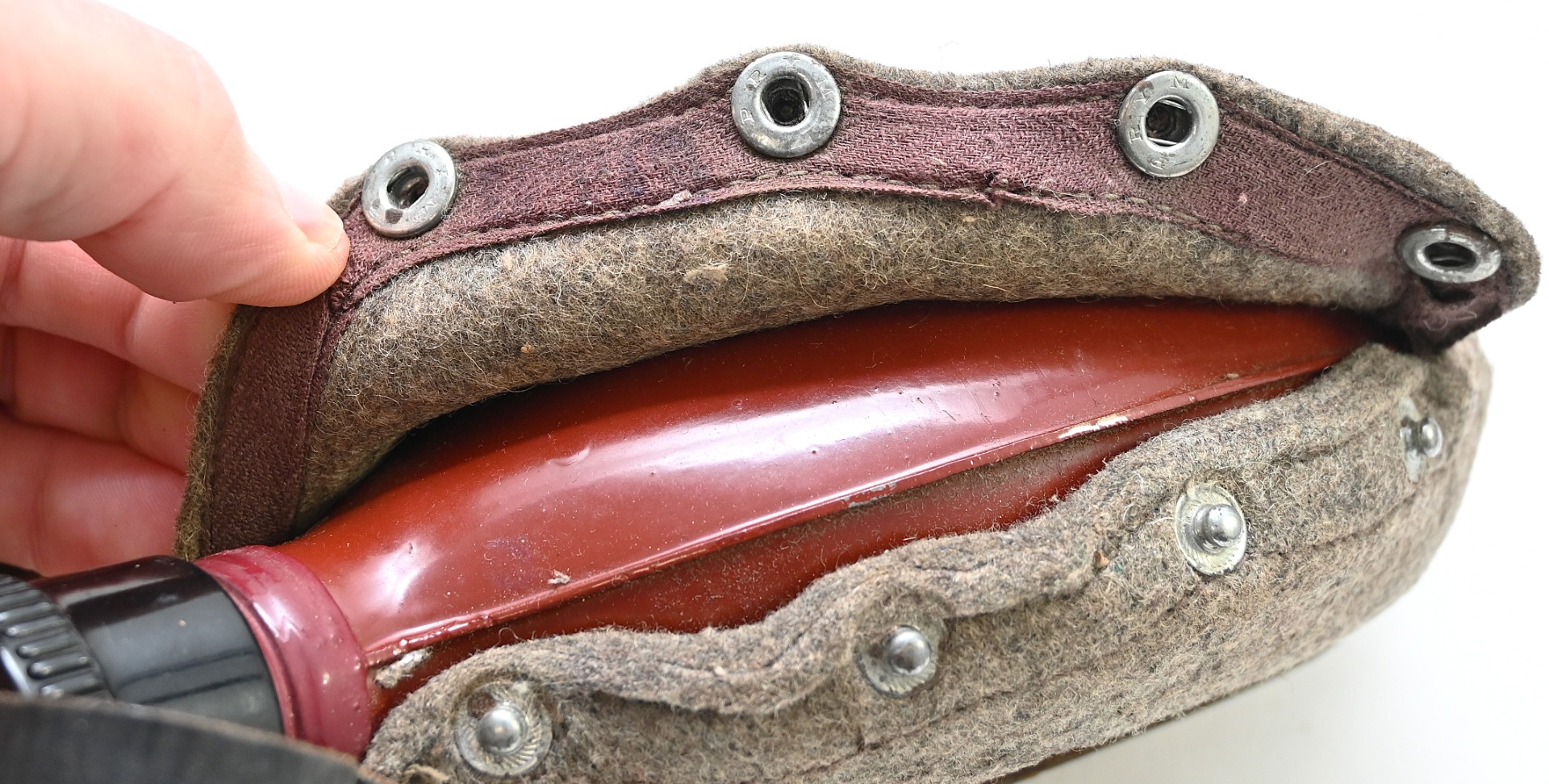 The canteen shows overall normal signs of wear. The leather straps are supple and solid. The felt cover is complete with all 4 push buttons and are in working order. The cover has a couple of moth bites. The strap which is attached to the screw lid is marked 'CFL43'. The canteen comes with a red painted mid war bottle.