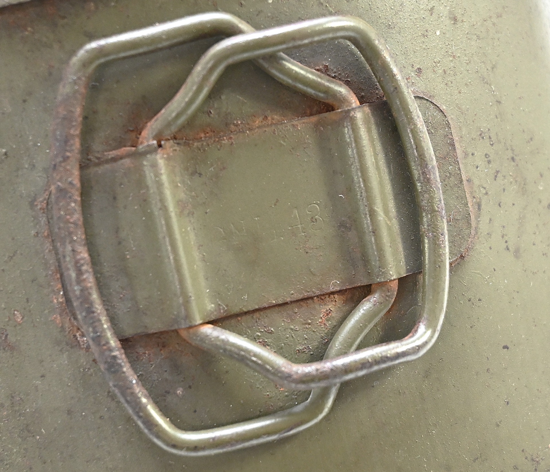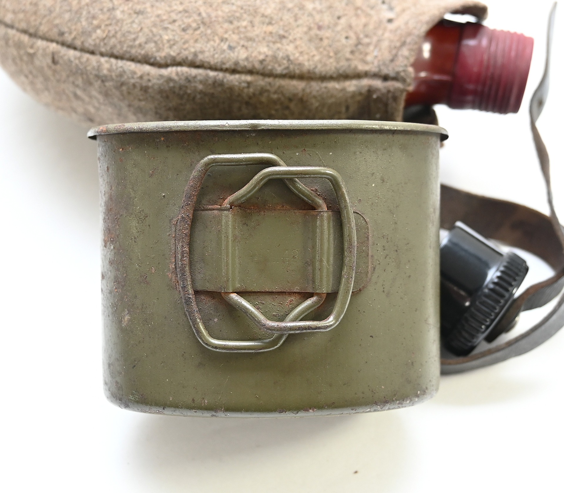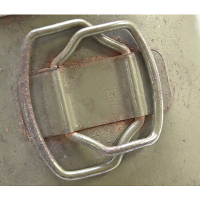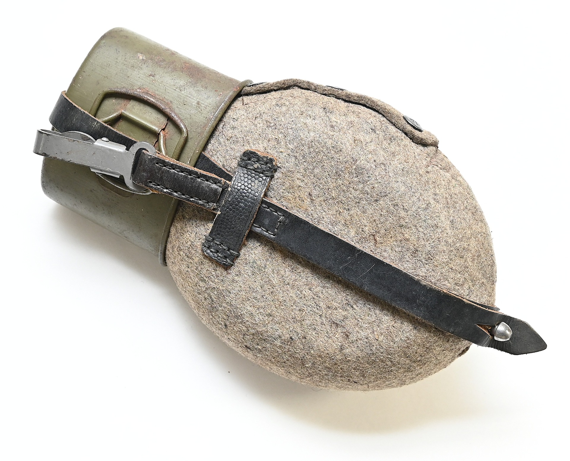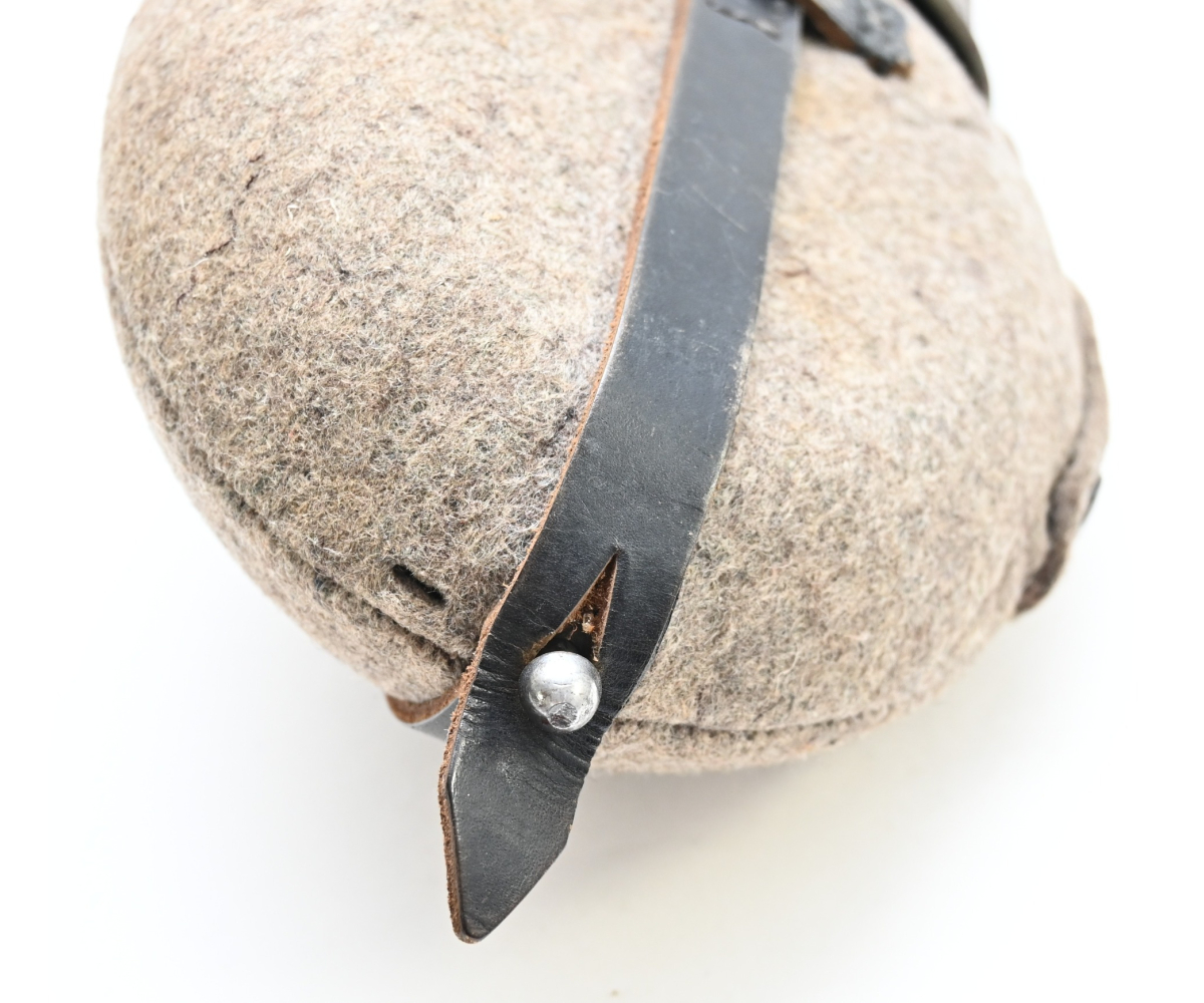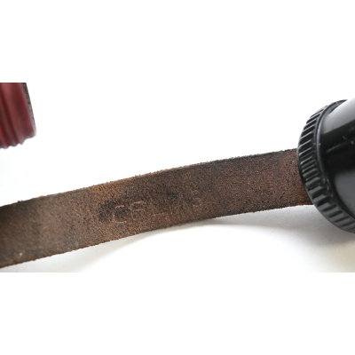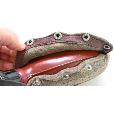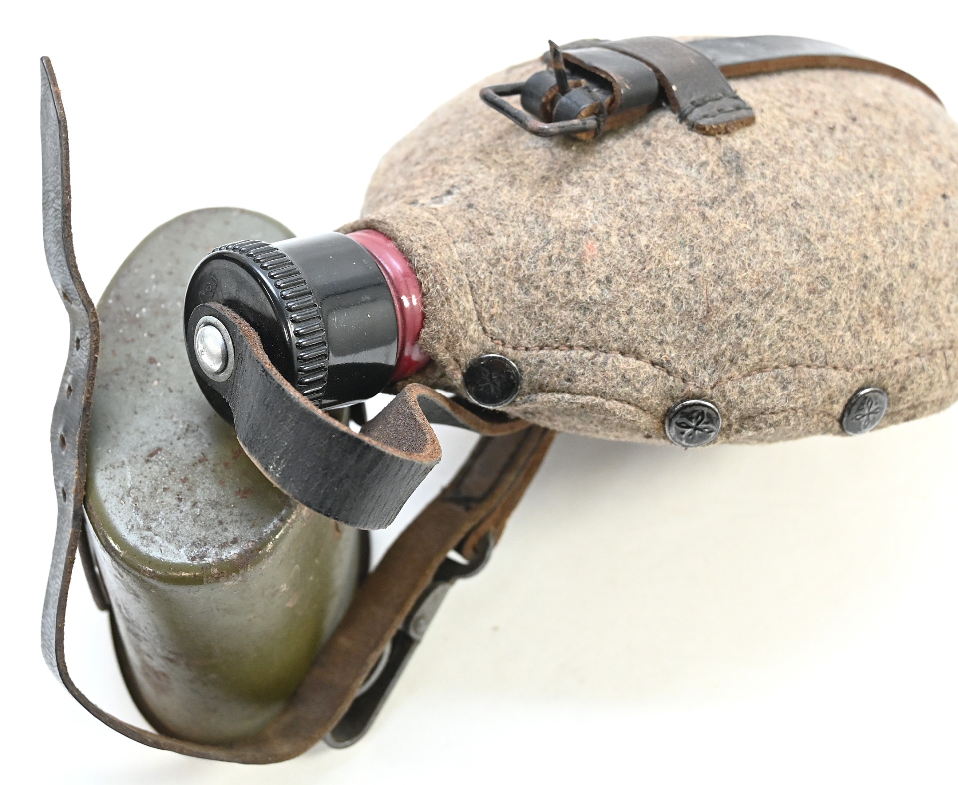 The canteen shows overall normal signs of wear. The leather straps are supple and solid. The felt cover is complete with all 4 push buttons and are in working order. The cover has a couple of moth bites. The strap which is attached to the screw lid is marked 'CFL43'. The canteen comes with a red painted mid war bottle.