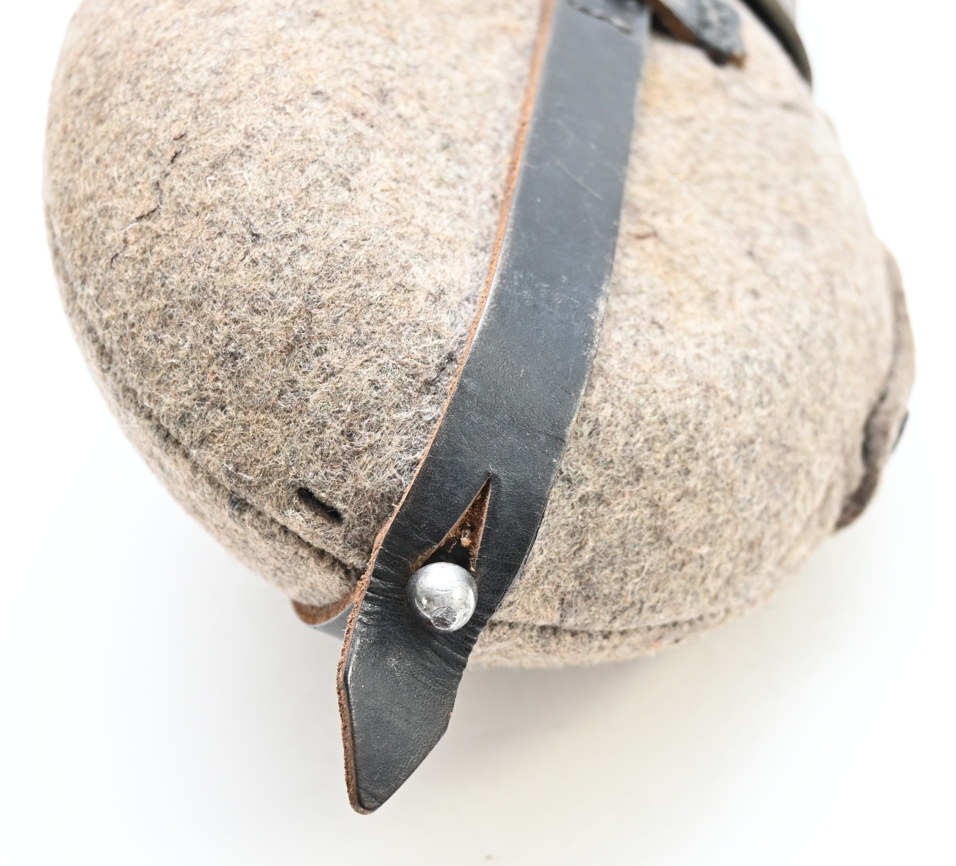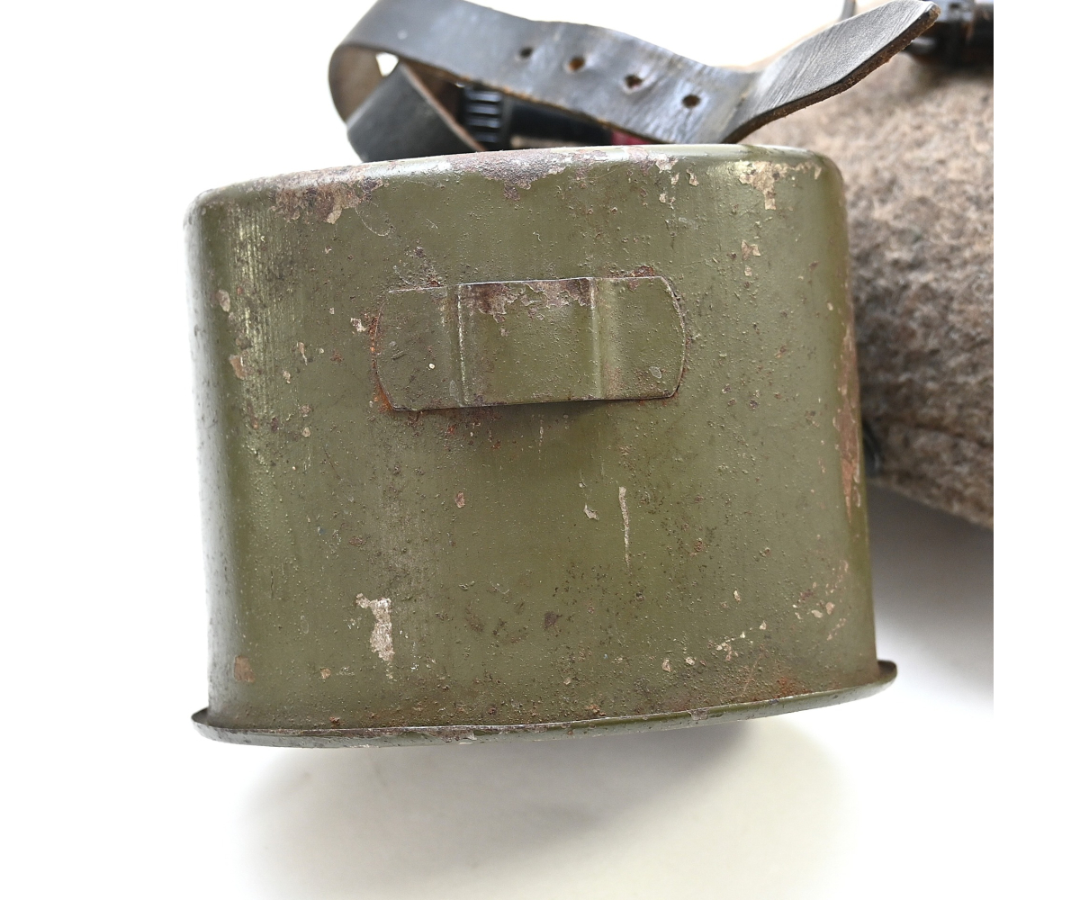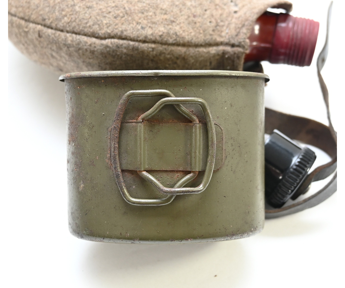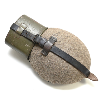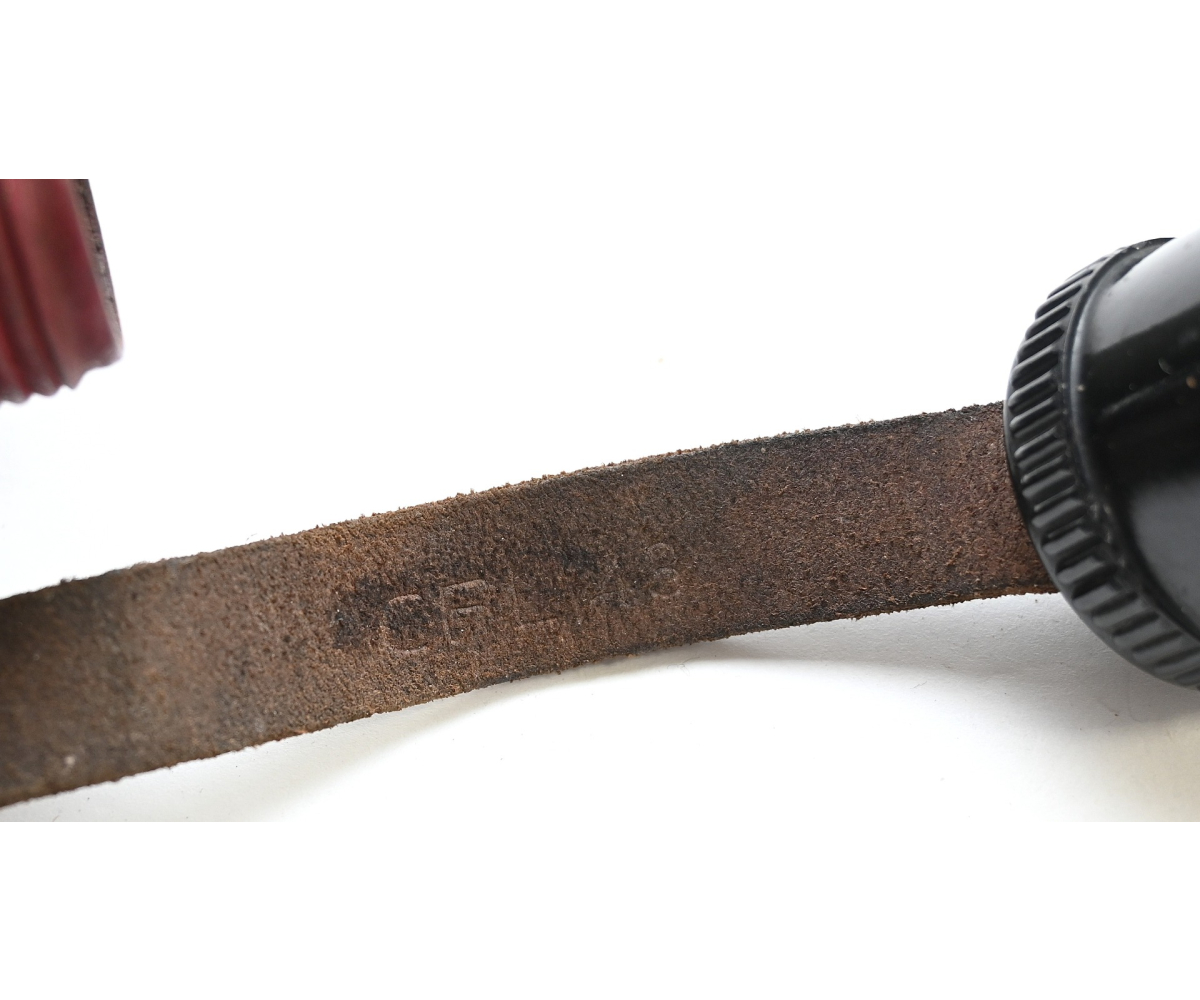 The canteen shows overall normal signs of wear. The leather straps are supple and solid. The felt cover is complete with all 4 push buttons and are in working order. The cover has a couple of moth bites. The strap which is attached to the screw lid is marked 'CFL43'. The canteen comes with a red painted mid war bottle.