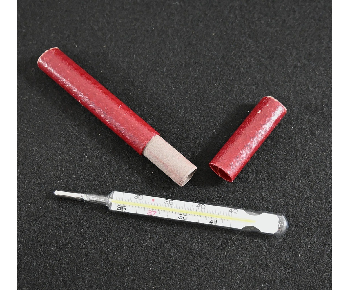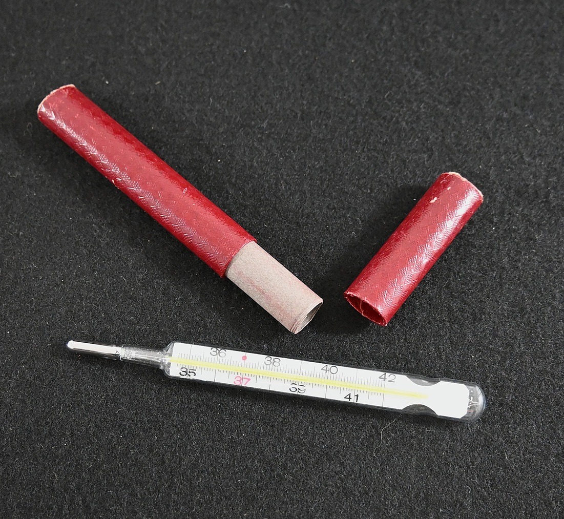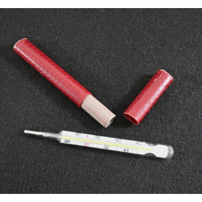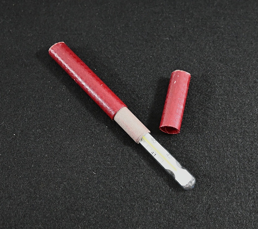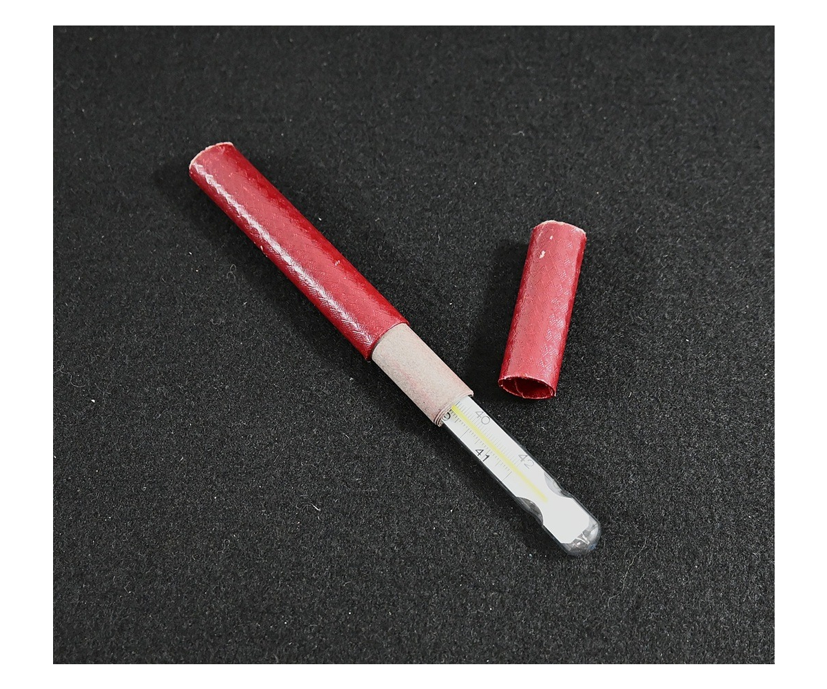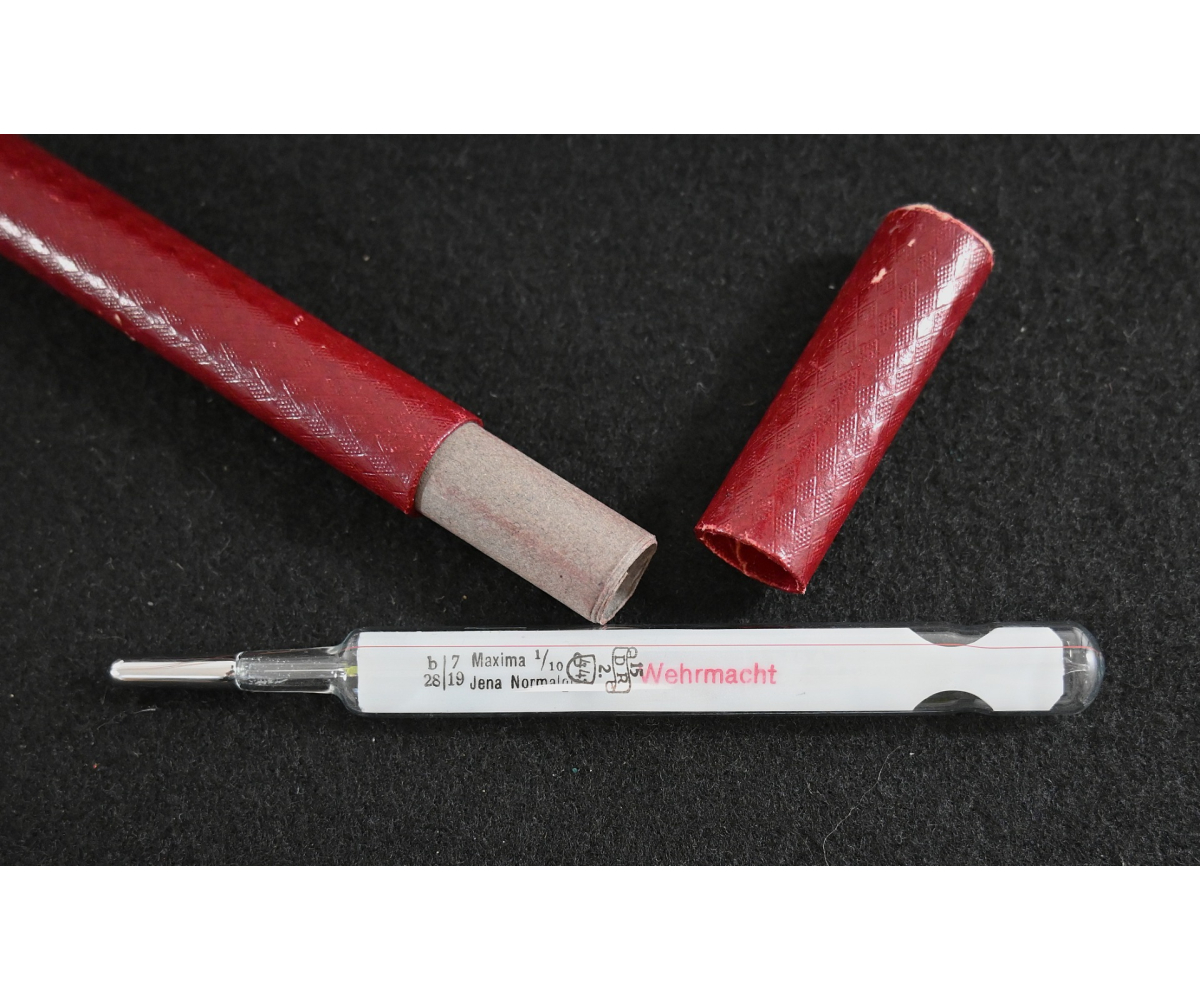 The thermometer shows overall minor signs of use. Nicely marked 'Wehrmacht' and dated 1944. Comes in its period cardboard case.