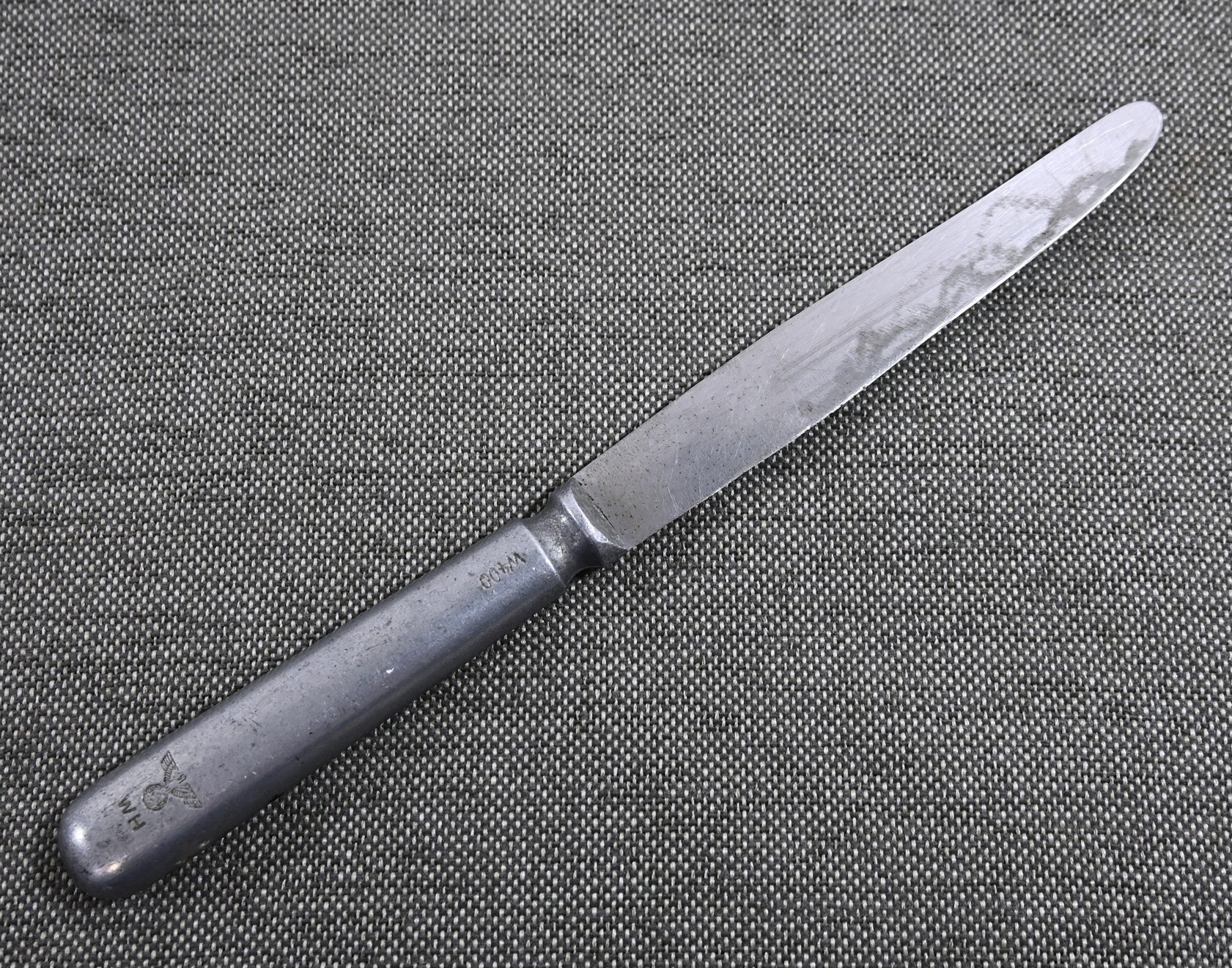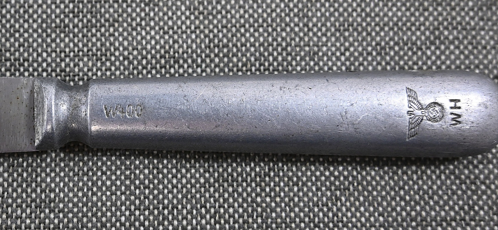 The knife shows overall normal signs of wear. Nicely marked with an eagle and maker initials 'W400'. The blade is marked 'Rostfrei' on the other side.