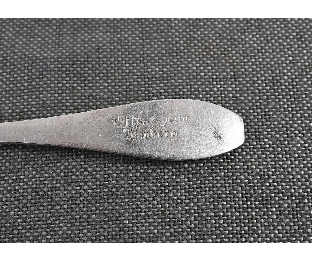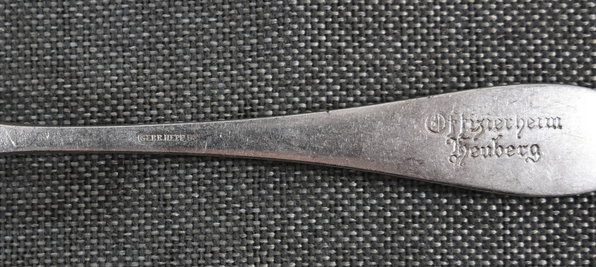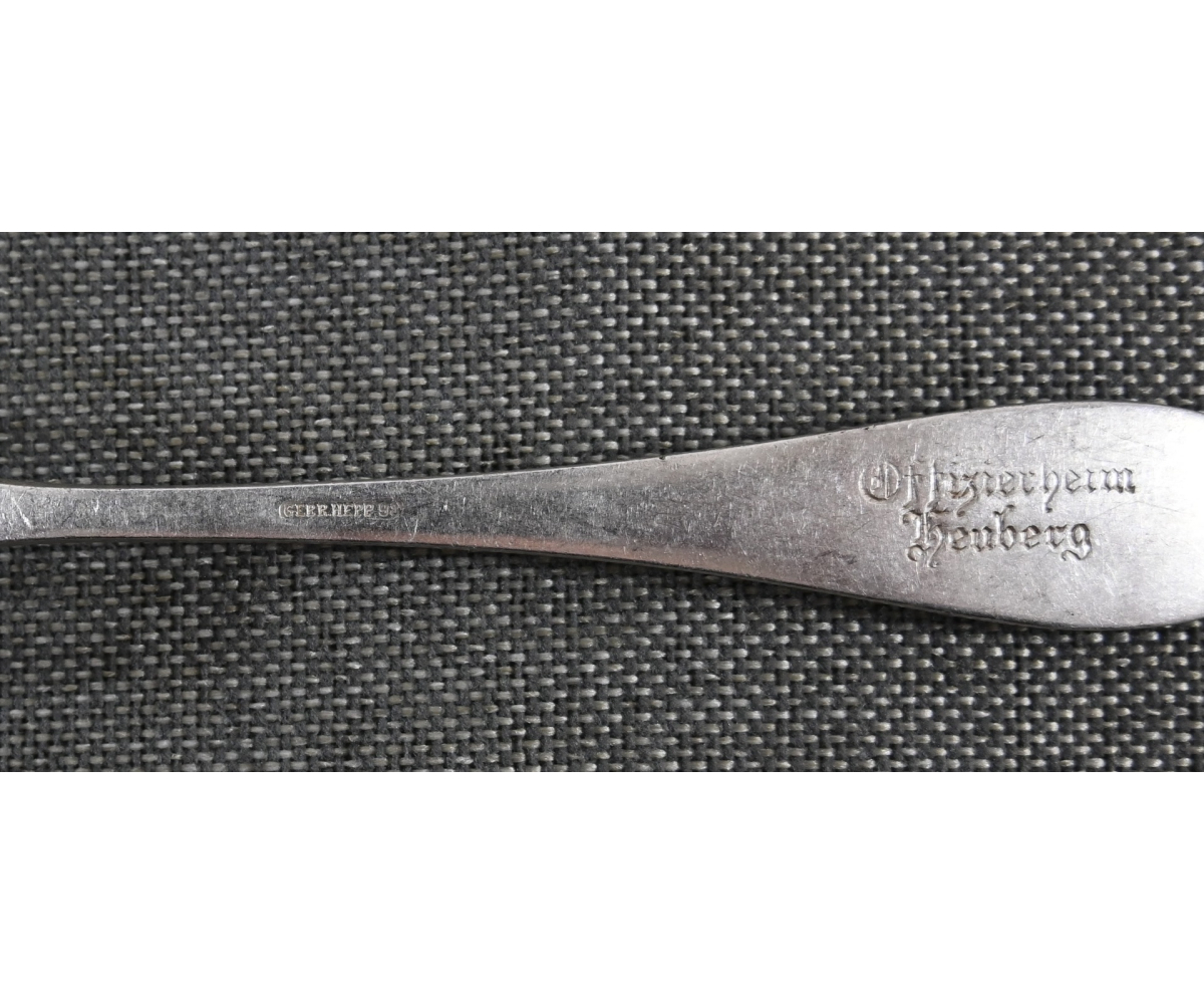 The fork is in excellent condition and shows some normal signs of use. The piece is nicely marked by 'Gebrüder Hepp' from 'Pforzheim', marked with the number '90', meaning it is silver-plated and marked 'Offizierheim Heuberg', meaning it was for officers' use in the officers quarters at a military base in 'Heuberg' (Germany).
