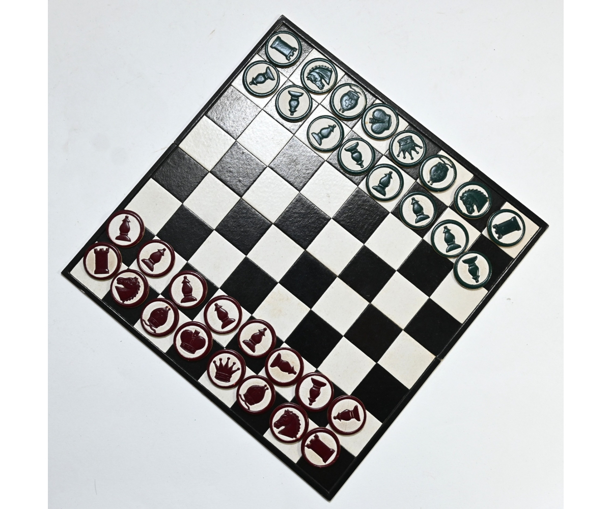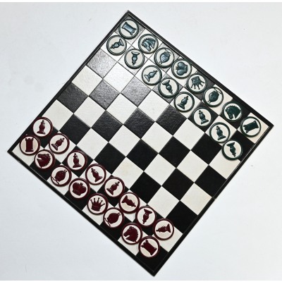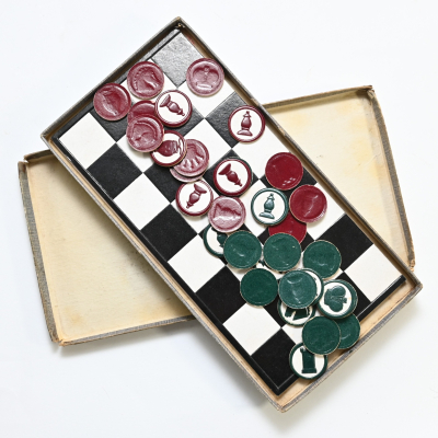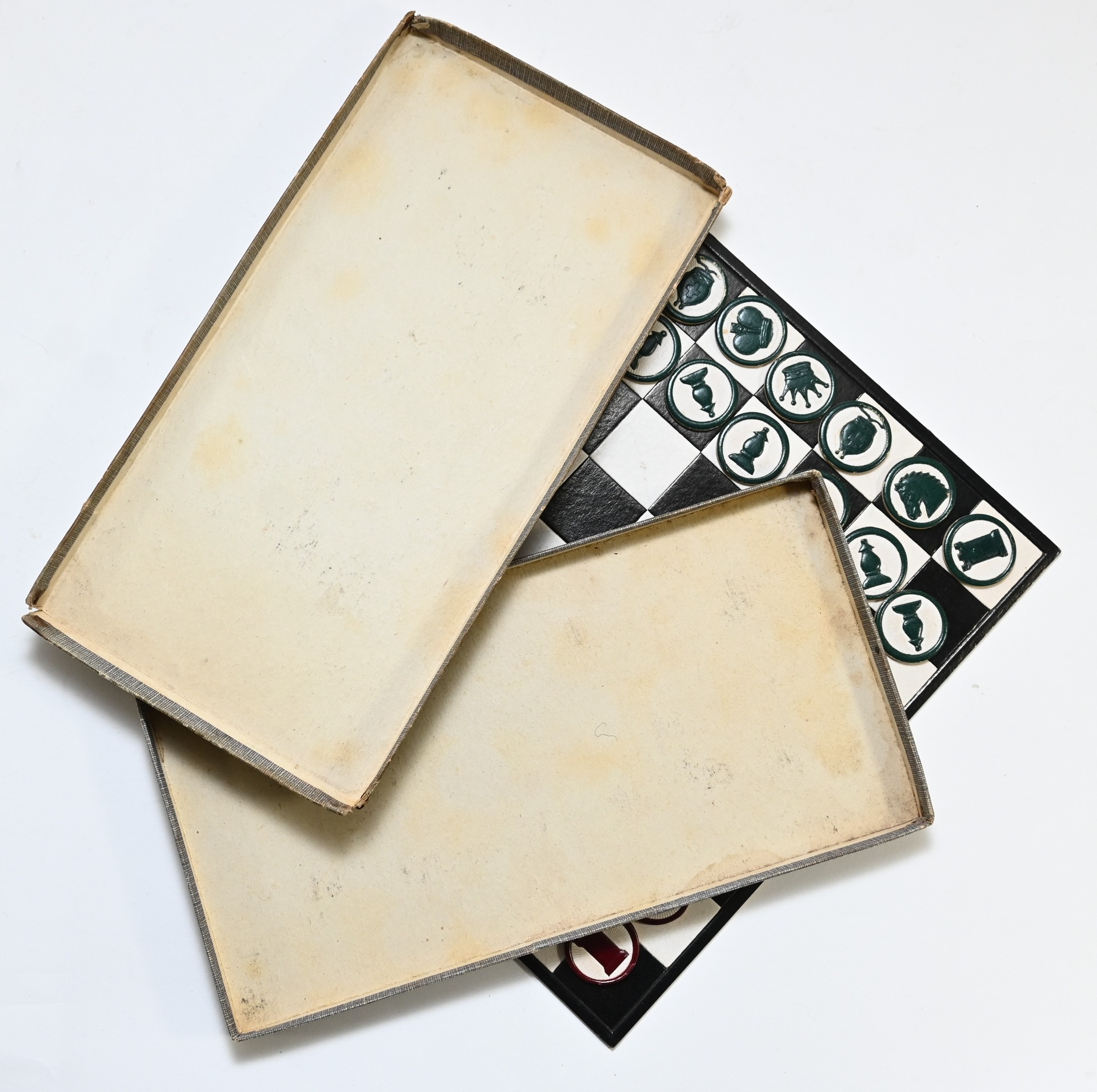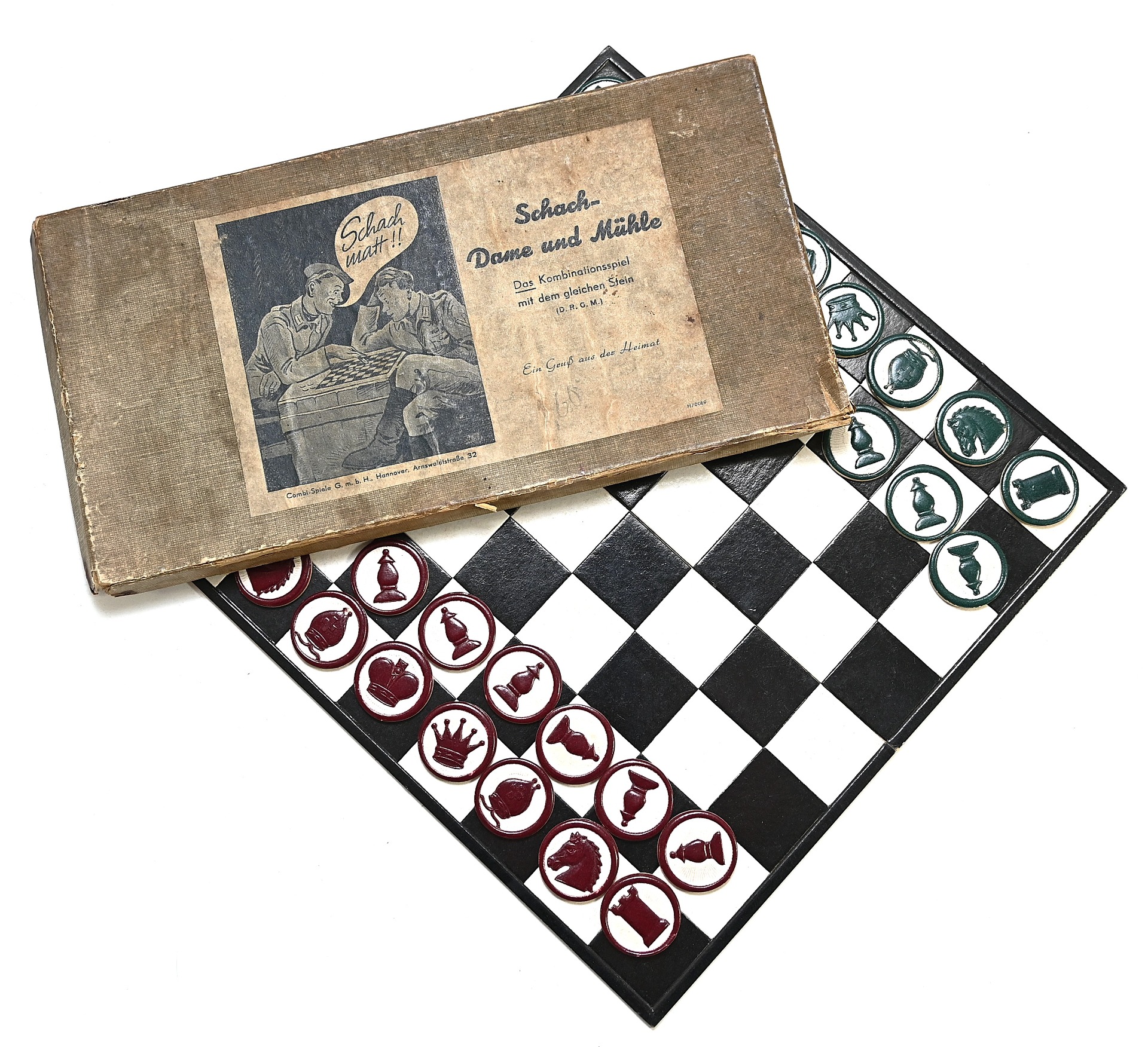The set shows overall normal signs of wear. Mainly on the corner of the lid. The label on the lid is intact. All chess pieces are present.