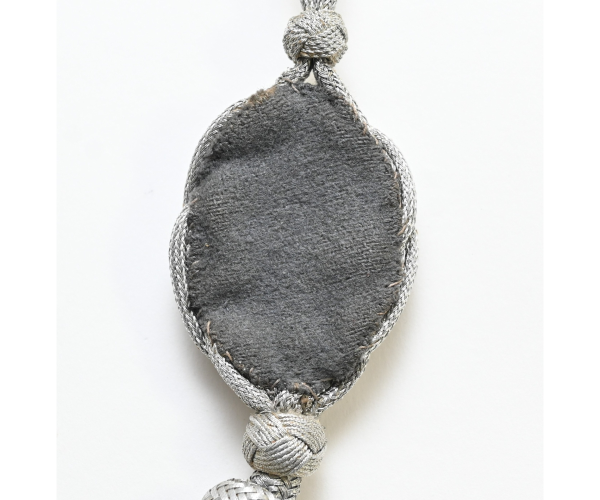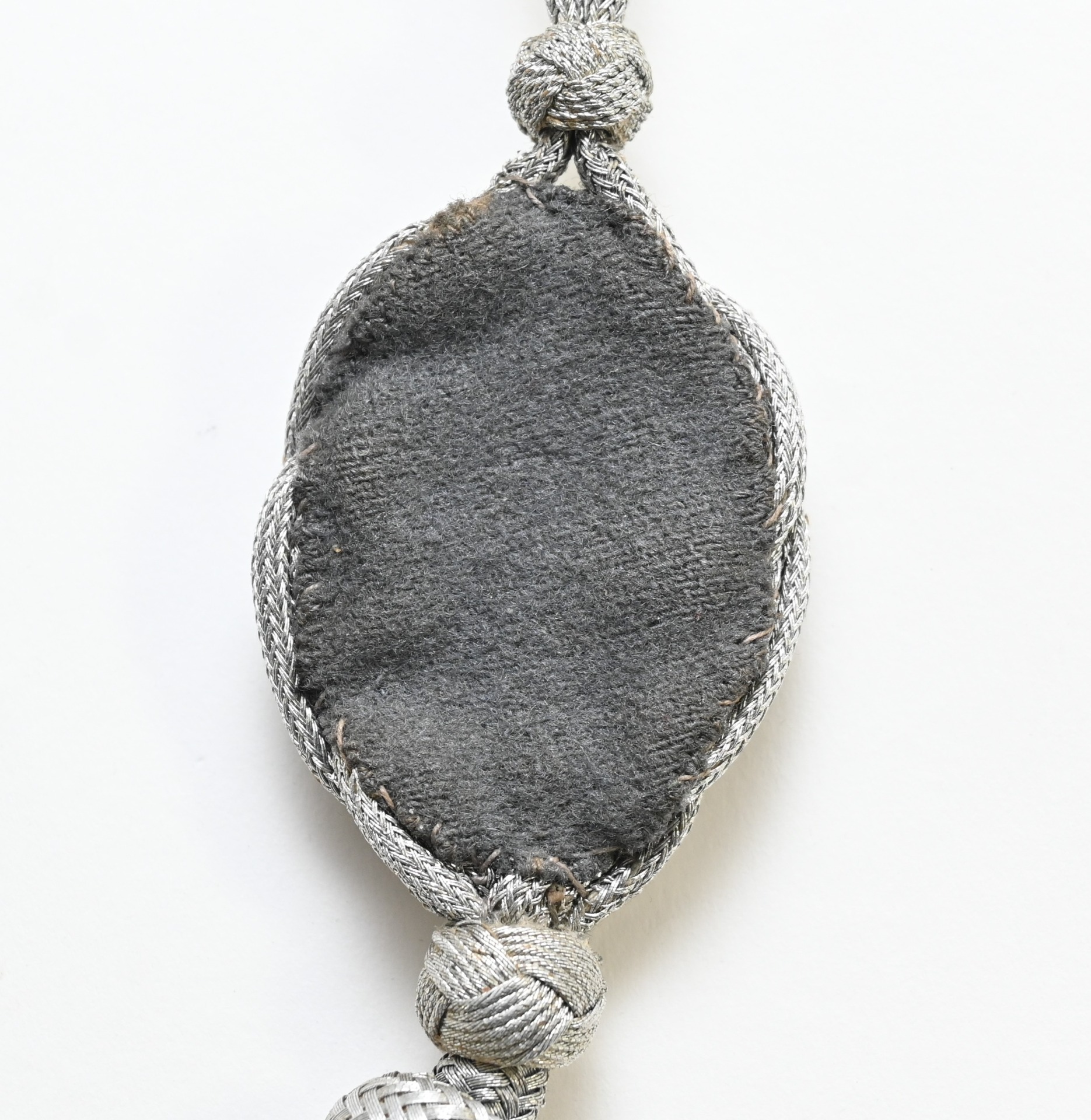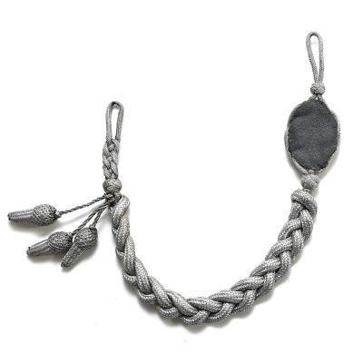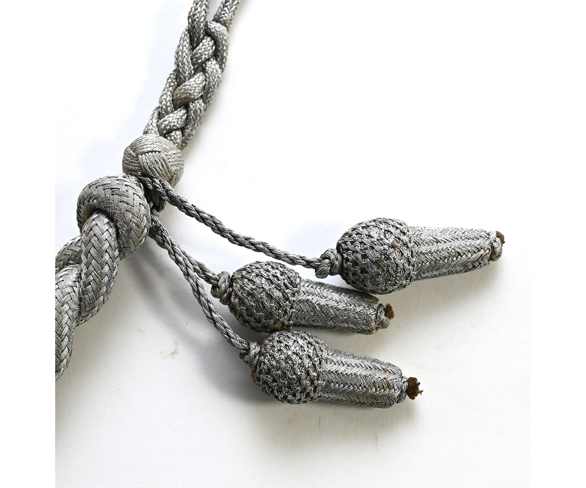 The shooting lanyard shows overall normal signs of wear. It's supple and solid. The Lanyard is complete with three period! attached acorns. The original backing is present.