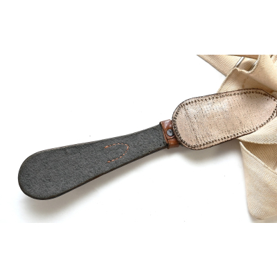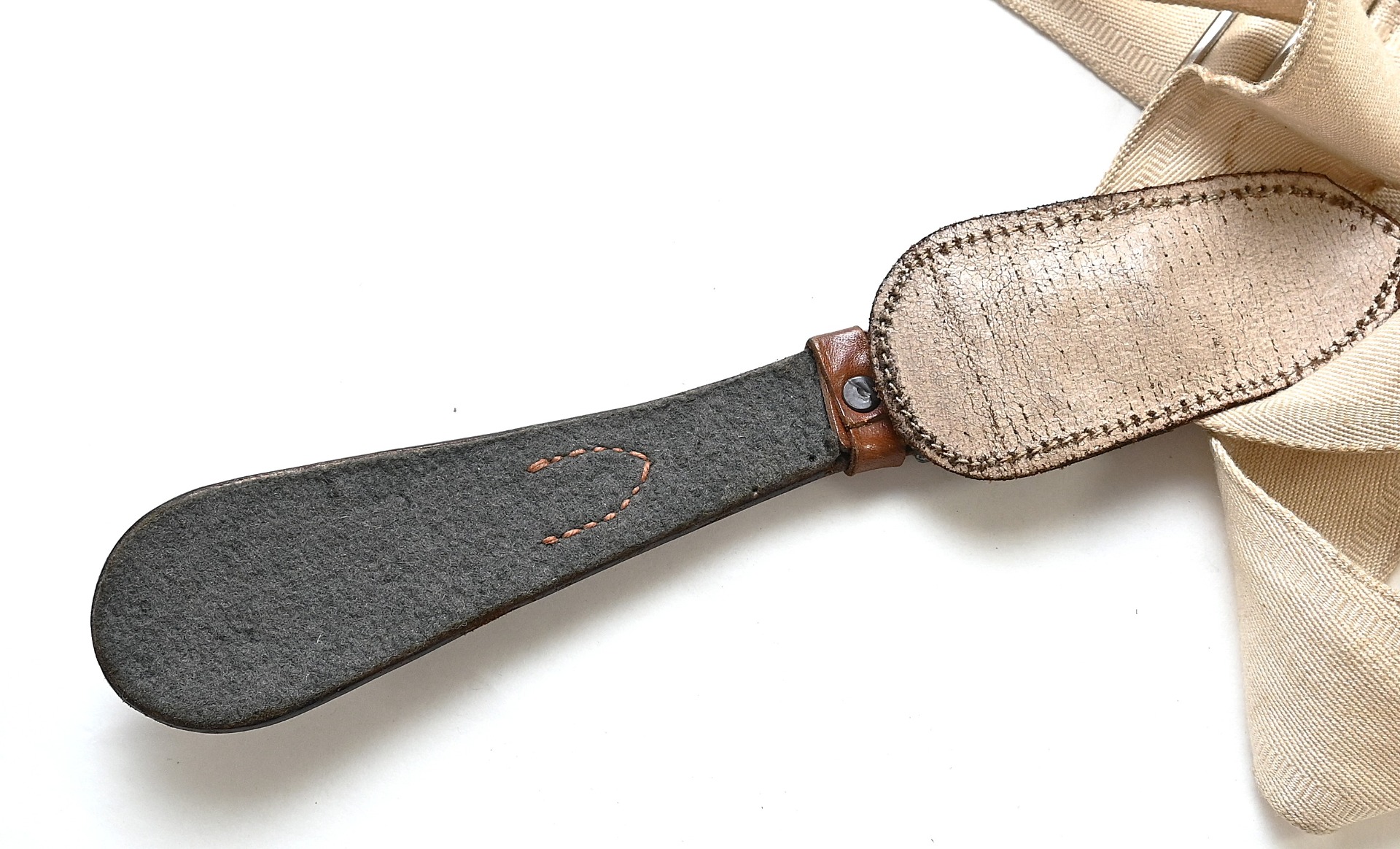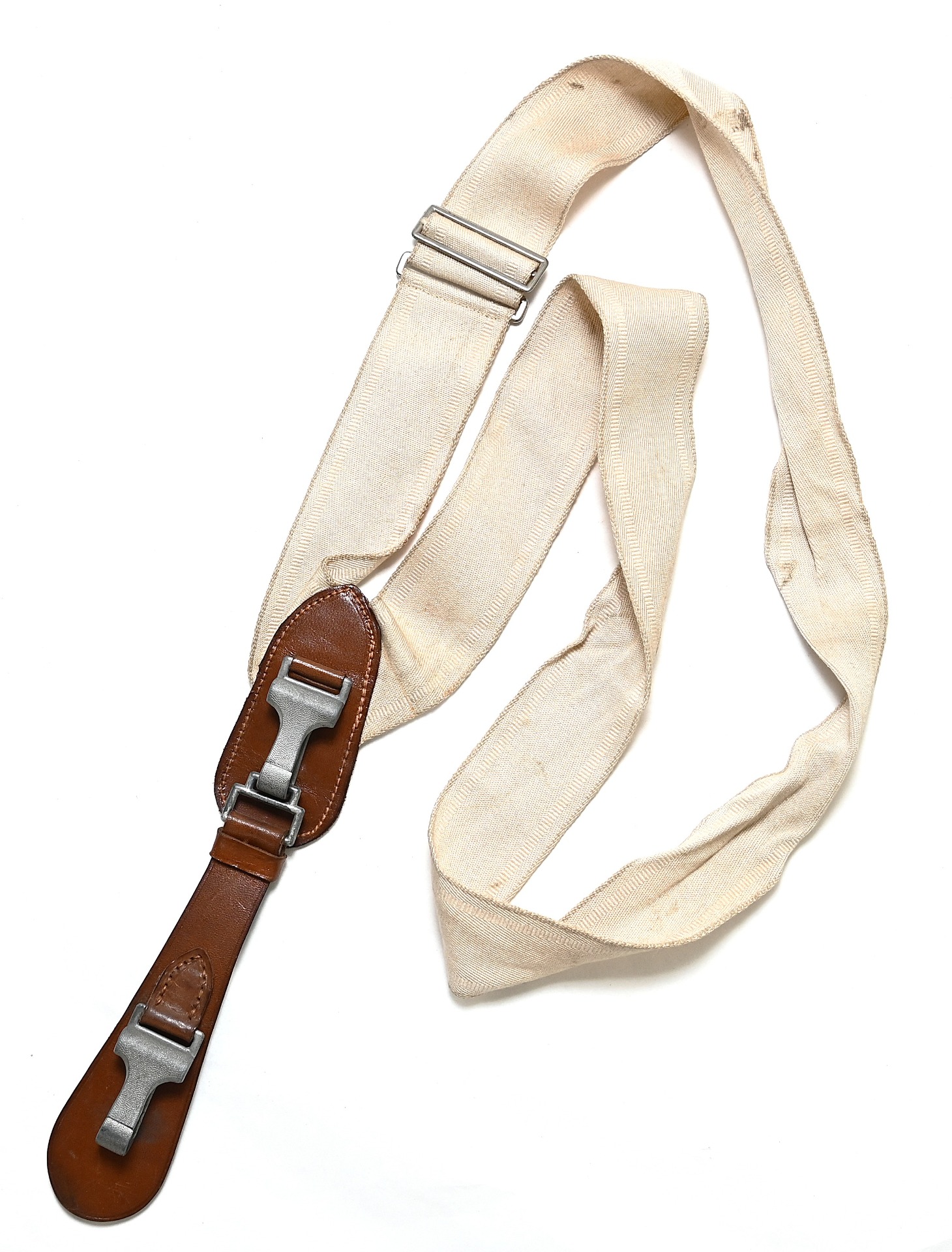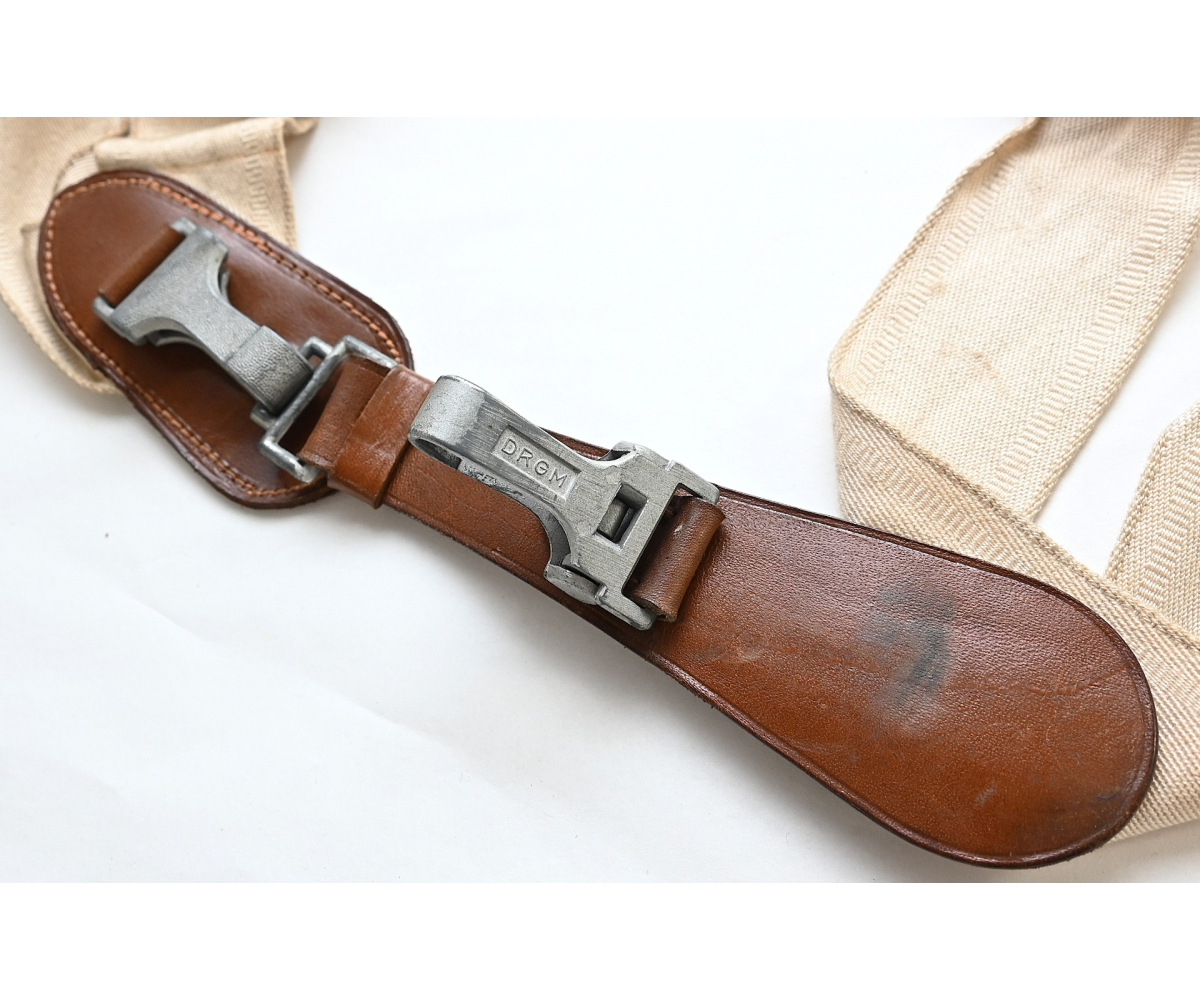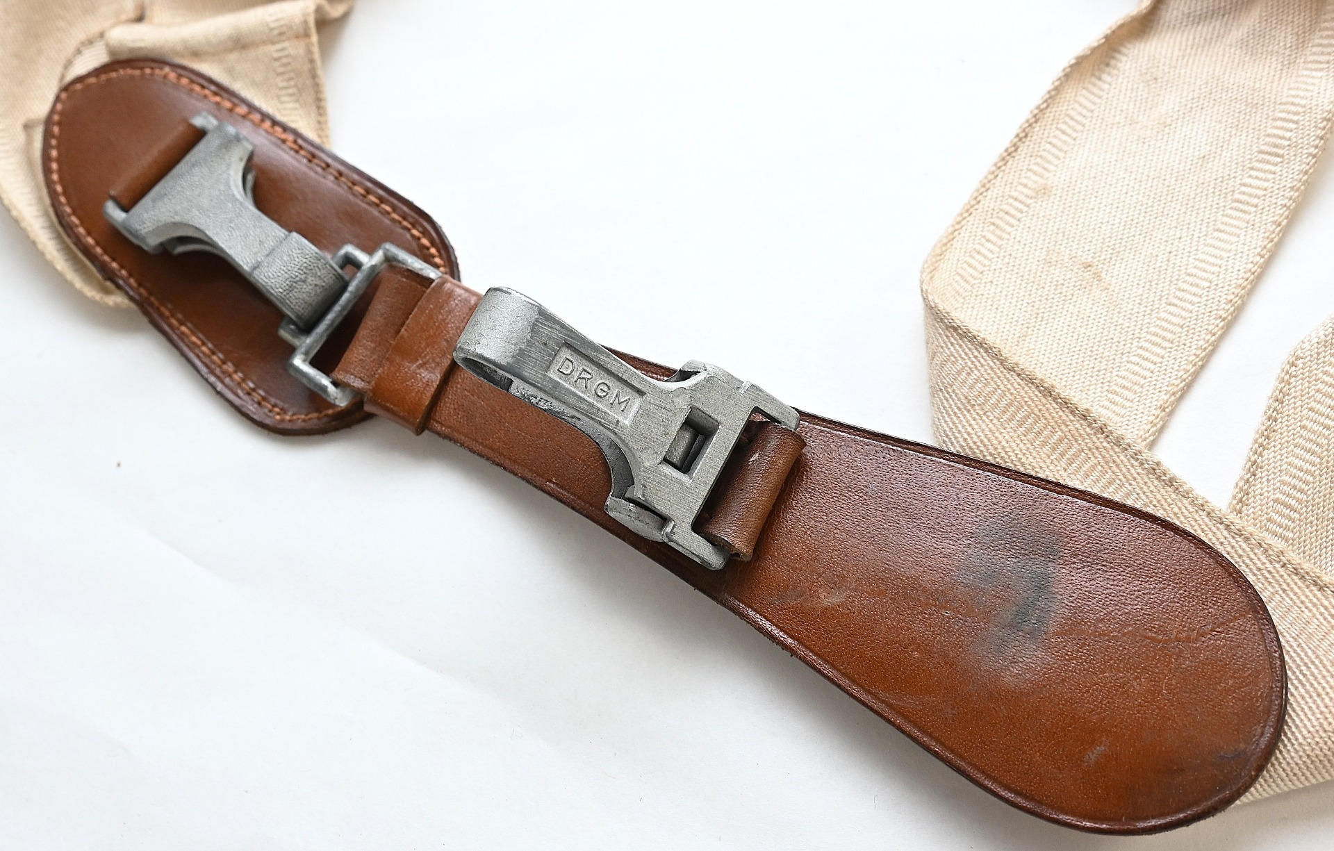 The set shows overall normal signs of wear. The leather is supple and the felt on the back of the lower hanger is still present and intact. The clip is marked 'D.R.G.M.'