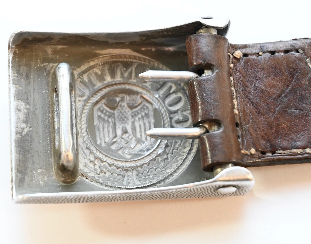 Nice early war produced aluminium Wehrmacht heer EM/NCO buckle with leather tab in used, but very good condition.