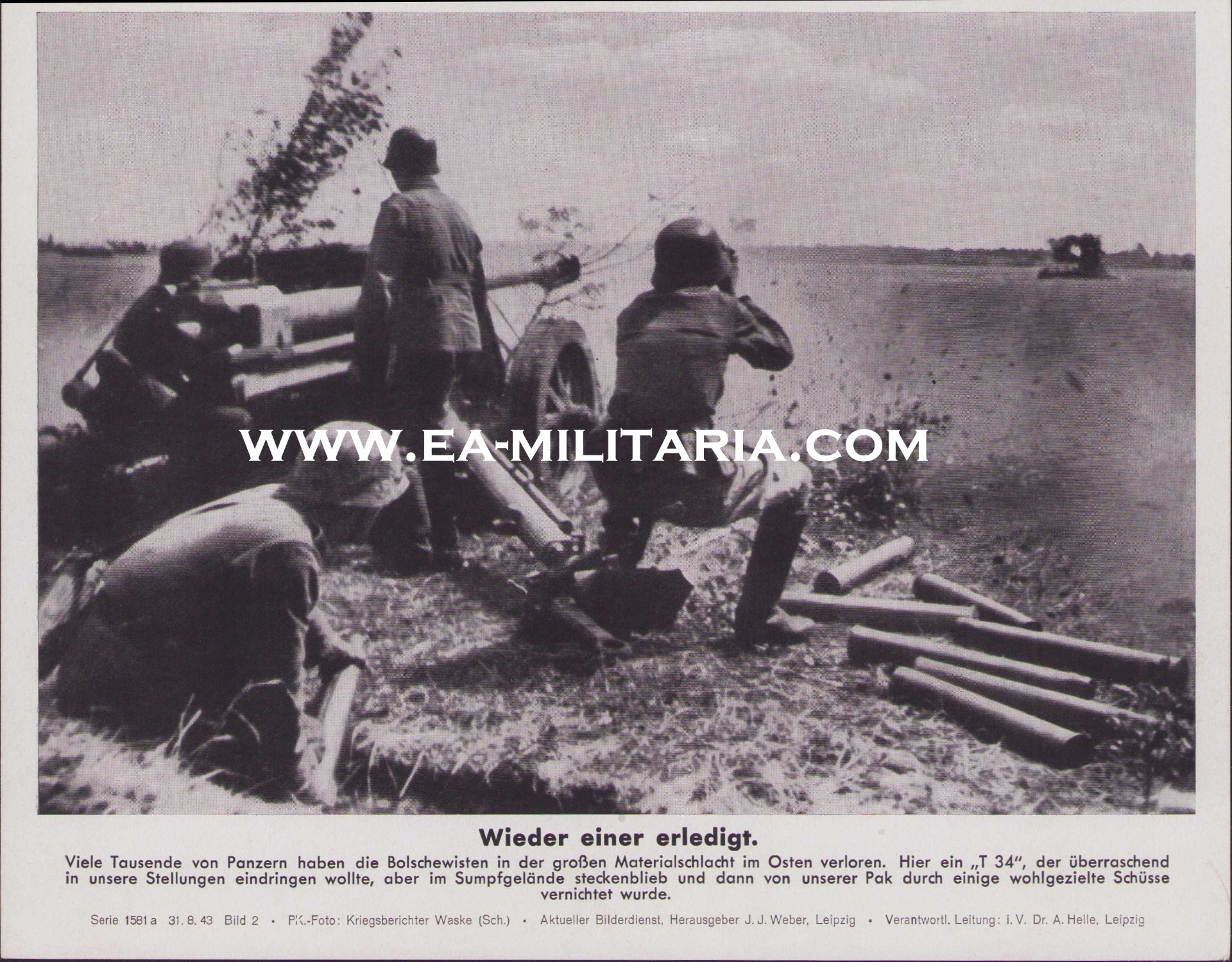 The photo shows overall normal signs of storage wear. Very nice shot a Pak40 gun crew shooting a direct hit to a Russian T34 tank.