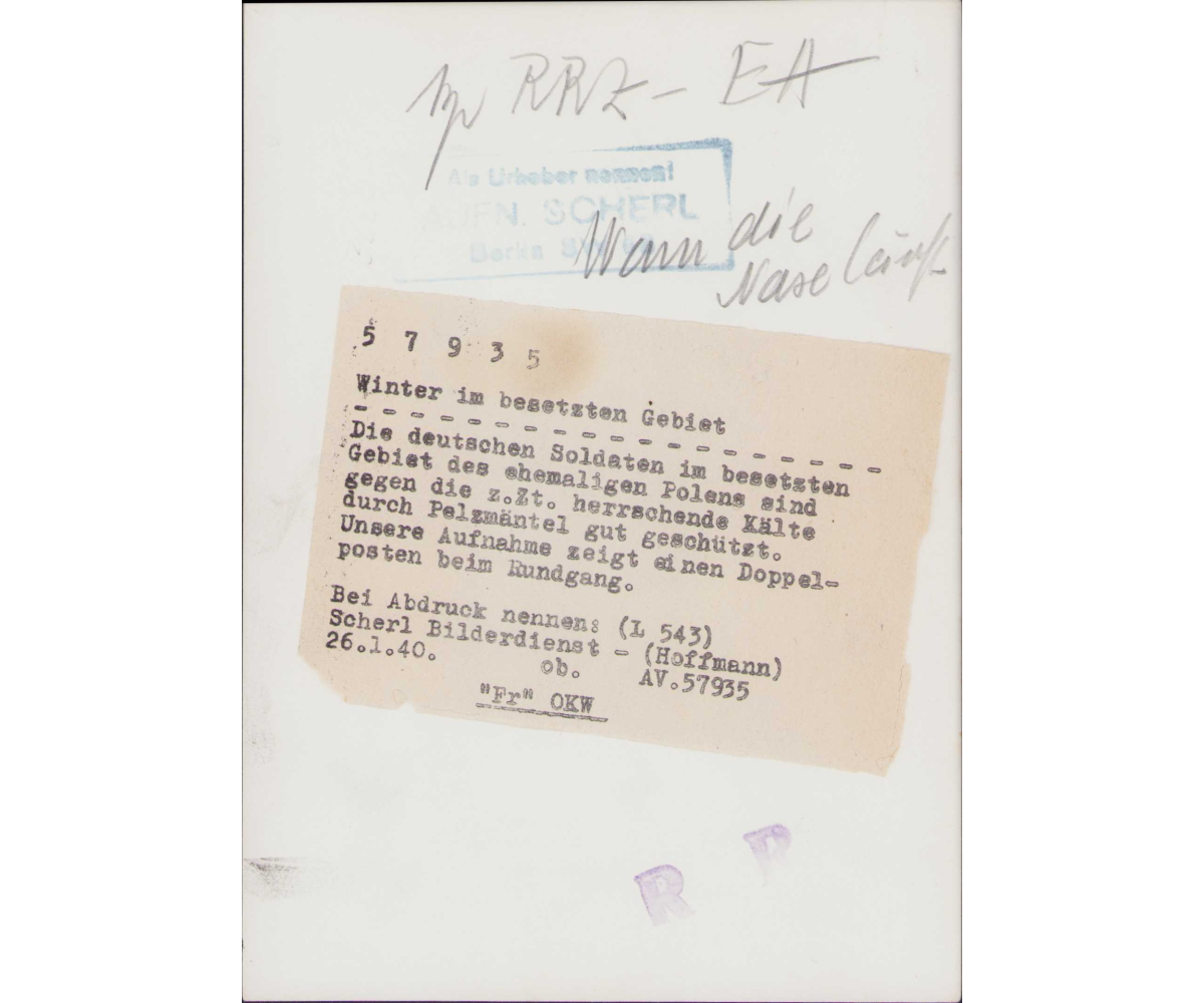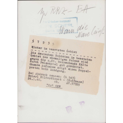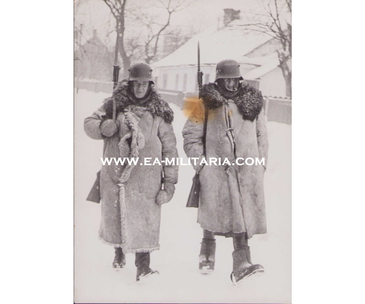 The photograph shows overall normal signs of storage wear. It's complete with paper caption on the back. It show 2 Wehrmacht soldiers walking through the snow somewehre in Poland wearing thick a 'Pelzmäntel' and winterboots. They have their bayonets fixed on their k98 rifle. Note the old style helmet they are wearing.