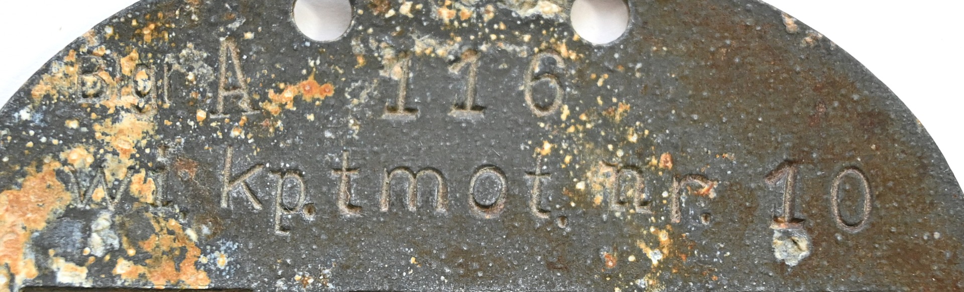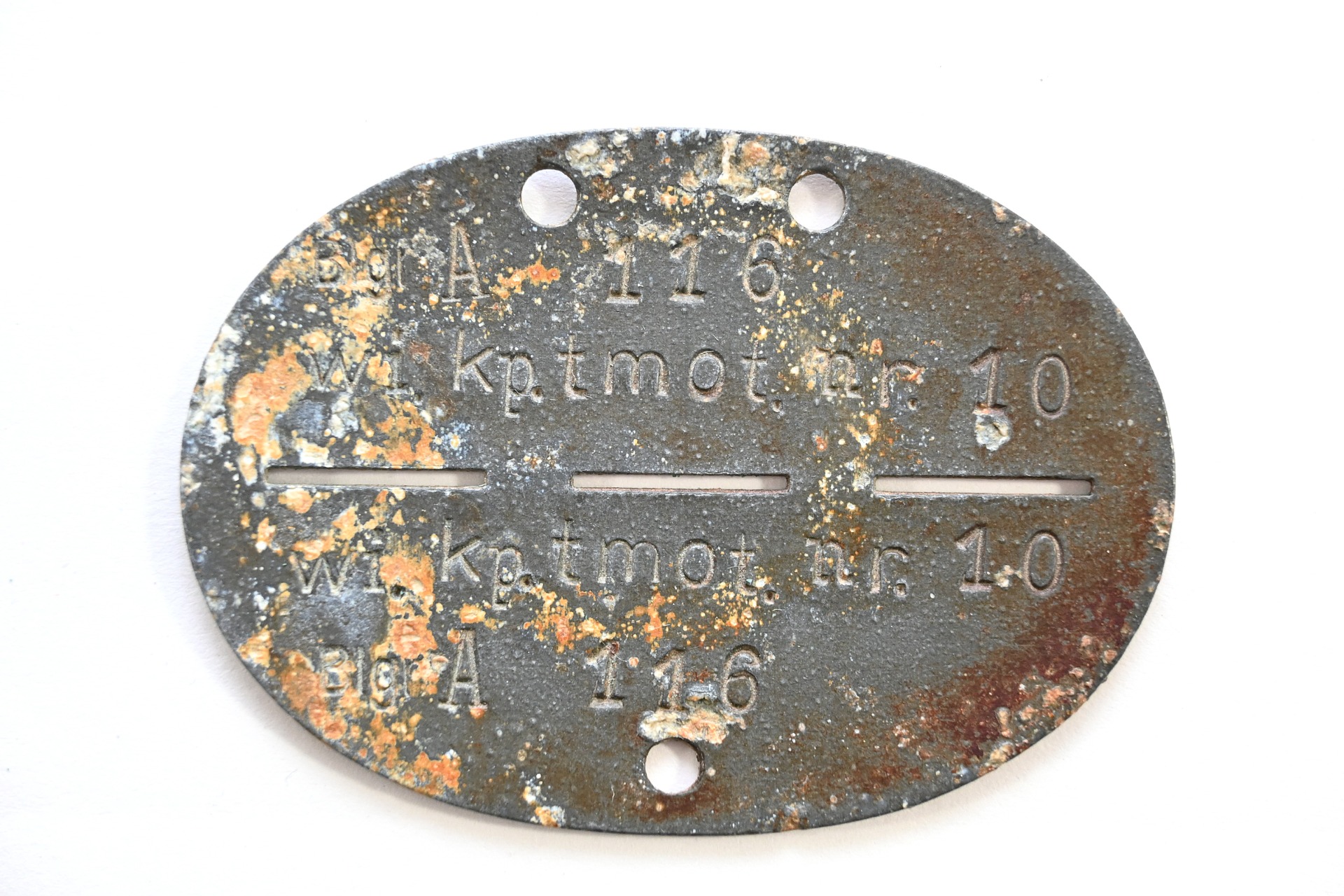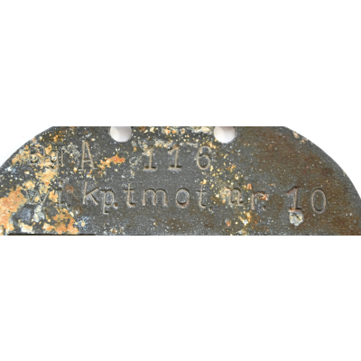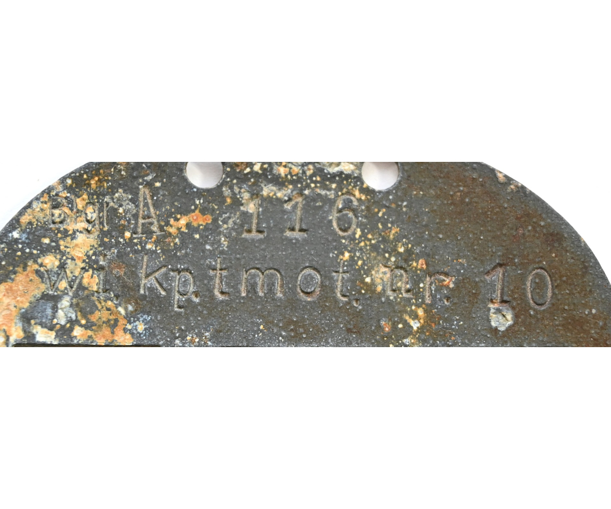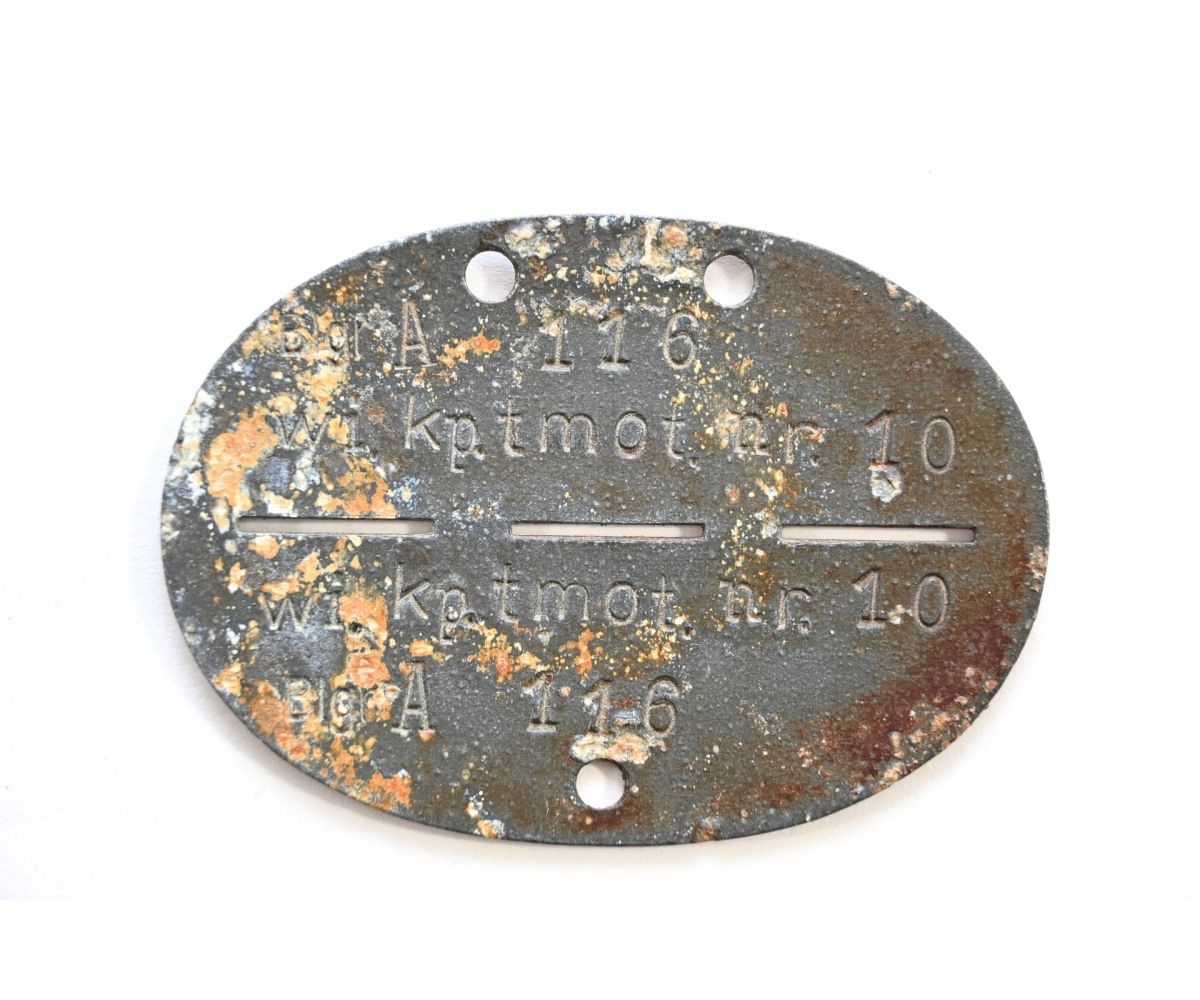 The tag or 'Erkennungsmarke' shows overall normal signs of wear. It belonged to a soldier who served in the Wirtschafts Kompanie teilsmotorisiert 10. We could not find any information on this specific kompanie, however we found out that the Wirtschafts Kompanie tmot 9 operated in France and since this tag was found in Belgium we are certain that this unit also operated in France/Belgium.