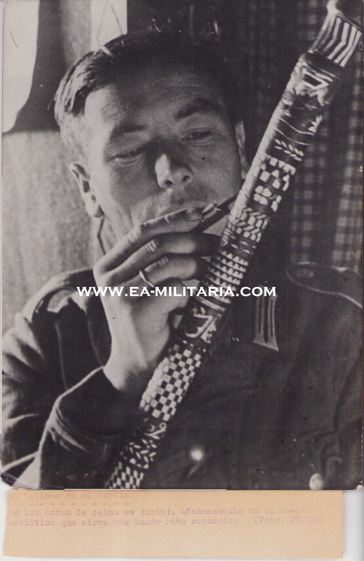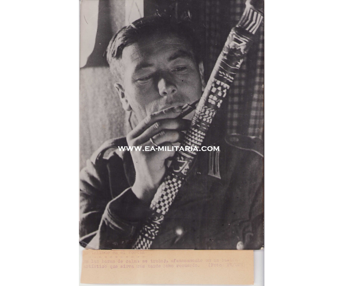 The photograph shows overall normal signs of storage wear. It's complete with (Italian) paper caption on the back. Nice shot of a German soldier handcrafting a so-called Wolchow stick during some free time.
