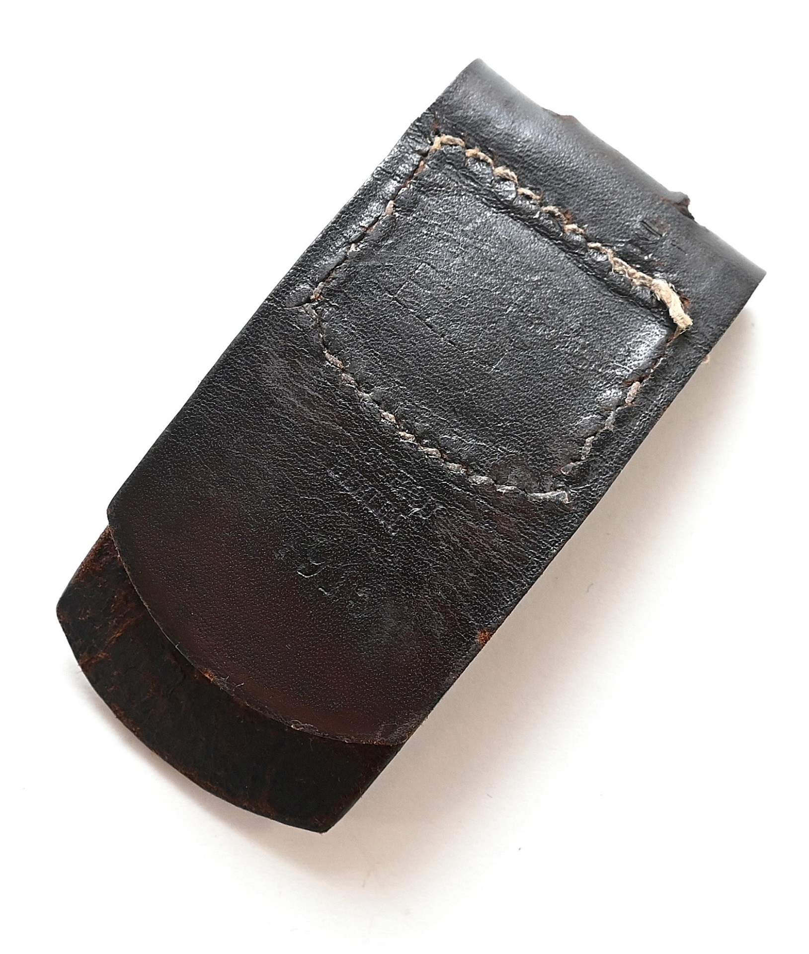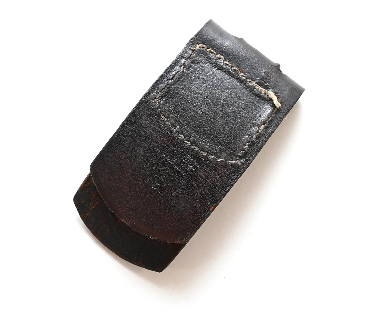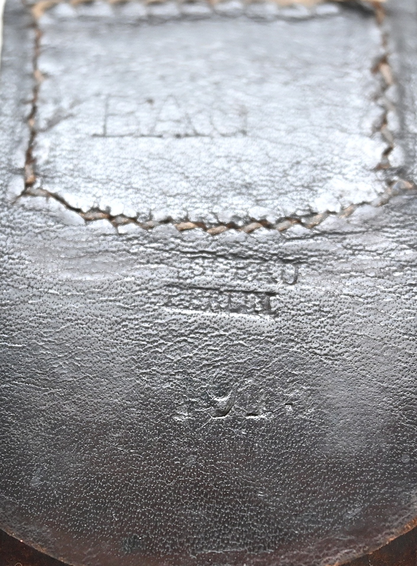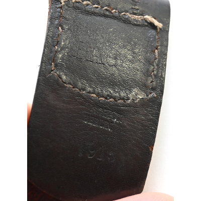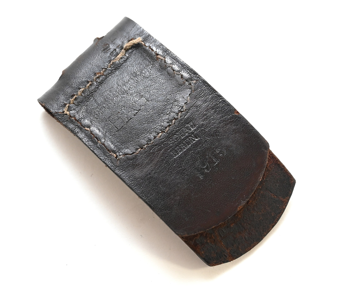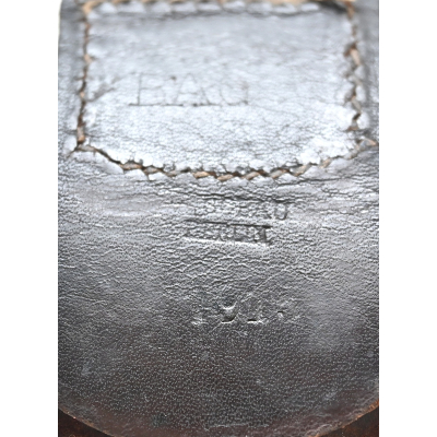 The tab shows overall normal signs of use. The leather is pretty supple and solid. Marked by a maker from Berlin. It's dated 1915.