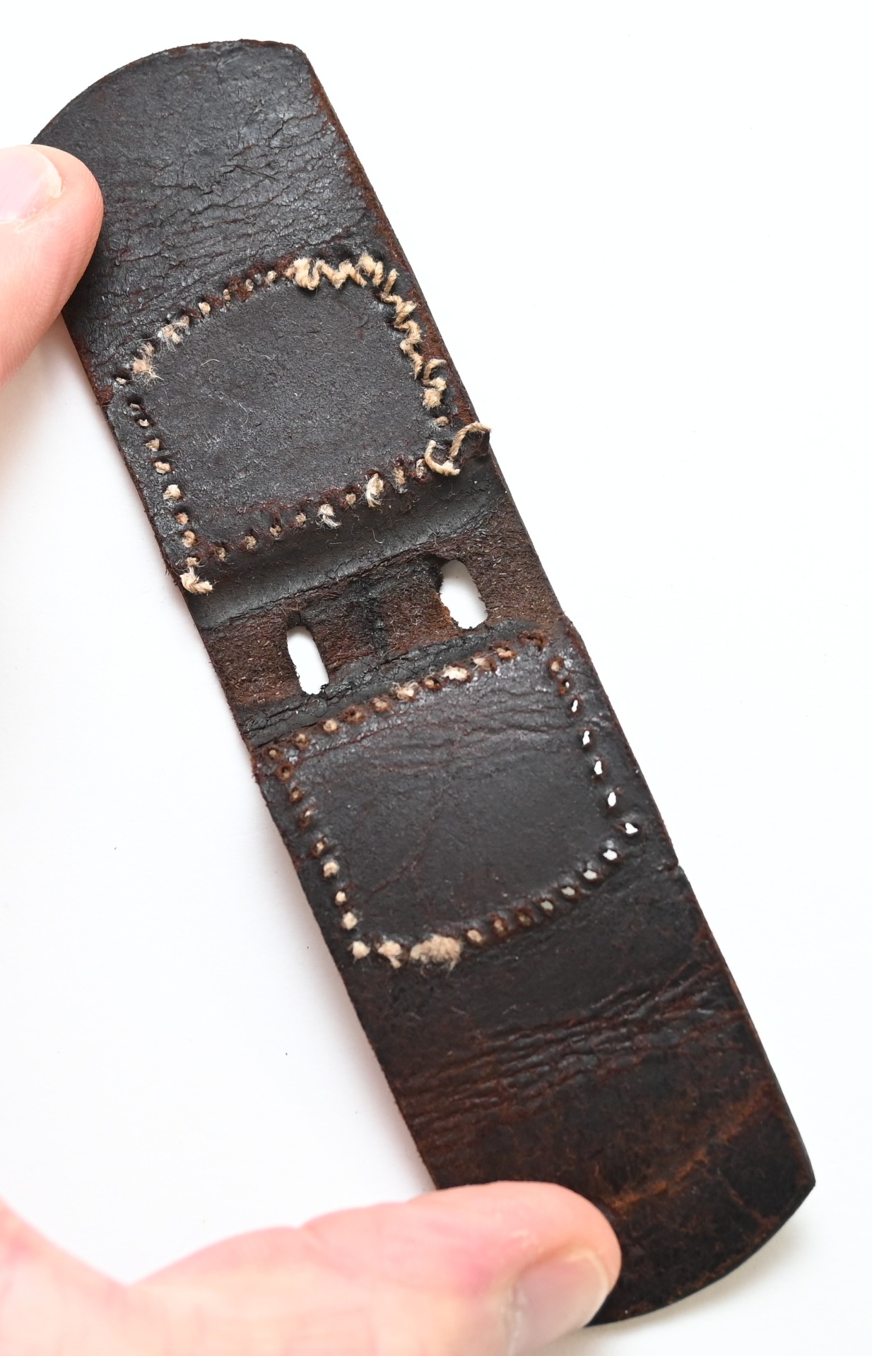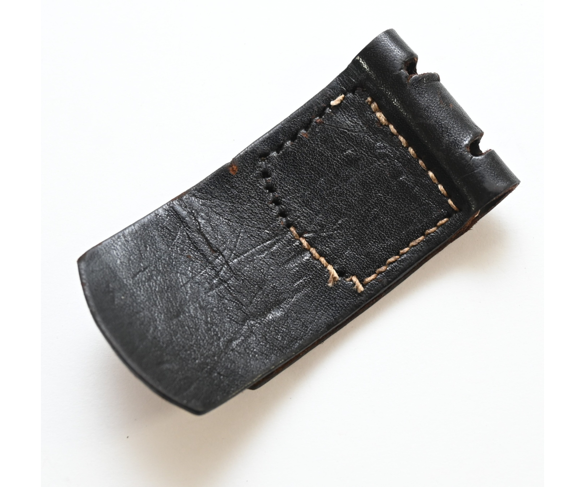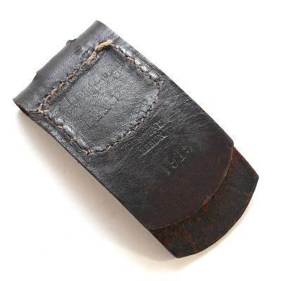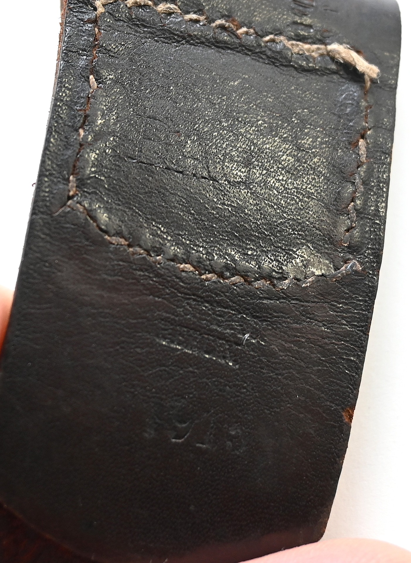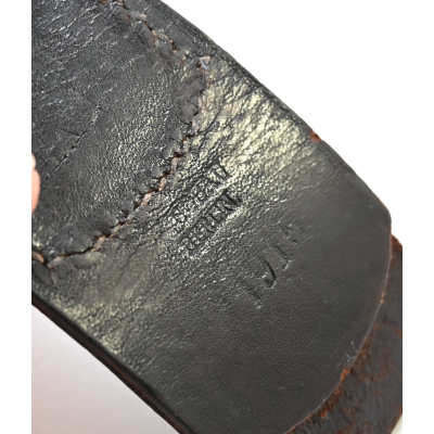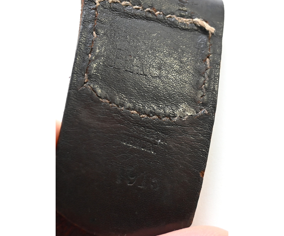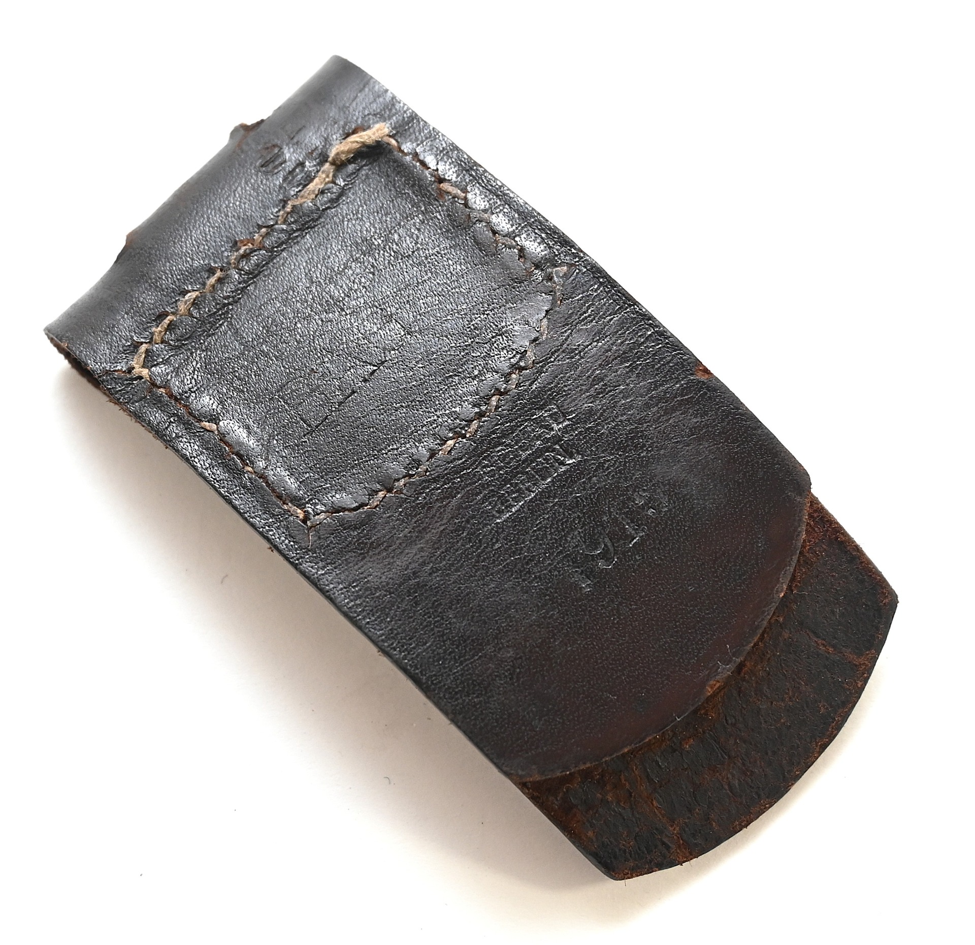 The tab shows overall normal signs of use. The leather is pretty supple and solid. Marked by a maker from Berlin. It's dated 1915.