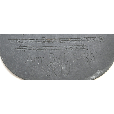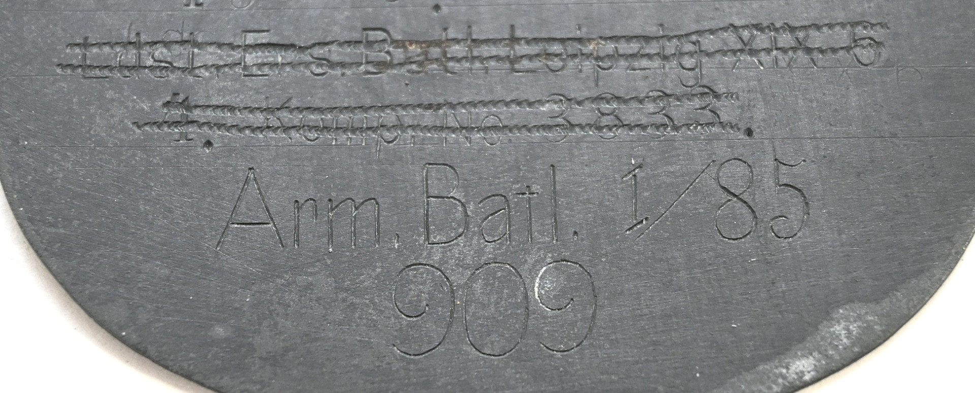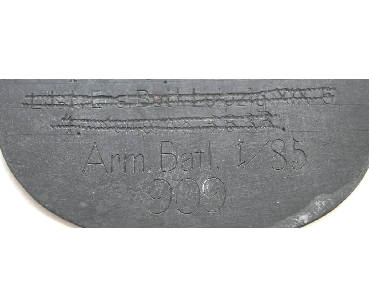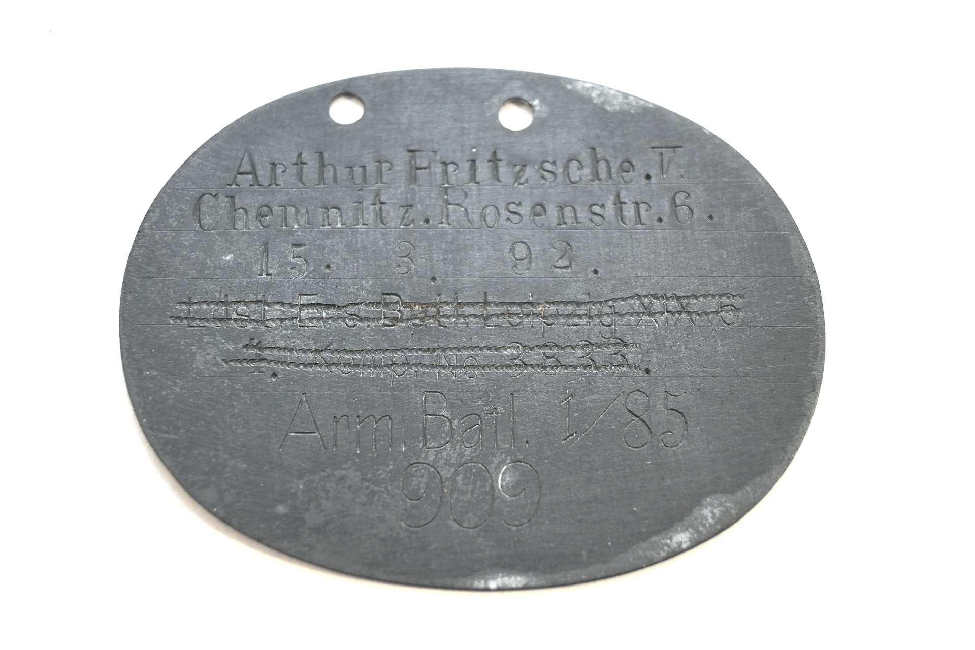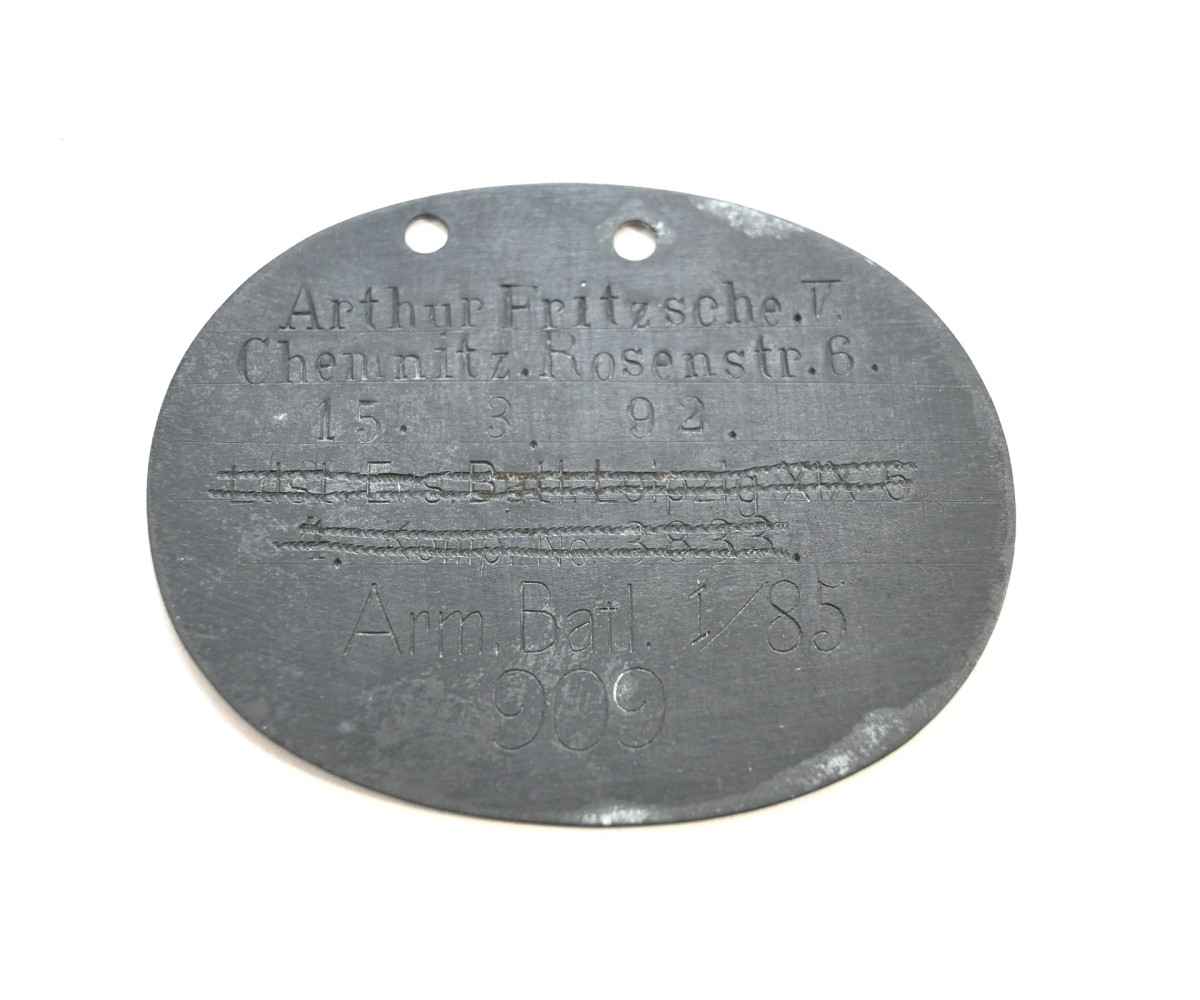 The tag or 'Erkennungsmarke' shows overall normal signs of wear. It belonged to Arthur Fritzsche from Chemnitz. He was born in 1892 so he was 22 years old when the war broke out. He was drafted/served in the 1.Kompanie Landsturm Ersatz Bataillon Lipzig XIX.6. At some point he switched unit to Armierungs Bataillon I/85. This was a construction unit responsible for building fortifications, pillboxes, trenches, roads, (barbed wire) obstacles etc. etc.