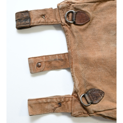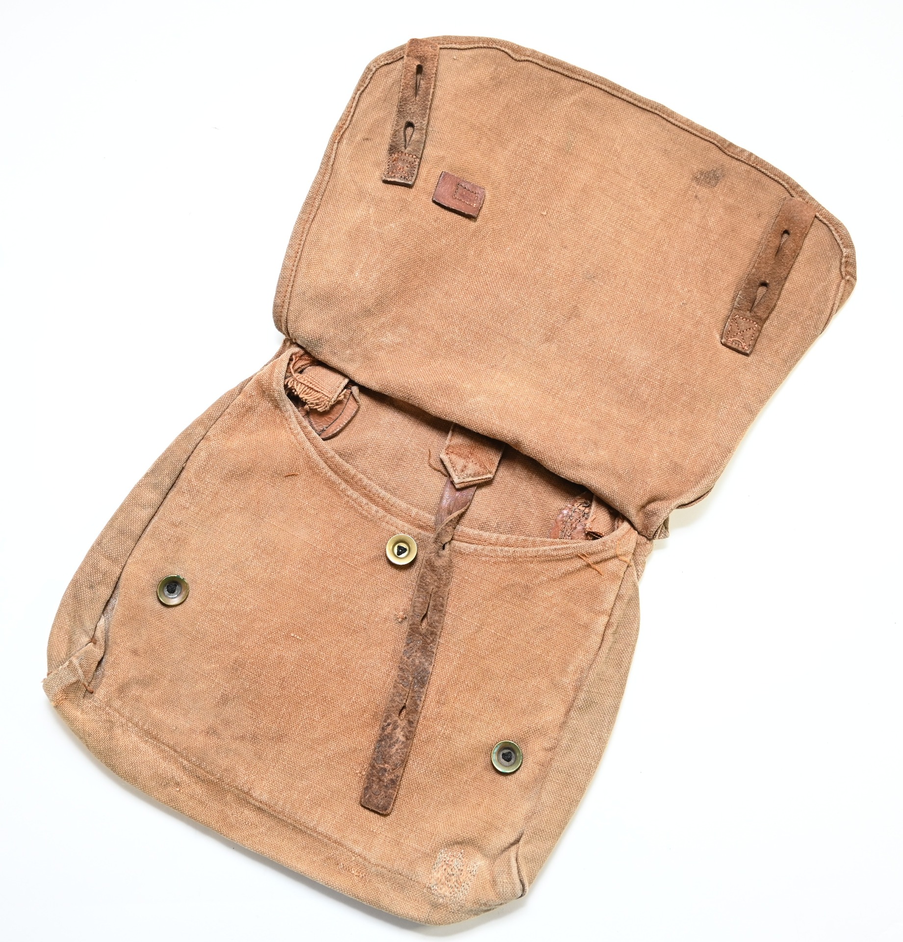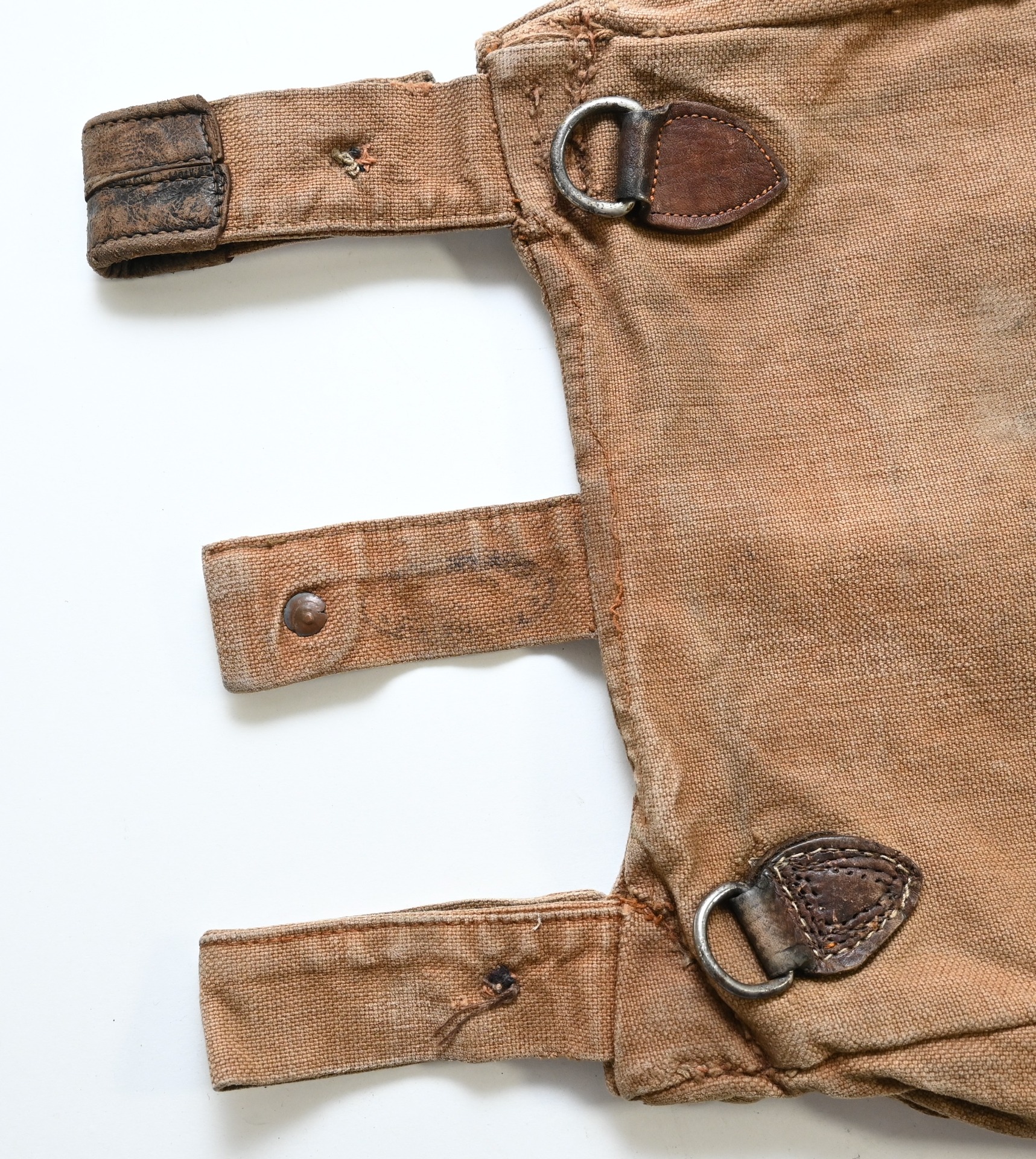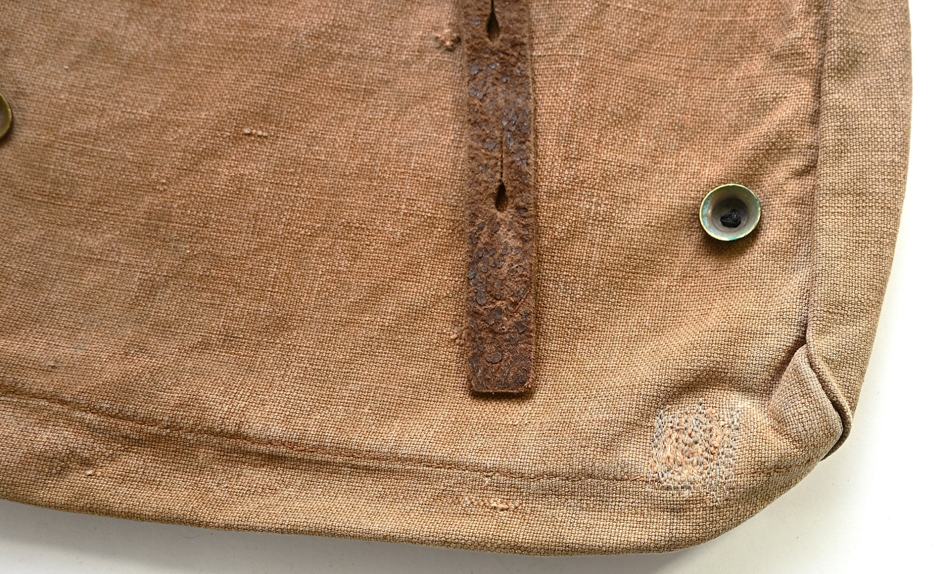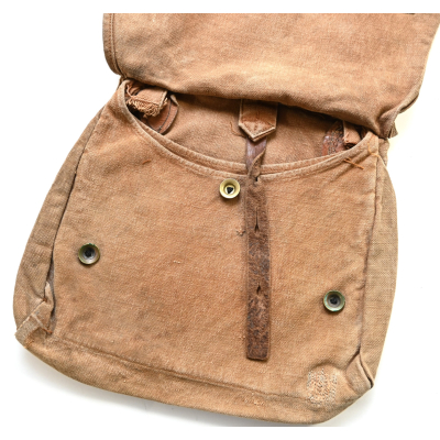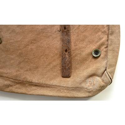 The bag shows overall normal signs of use. All buttons are present 3. All leather straps are present and still supple. Its marked on the belt support strpa, but too vague to figure out what it says. The bag has a small period field repair on the bottom right and on the back a lather piece has been repaired.