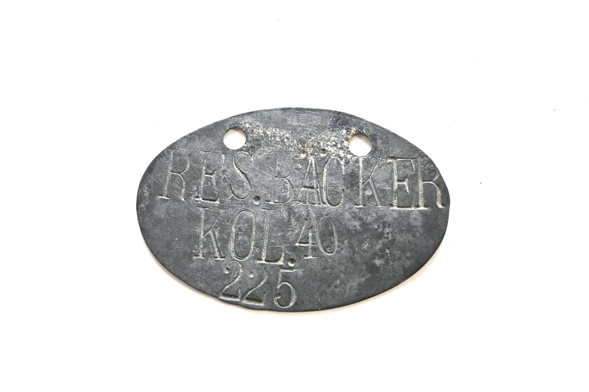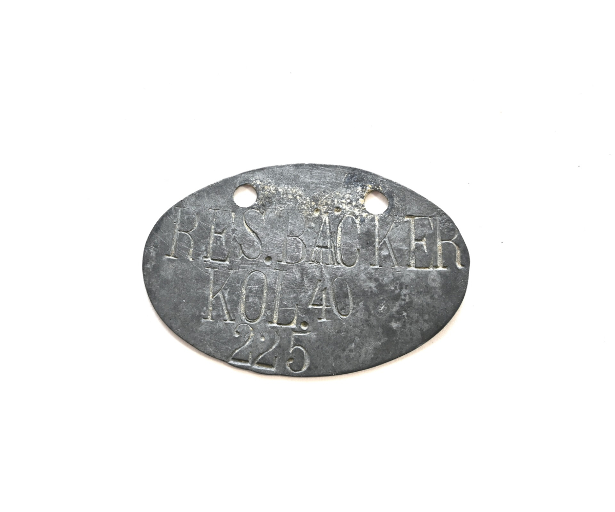 The tag or 'Erkennungsmarke' shows overall normal signs of wear. It belonged to a soldier who served within the Reserve Bäckerei Kolonne 40.