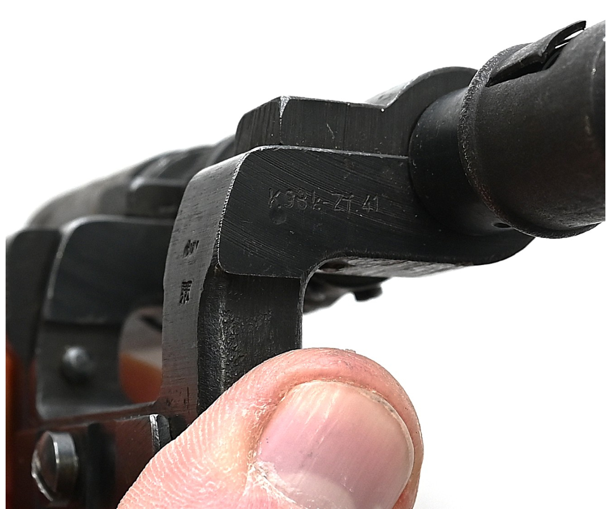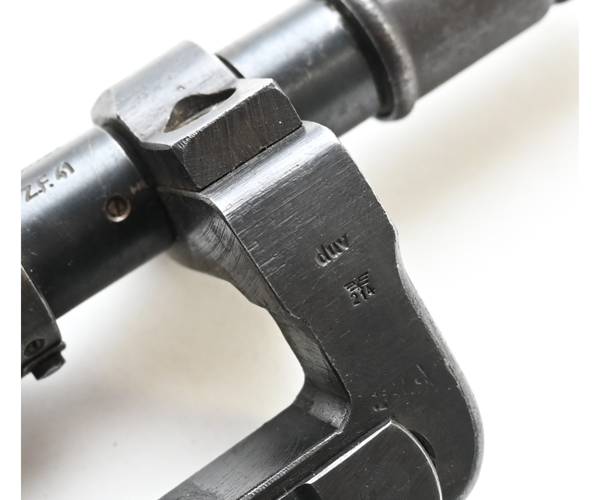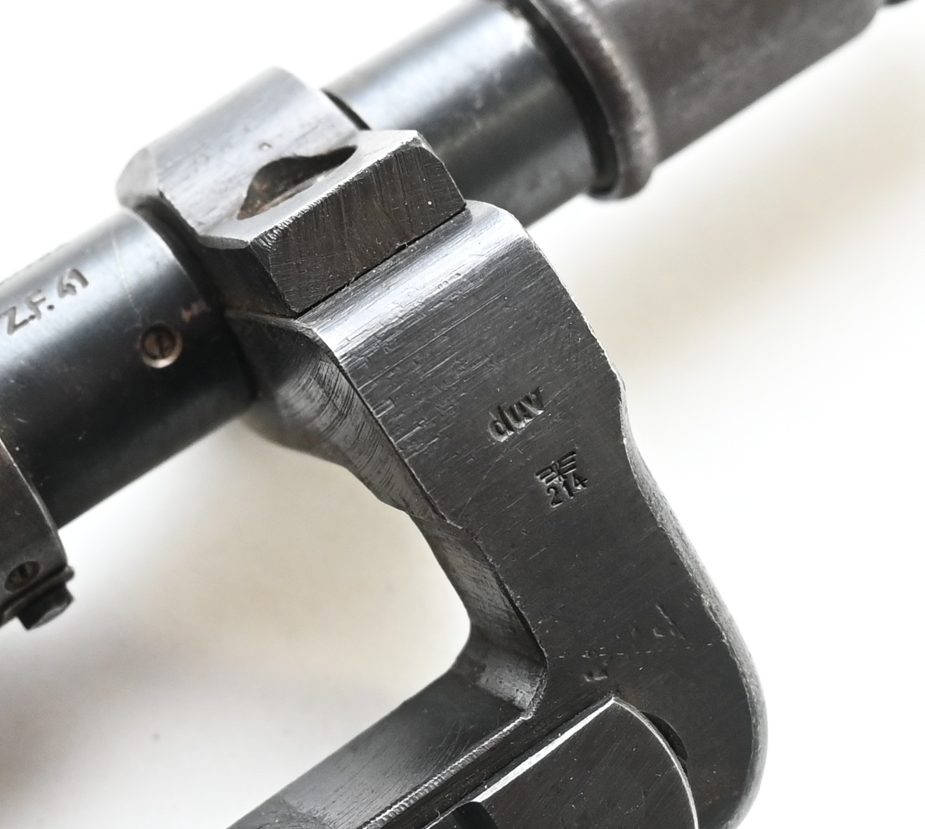 The scope is marked 'Z.F. 41/1', maker marked 'CXN', which means it's produced by 'Emil Busch AG', from 'Rathenow' and number marked '140292'. The mount is maker marked with a three letter code 'duv' which means it's manufactured by 'Berlin-Lübecker Maschinenfabrik' and it has waffentamt inspection stamp '214'. It's also marked 'K98k-Zf.41' on the outside.