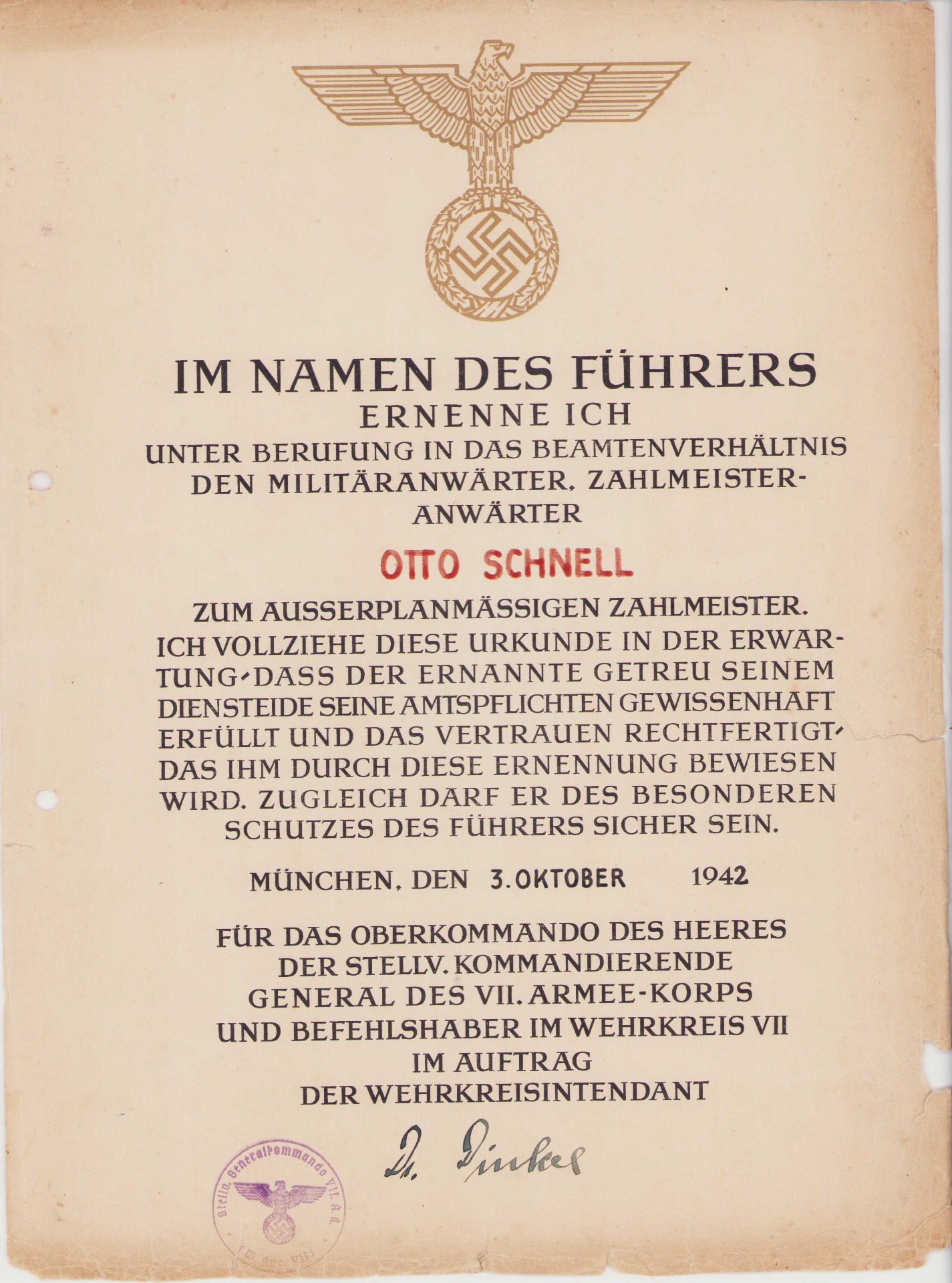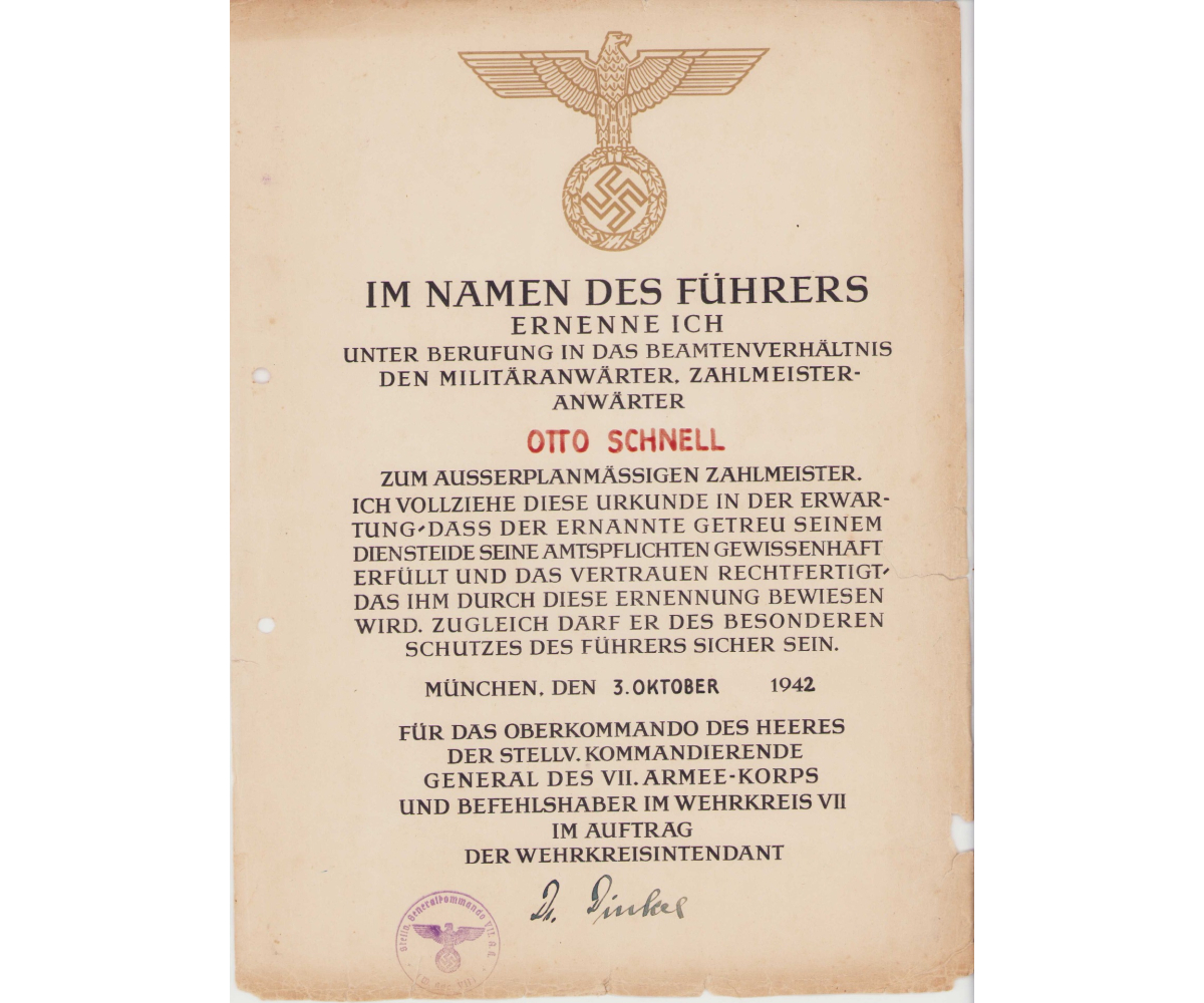 The document shows overall signs of wear. Mainly on the edges. It was awarded to Otto Schnell and is dated 3 October 1942.