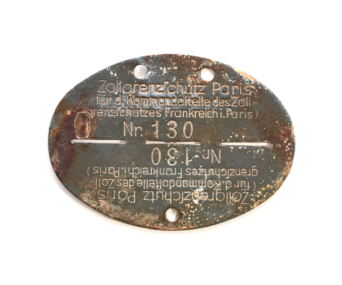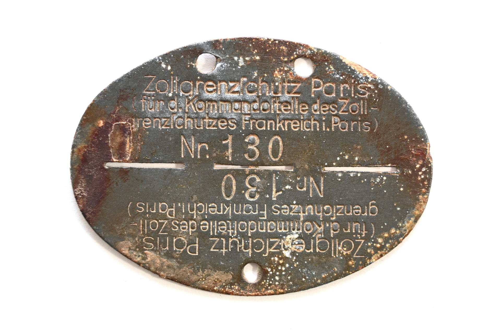 The tag or 'Erkennungsmarke' shows overall normal signs of wear. It belonged to a member orf the Zollgrenzschütz Paris(für d. Kommandostelle des Zollgrenzschutzes Frankreich in Paris.). These where customs Border Guards. They had border patrols and customs & immigration service as their job. In the summer of 1944 this branche fell under the command of the Gestapo.